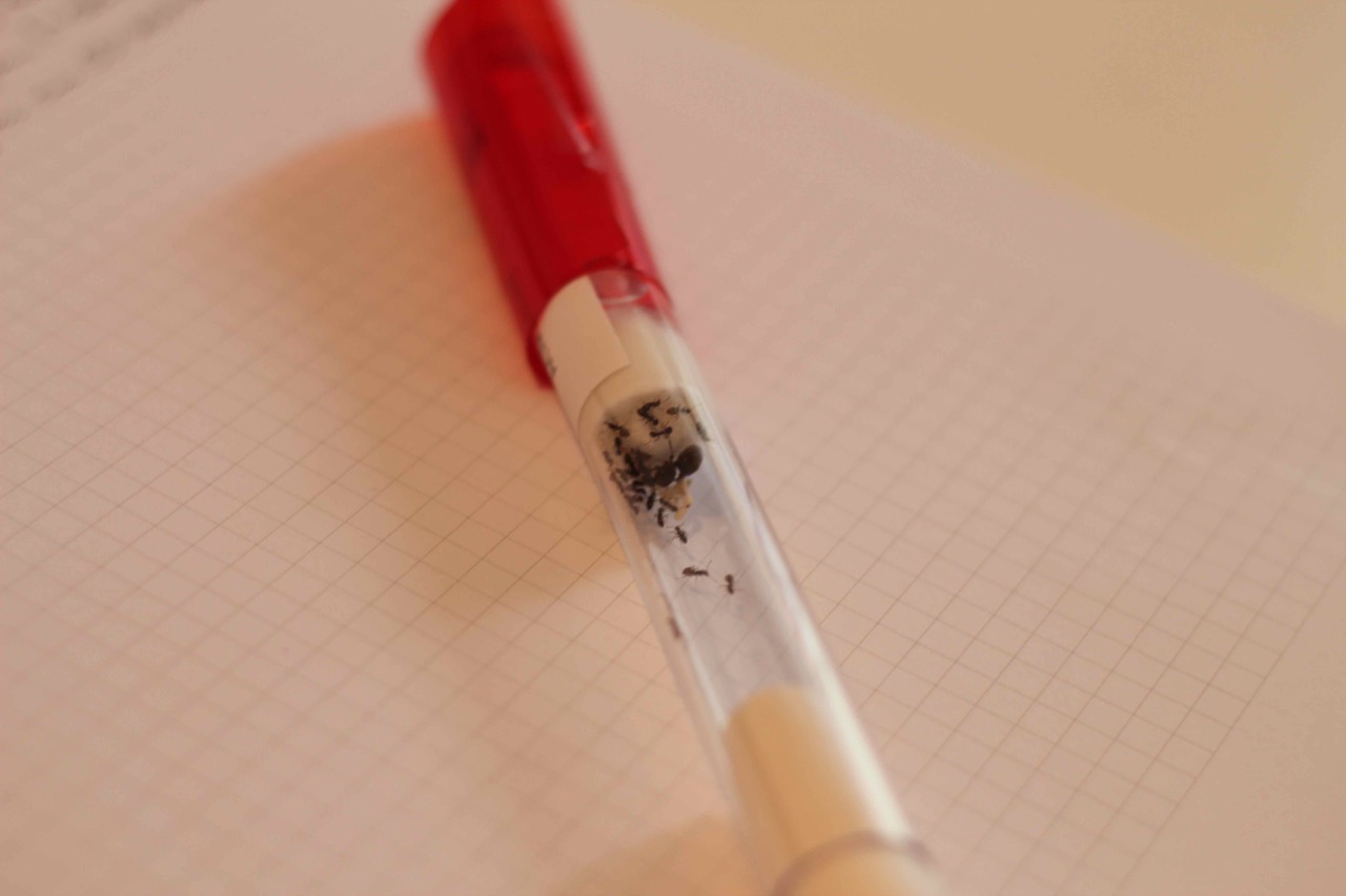 Königin im Reagenzglas. Ab und an streift eine der größeren (kleinen) Arbeiterinnen durch die Arena.