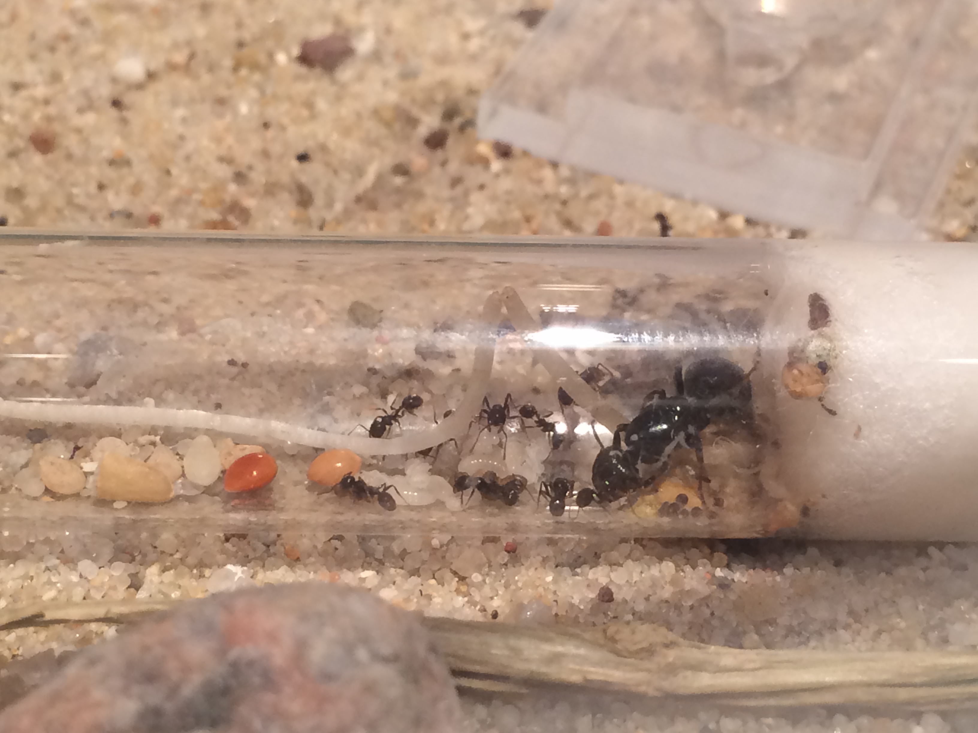 ich habe mir kürzlich ein Starter-Set bei Ameisenkönig gekauft. Eigentlich ein Super Angebot, eine Farm und Arena mit Verbindungsschlauch, Talkum, Körner, Futternapf und Trinkplatz für 57€ und ein Reagenzglas mit einer Messor barbarus Königin, 9 Arbeiterinen und an die 8-10 Eiern...