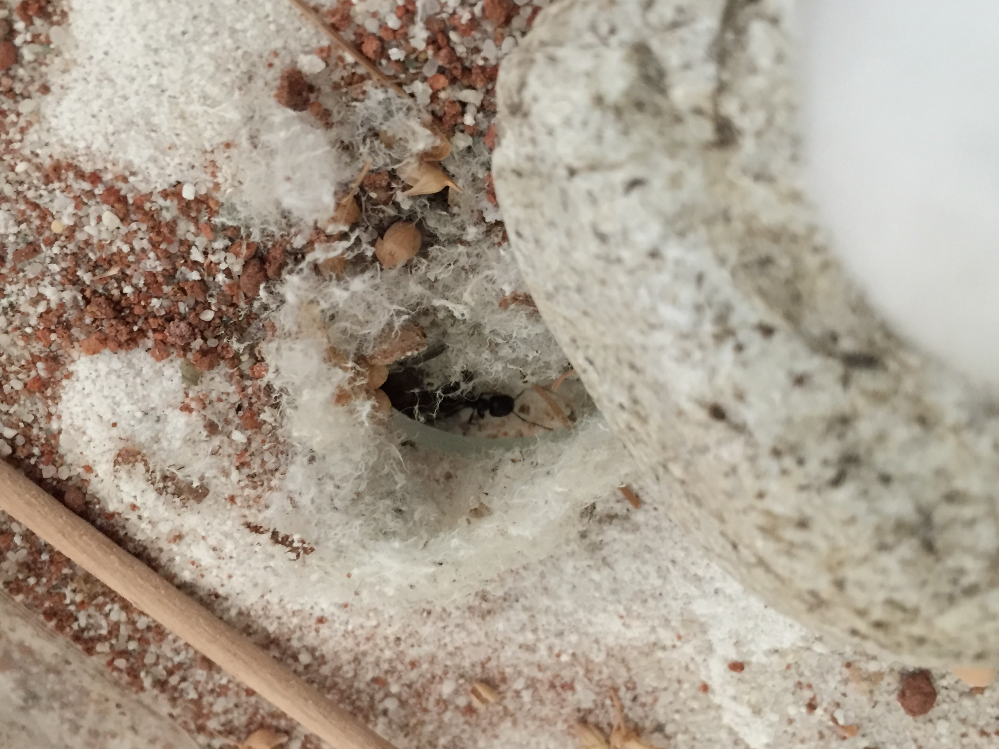 Es kann natürlich auch sein das Messor deshalb zerrupfte Watte so gerne verwendet, weil es sie an Pflanzensamenüberreste erinnert, wie zum Beispiel an den kuschligen Schirmflieger vom Löwenzahn oder dergleichen. Davon liegt nicht nur genug am Abfallhaufen, sondern auch oft ringsherum beim Nesteingang.