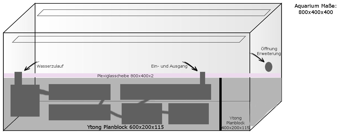 Ich bringe auf die Ytong-Nester eine kleinere Glasplatte an, wie bereits beschrieben. Allerdings nicht wie geplant, Plexiglas. Das Material ist einfach zu weich. Die Glasplatte habe ich bereits in den richtigen Maßen bestellt und erwarte die nächsten Tage die Lieferung. Natürlich bleibt der Raum unter der Platte leer. Sonst könnte ich das Becken später gar nicht mehr bewegen. Außerdem könnte ich dort später noch weitere Nester einsetzen.