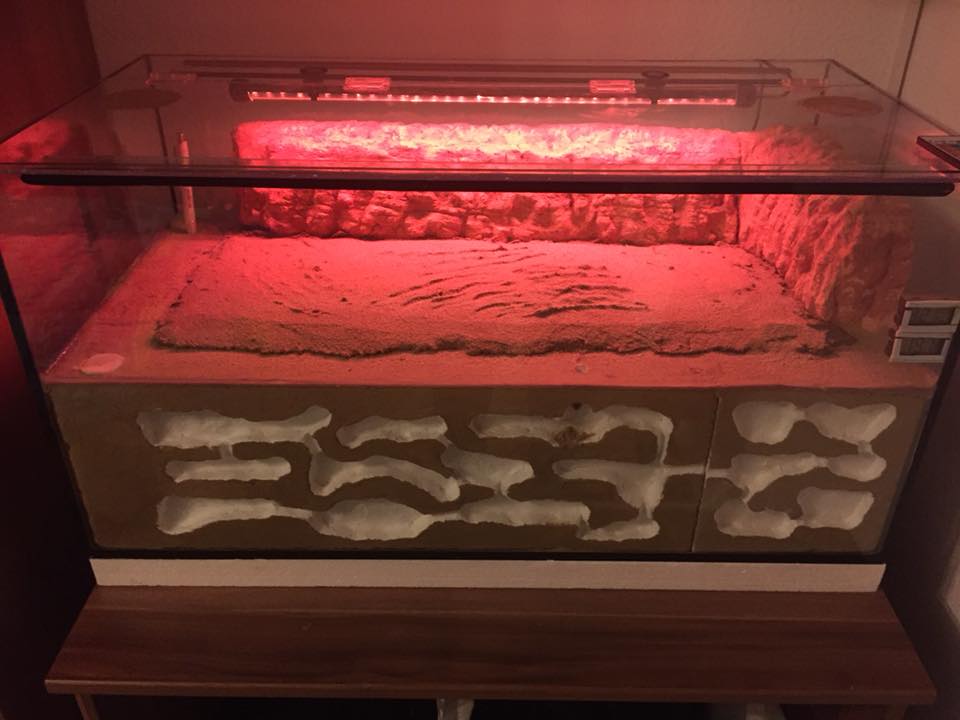 Ok ich gehe davon aus, dass die Öffnung/ Erweiterung erstmal verschlossen bleibt und die Arena, so wie ich es mir gedacht habe, im selben Becken ist. Wie schon geschrieben wäre das machbar, wenn du das ganze Becken im Keller bringen kannst. Als Füllmaterial hinter den Nestblöcken würde ich allerdings von einem Sand-Lehm Gemisch abraten, eine bessere Möglichkeit sich dort einzunisten kannst du den Ameisen kaum bieten. Loser Quarzsand der nicht grabfähig ist wäre meine Wahl oder vielleicht sogar noch besser, gar kein Füllmaterial und die Trennscheibe auf Stützen plazieren.