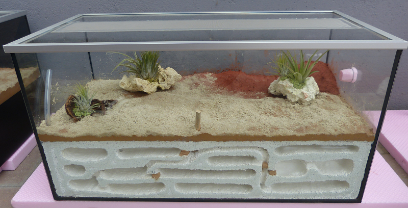 Ich würd ihnen einfach ein abgedunkeltes Reagenzglas in den Arenabereich legen (als Wasserquelle und als Notfallnest falls die Farm zu sehr austrocknet) und nicht versuchen sie großartig am graben zu hindern - das klappt eh nicht. Messor barbarus ist eine Ameisenart die bei größeren Kolonien auch kein Problem hat sämtliches Bodensubstrat aus einer Arena zu schaben und es in einer anderen aufzutürmen um dort Hügel und Gänge zu bauen.