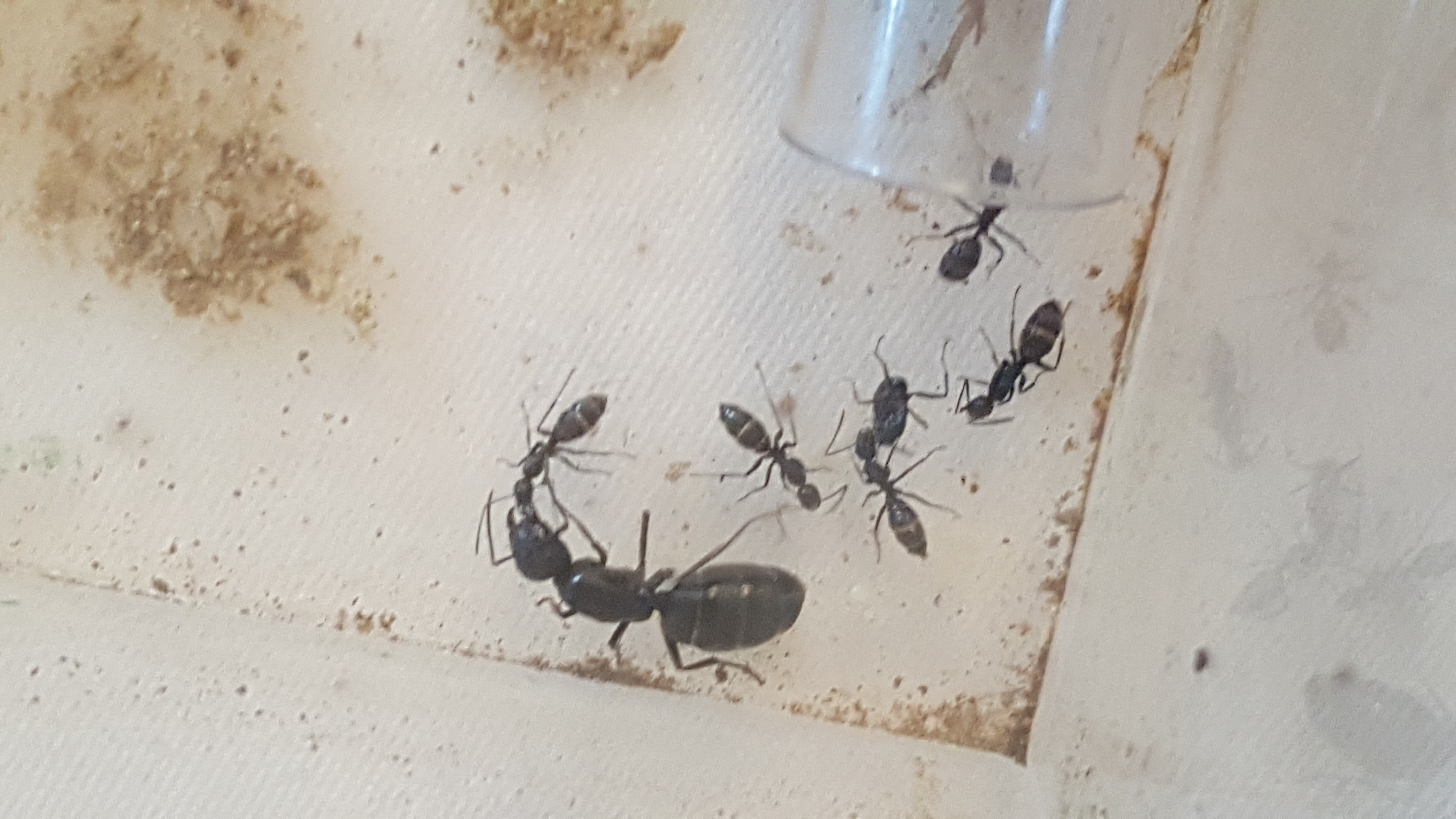 Ich habe diese kleine Camponotus vagus Kolonie gestern erhalten. Auf dem Bild kann man erkennen, dass der Königin am rechten mittleren Bein ein Stück fehlt. Sie erscheint mir sehr träge, aber die Arbeiterinnen kümmern sich um sie und haben auch Nahrung und alles angenommen. Eine Arbeiterin ist gestern verendet weil ihr auch 2 Beine fehlten und die ganze Zeit durch die Gegend gehumpelt ist. Und wie man sehen kann sind sie gerade eben einfach aus dem RG gelaufen und sitzen jetzt dort im Hellen. Ist das normal? Danke schon Mal für die Antworten.