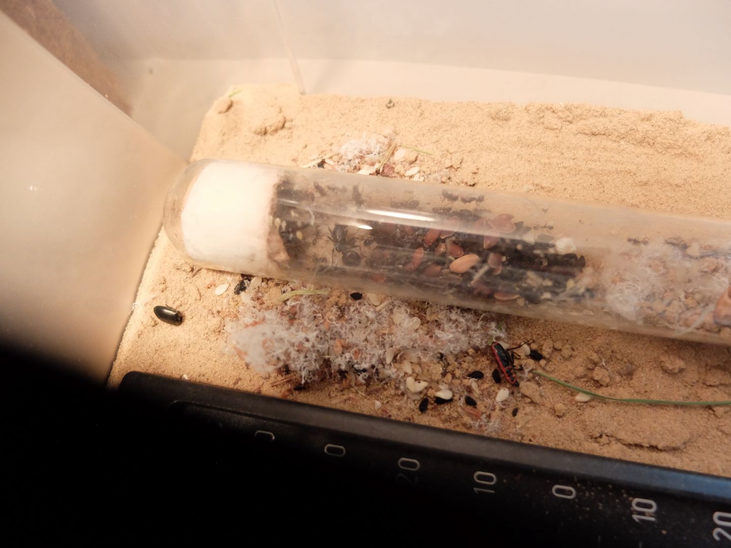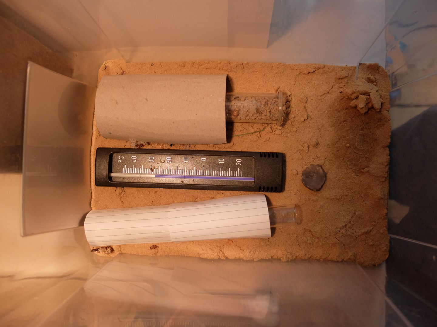 Momentan halte ich sie in einem Reagenzglas in einer Box (15cmx25cm), die ca. einen halben cm. mit Sand-Lehmgemisch gefĂŒllt ist.