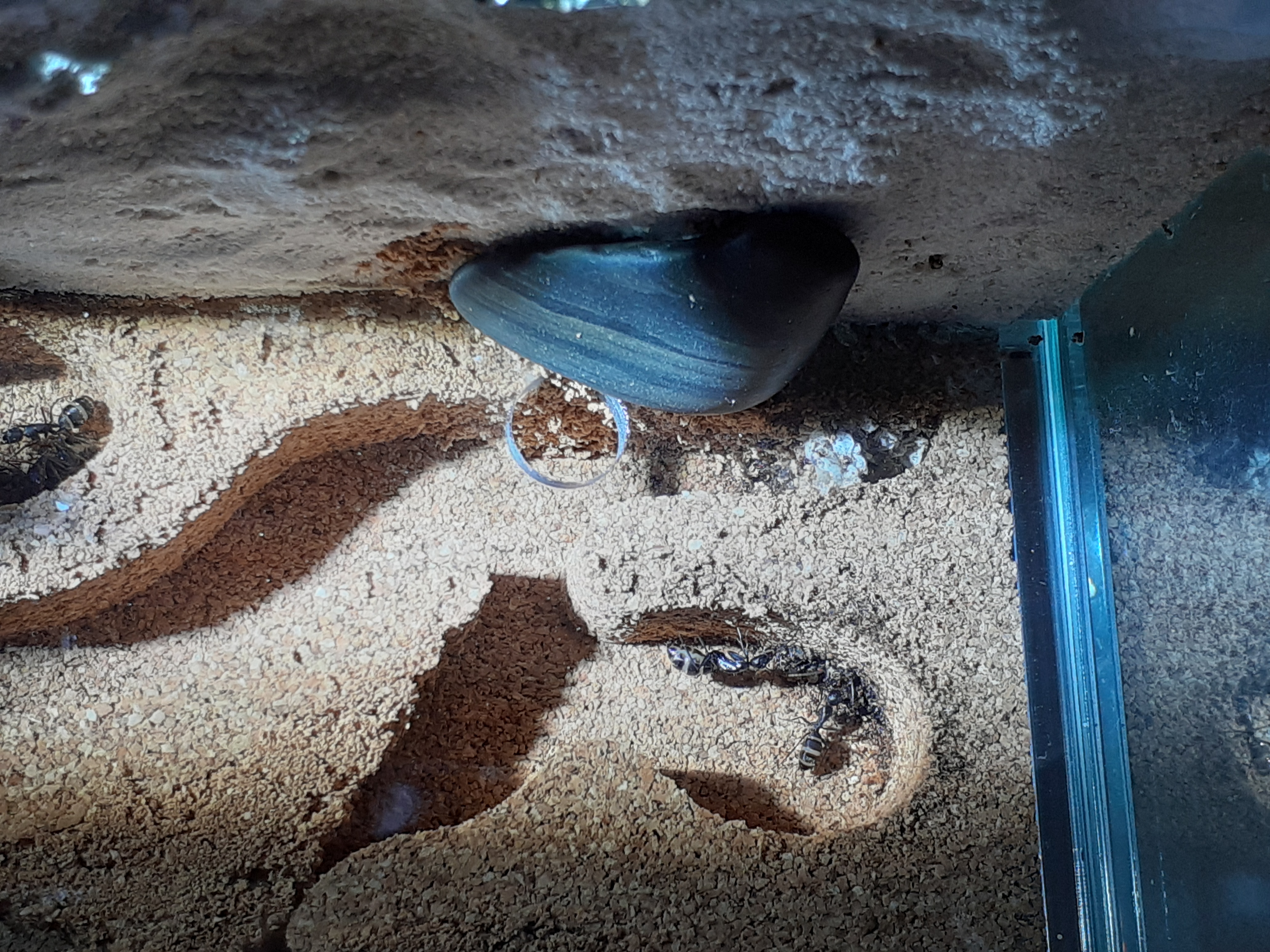 Tatsächlich habe ich ganz am Anfang auch mal versucht, das Nest (stehend, aus Glas) zu befeuchten. Zum einen muss man dafür den Deckel abnehmen, was nur geht, so lange die Kolonie klein ist und oben keine oder zuindest nicht viele Ameisen rumlaufen. Zum anderen gibt es keinen Wassertank oder Kanäle. Das mit der Pipette rein gespritzte Wasser hat sich an der Scheibe seinen Weg nach unten gesucht und ist dabei größtenteils am Kork abgeperlt. Erst unten ist es dann langsam eingezogen. Die Ameisen waren irritiert. Ich habe dann wieder darauf verzichtet.