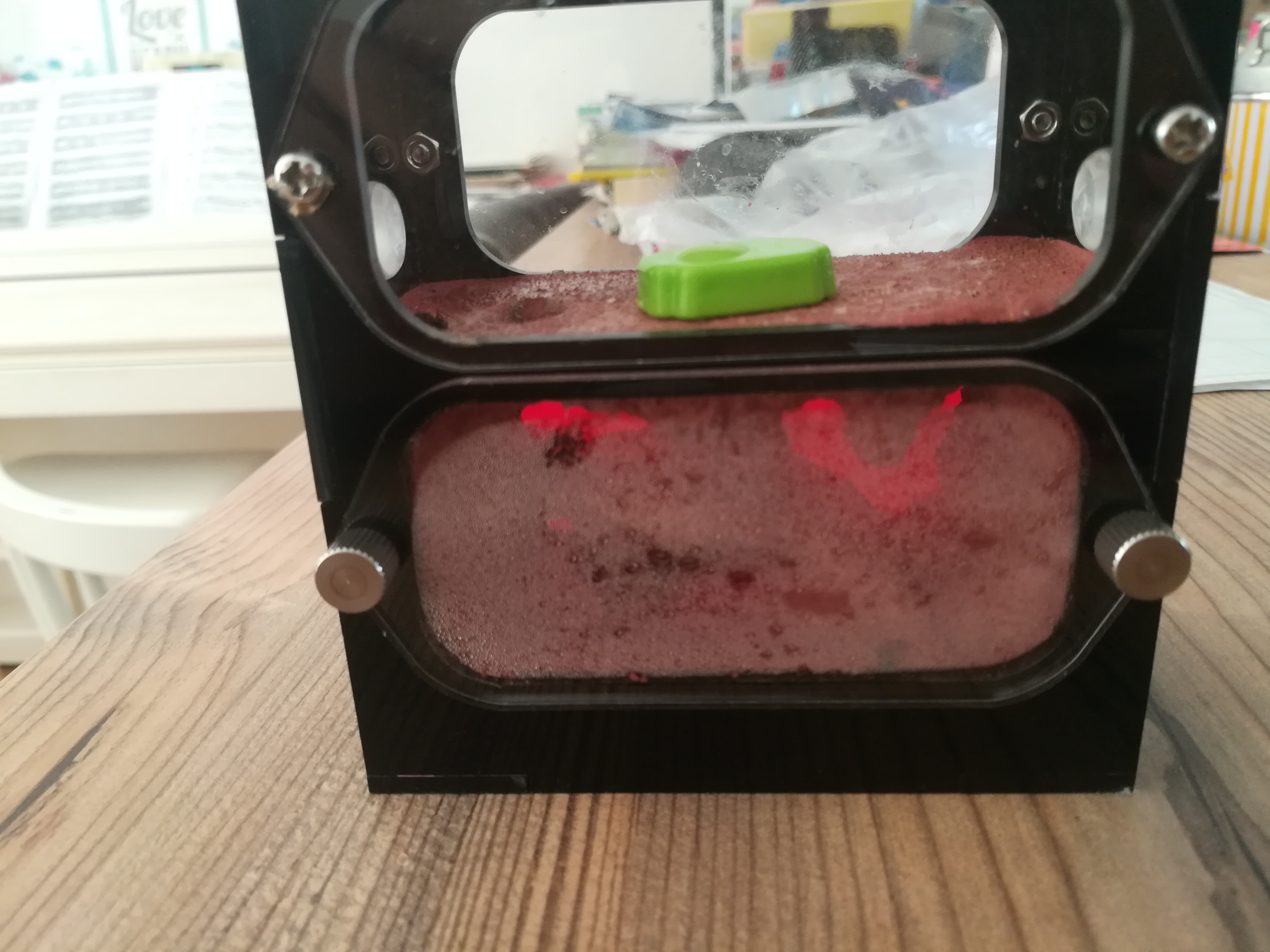 Der Dampf ist da, weil ich das Nest unter die Sonne gestellt hab, um den Schimmel zu töten. Die junge Camponotus herculeanus Kolonie hat jetzt 4-2=2 Arbeiterinnen, Tod unbekannt. Ich hab sie mit Honig, einem toten Termitenpaar( Coptotermes formosanus hat's auch nicht geschafft) , einer wilden,Heuschrecke und einer Fliege.