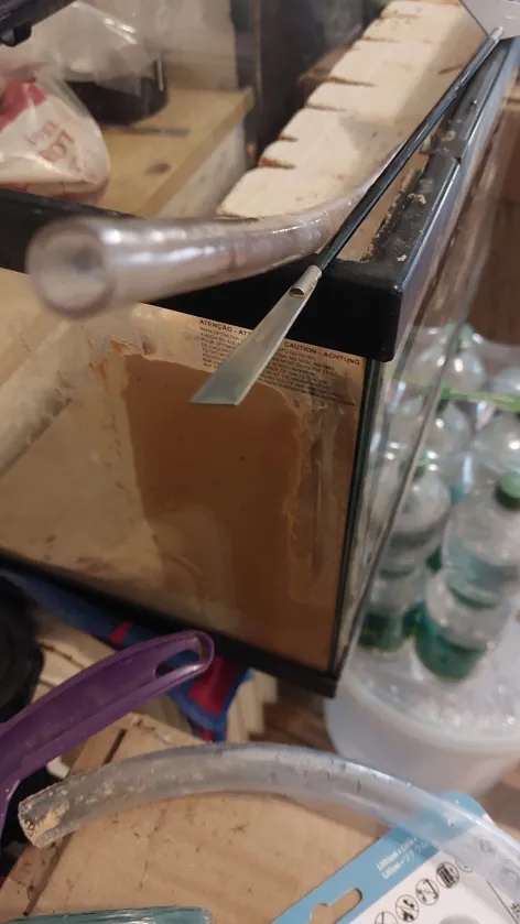 Also bei mir ist der Bimsstein dem Nest angepasst und der 5mm Schlauch steckt IM Bimsstein. So kann ich, wenn erforderlich, den Bimsstein immer wieder neu Befeuchten. Der Schlauch schaut an der Seite des Nestes herraus.