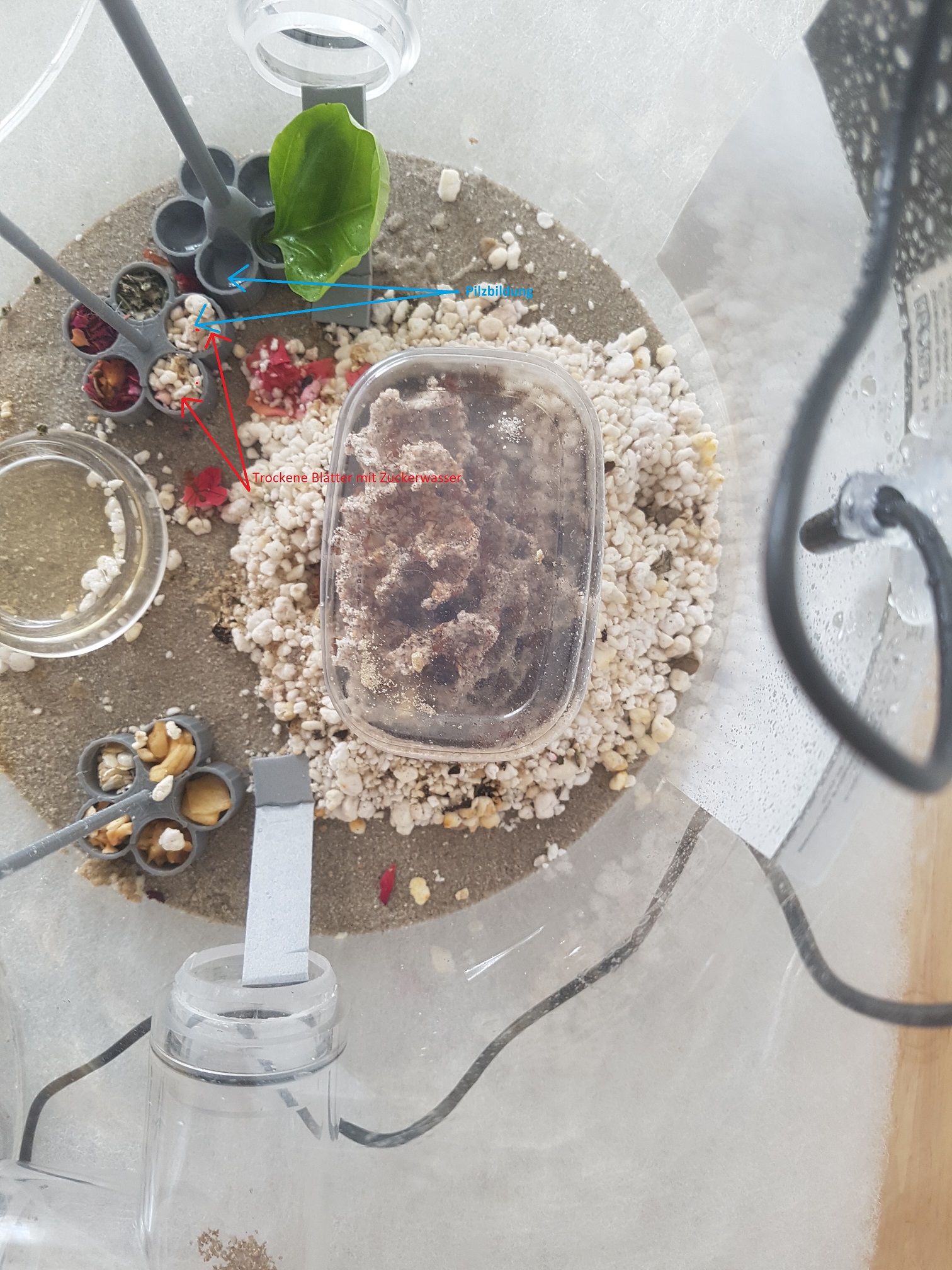 So die Blätter in Zuckerlösung wurden mit Drainagegranulat zugepflastert bis sich wieder ein Pilz gebildet hat.
