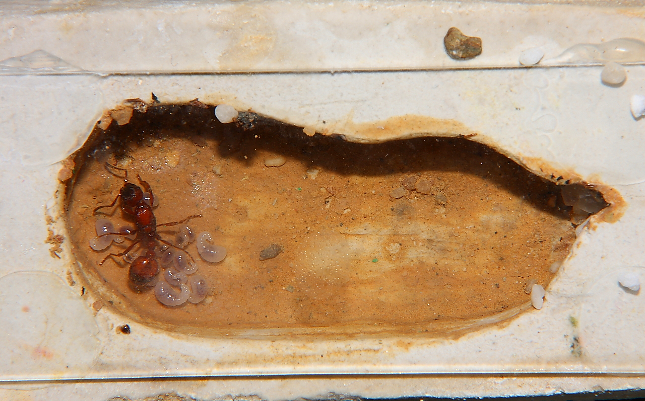 Die Größe der Arena spielt dabei überhaupt keine Rolle, hab meine Camponotus barbaricus mit 4 Arbeiterin im Reagenzglas in ein 60x30cm-Glasbecken gesetzt, das noch heute Kernstück der Anlage ist (Nest wurde später direkt an dieses Becken angeschlossen).