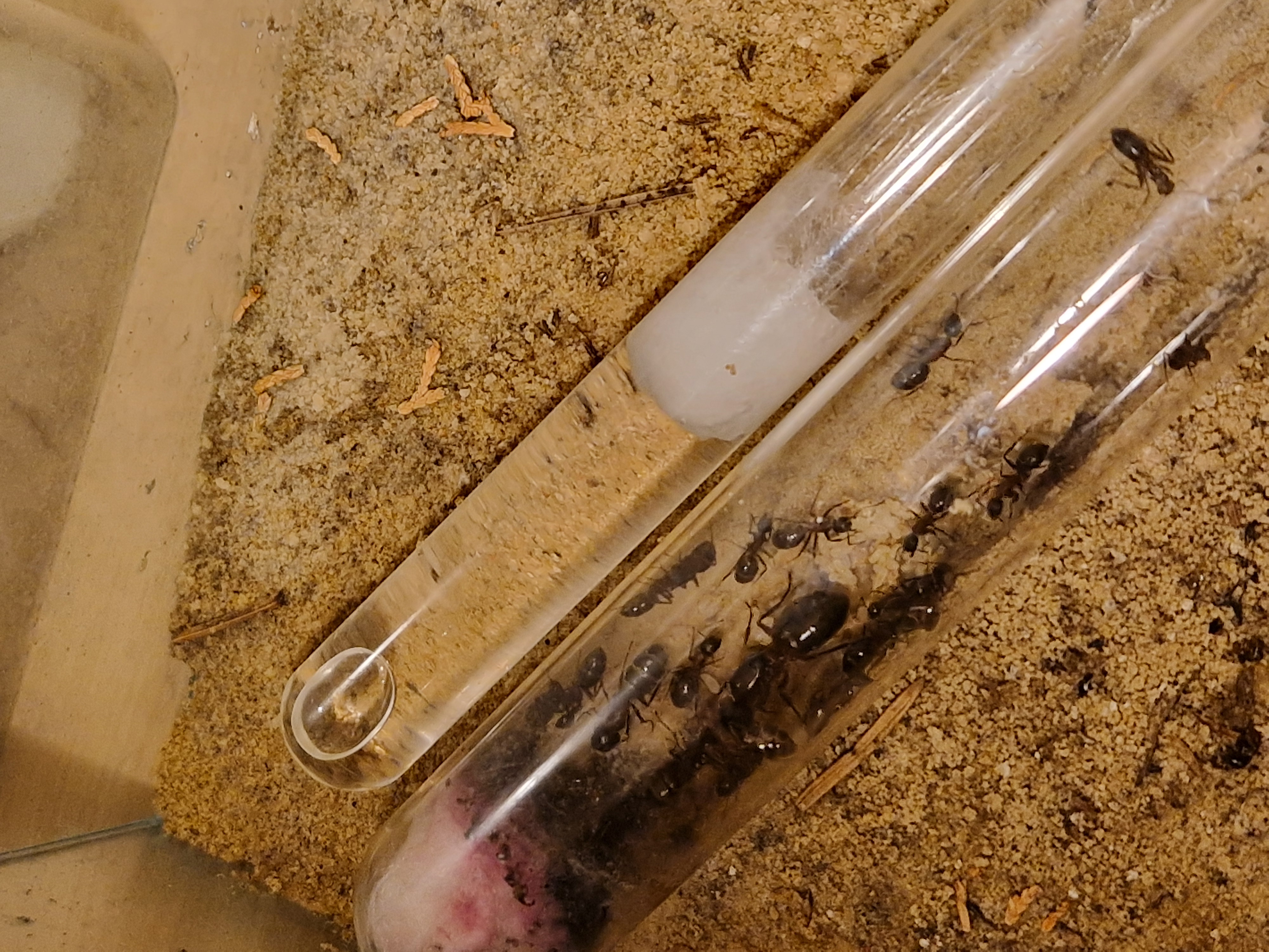 Hab heute leider eine tote ameise zu beklagen. Und hab dann auch gleich mal ins Nest geguckt. Ich hoffe sie können dieses Jahr etwas zulegen. Brut ist ziemlich viel vorhanden und meine Heimchen die ich in 2 Tage Abstand reinlege nehmen sie auch immer sofort an.