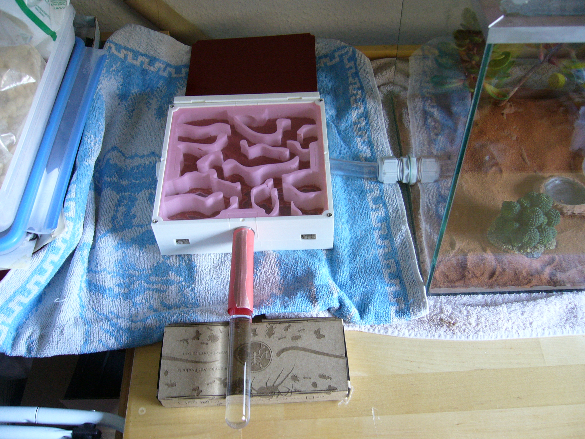 Eine andere Überlegung meinerseits ist es, dass ich doch rein theoretisch für die ersten paar Monate nichtmal ein Nest brauche? Wenn ich das Reagenzglas offen in das fertig eingerichtete Formicarium stelle, sollten die Ameisen das Reagenzglas für die erste Zeit erstmal als Nest nutzen, oder? Danach kann ich dann das Nest irgendwann an die Arena anschließen und auf einen Umzug warten