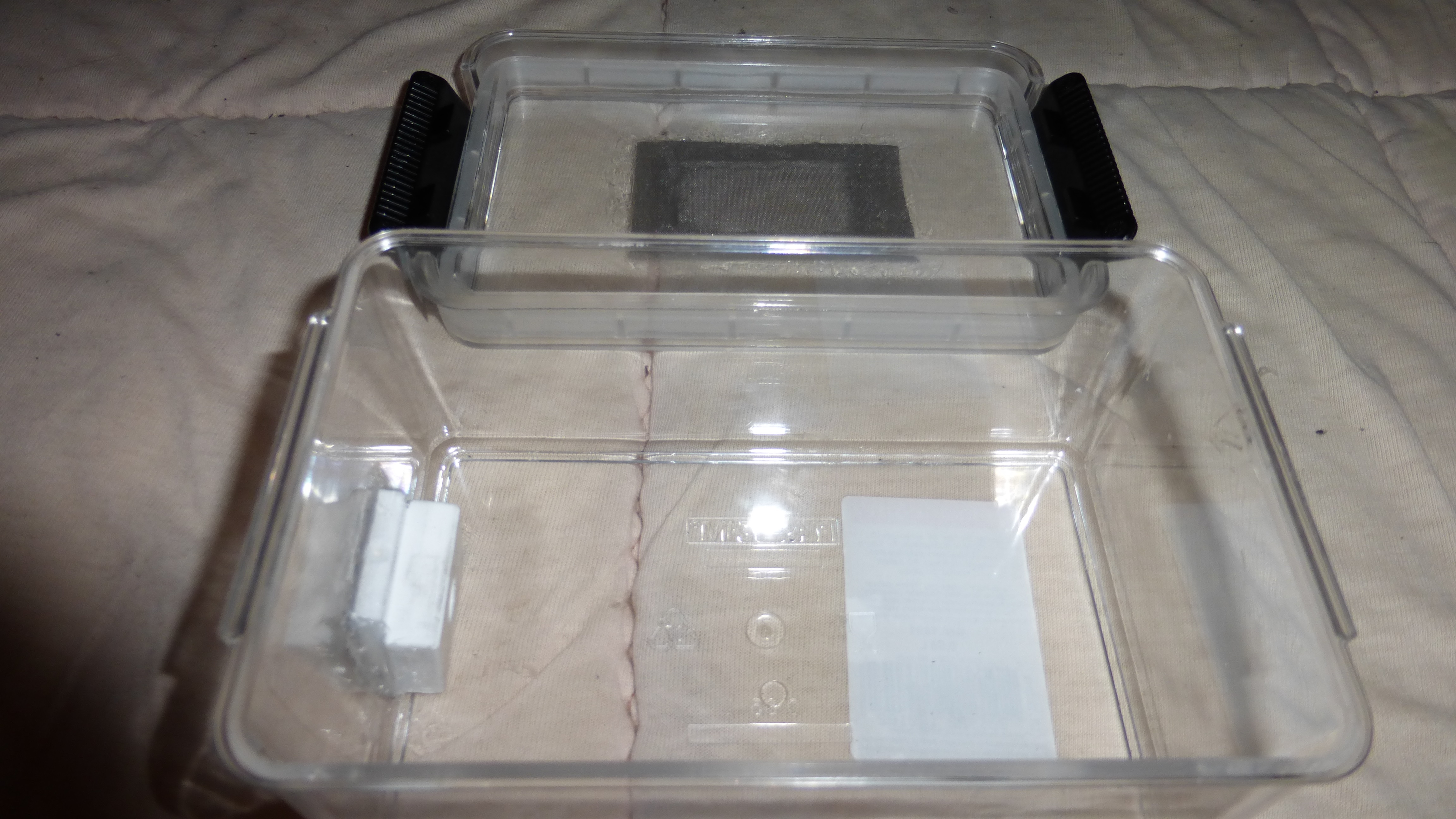 Beim Deckel bin ich mir jetzt auch nicht mehr so sicher ob ich das richtig mache. Ich wollte eigentlich nur diesen Gittereinsatz einbauen. Wenn die Kolonie aber mal größer ist kann ich wohl den Deckel nicht jedes mal runter nehmen. Da muss ich mir dann was einfallen lassen.
