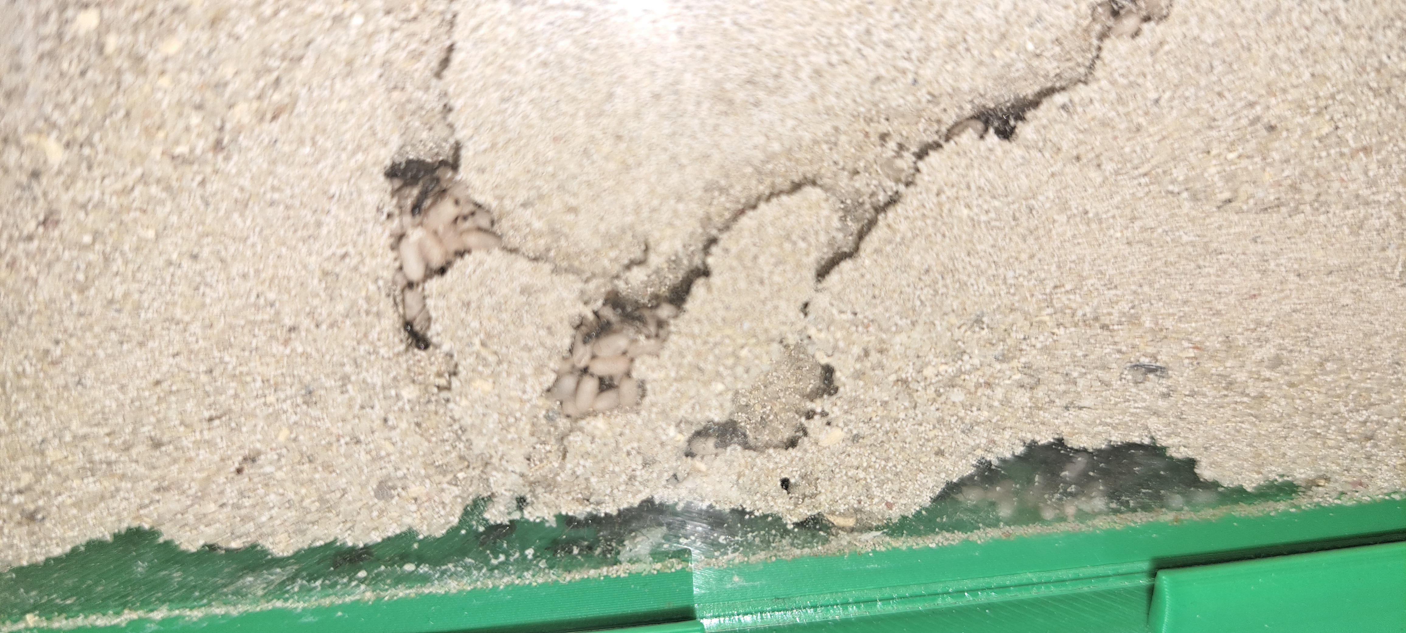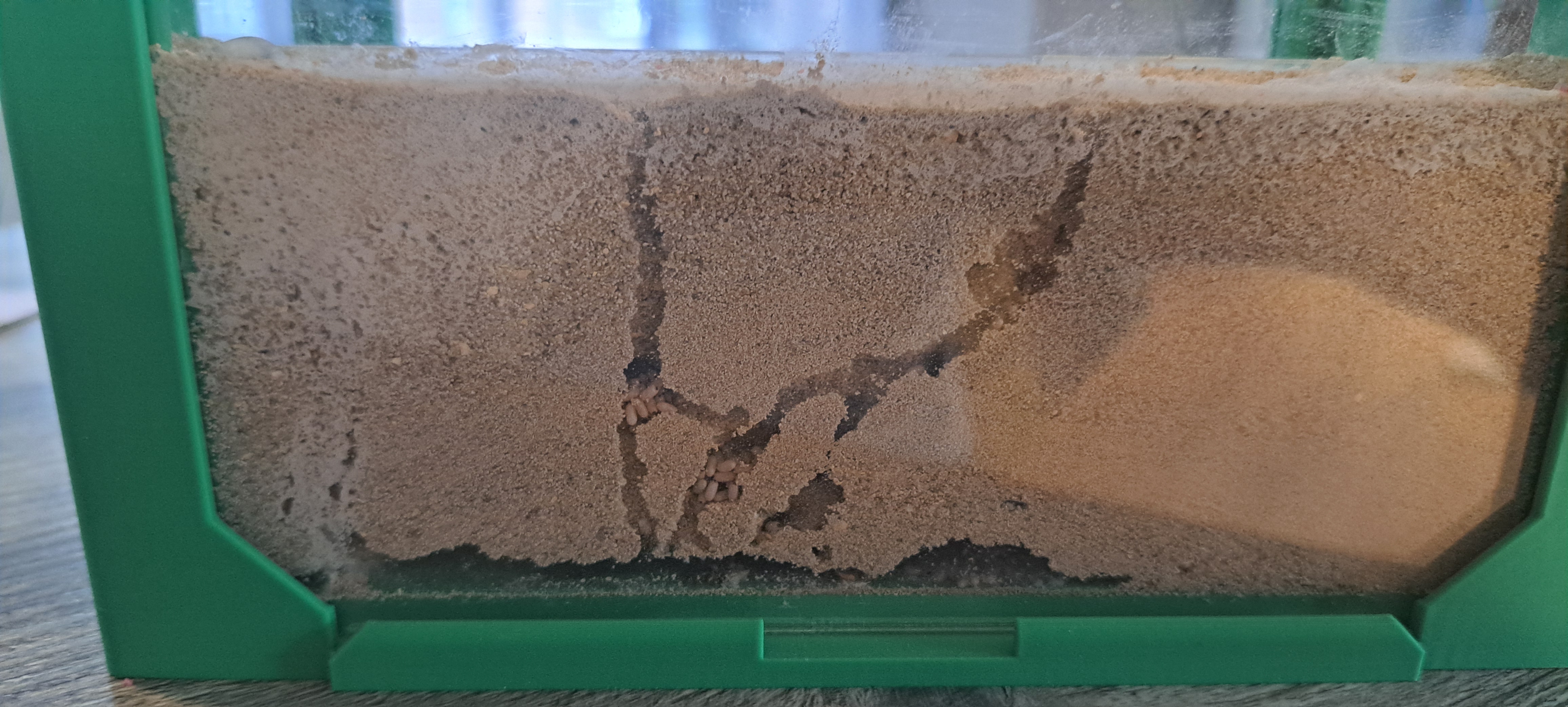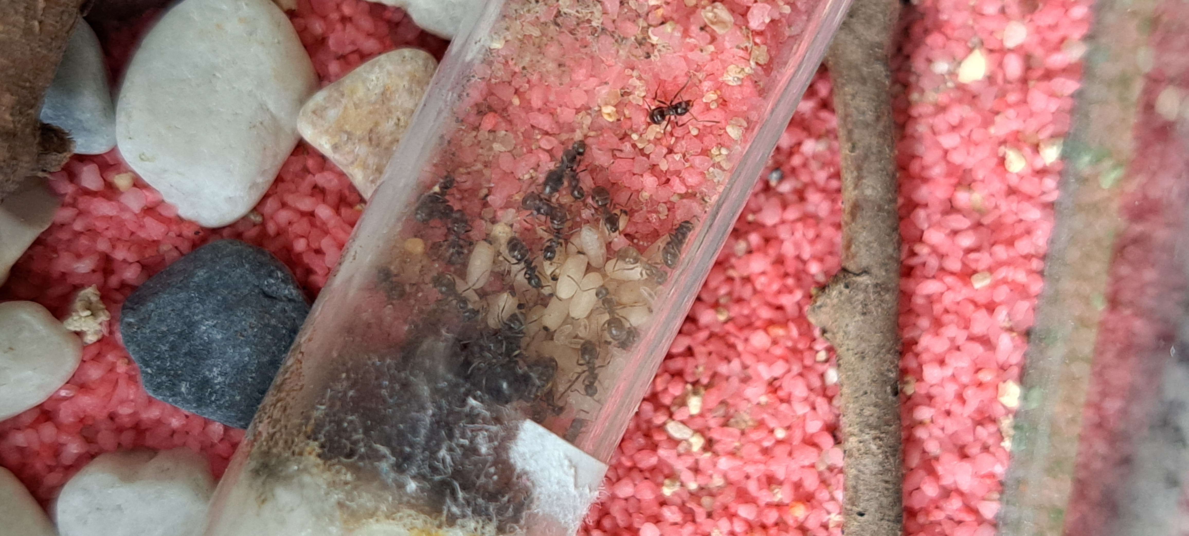 So sieht es aktuell aus. Aktuell dĂŒrften es so ca 15 kleine Tierchen und jede Menge Eier sein. Ich bin eigentlich sehr zufrieden mit dem Ergebnis, nur mein Sohn ist ziemlich ungeduldig und hofft das die Ameisen bald "umziehen".