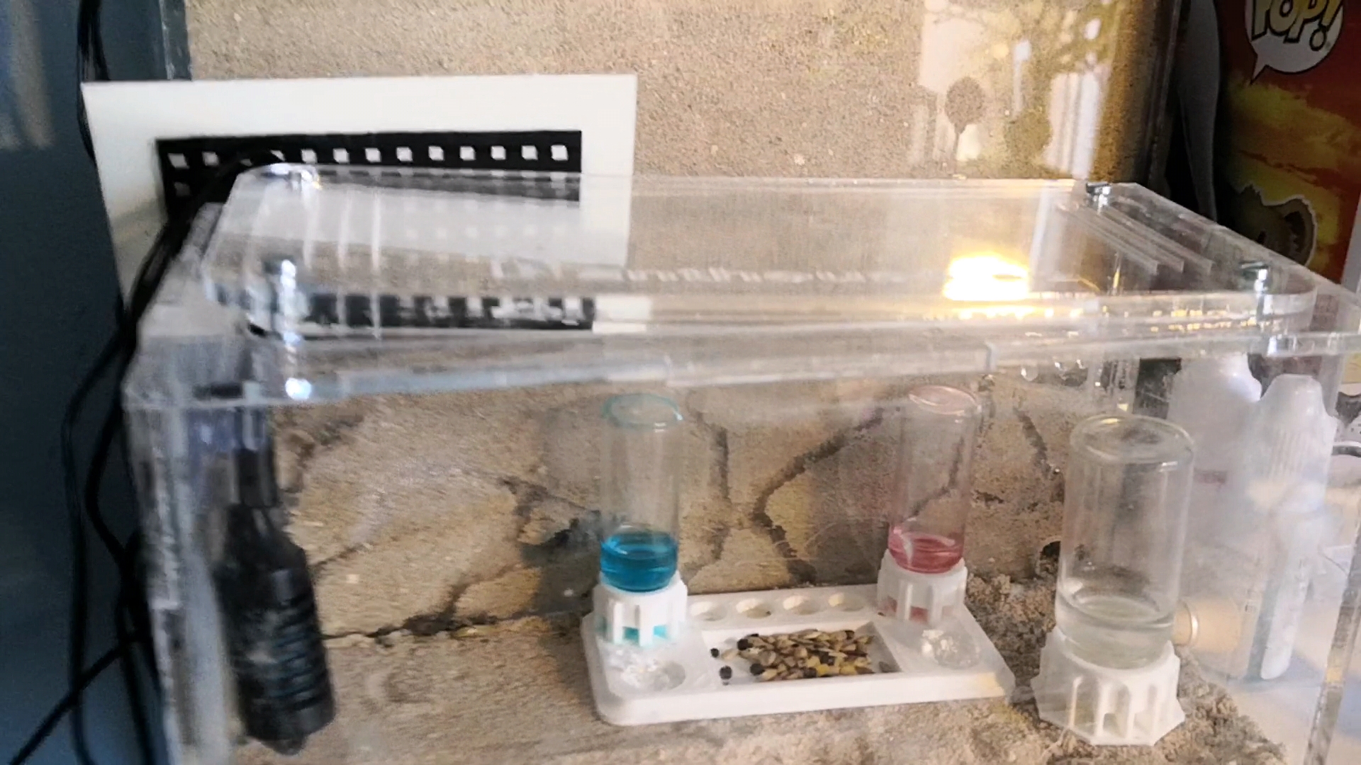 Im Gegensatz zum ersten Mal hatte ich diesmal eine Wasser tränke, tränke mit Nektar, Körner, Gelee Temperatur und feuchigkeitsmesser und eine kleine heizmatte aber nach und nach kamen immer weniger Ameisen aus dem Nest und haben sich dort quasi verschanzt.