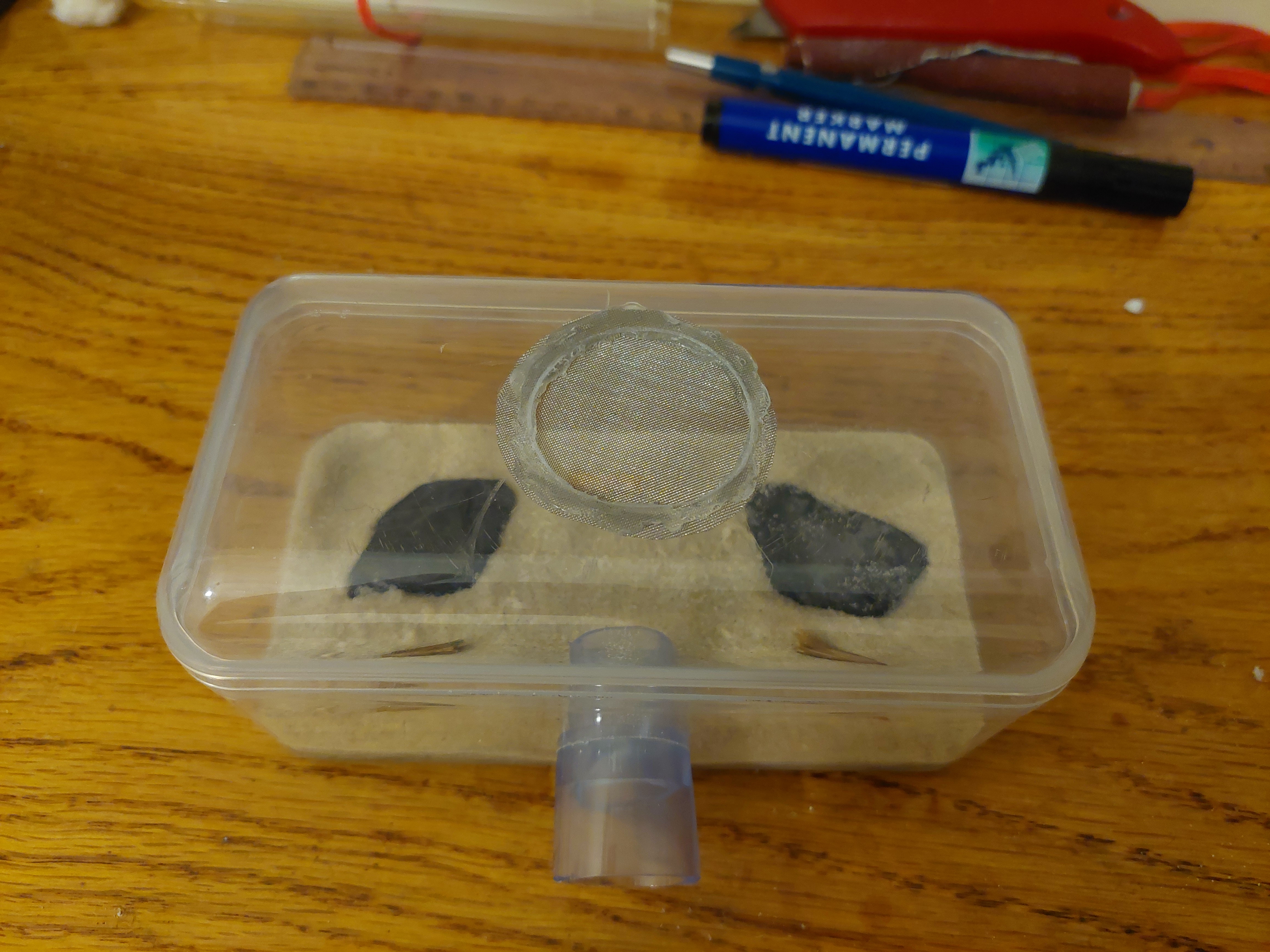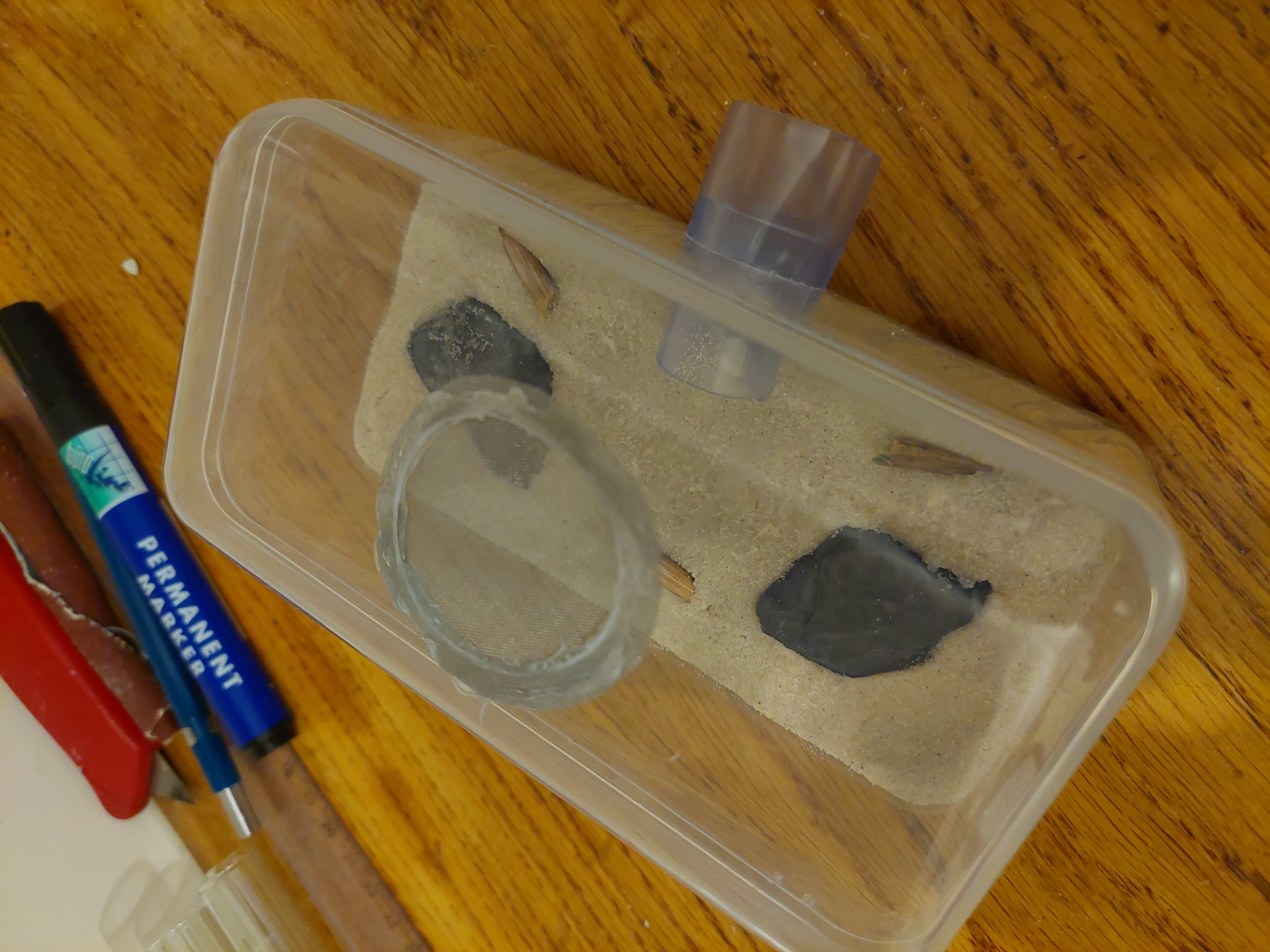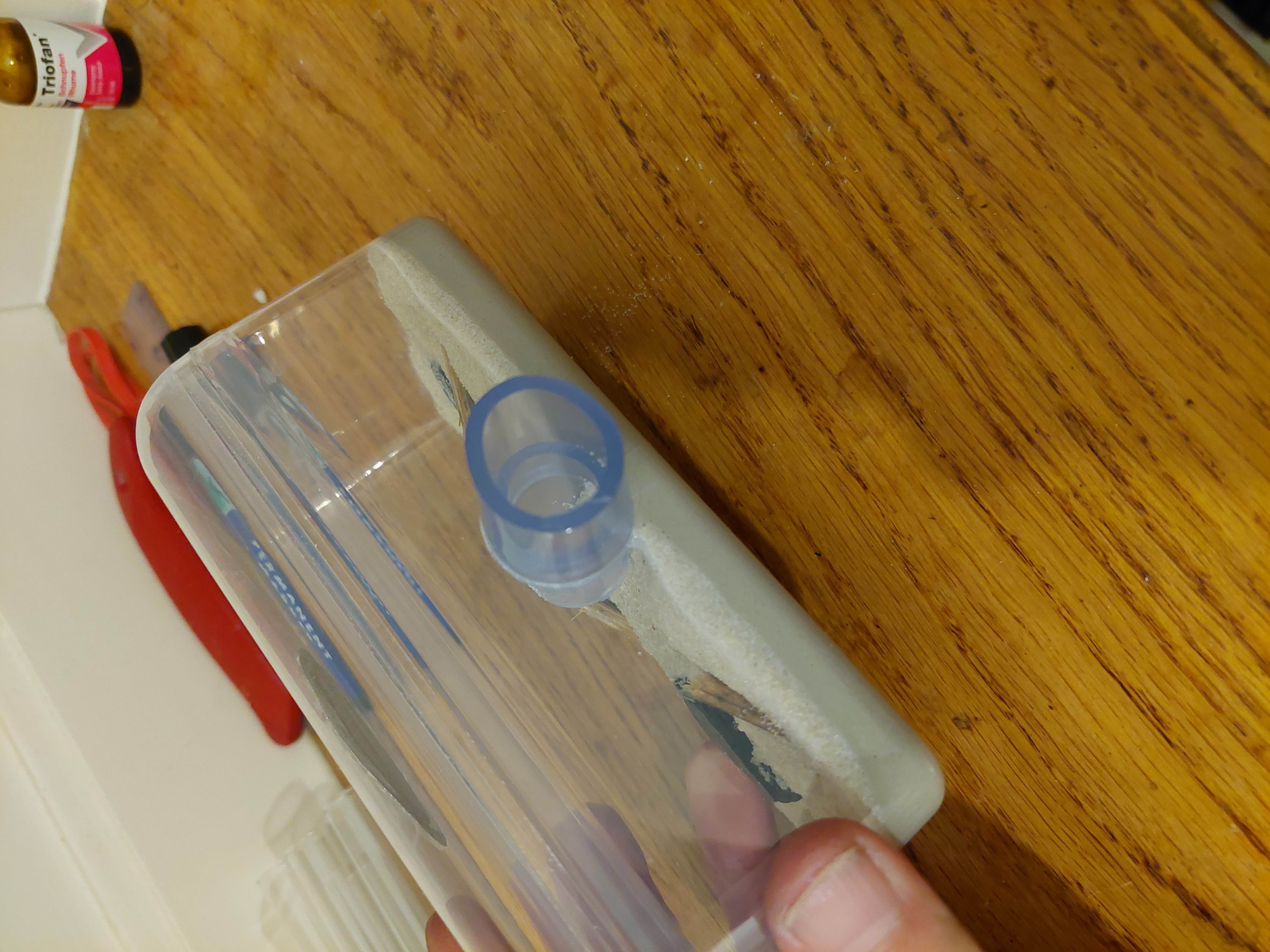 Ich bin grad dabei mir ne kleine Mini Arena zu basteln, denke auch das ist besser.AtTheAnt ↑10. Februar 2022, 06:58Ich würde zum Verschließen des Reagenzglases Watte statt Stahlwolle nutzen. Falls du gelegentlich nachgucken willst, würde ich dir empfehlen das Reagenzglas erschütterungsfrei zu lagern, also auf etwas weiches liegen, und einen einfach wegnehmbaren Lichtschutz. Dann kannst du abends im Halbdunkel die Haube wegnehmen und mit einem roten Licht reinleuchten. Da zuckt dann keine Ameise mehr. bewährtes Verfahren.