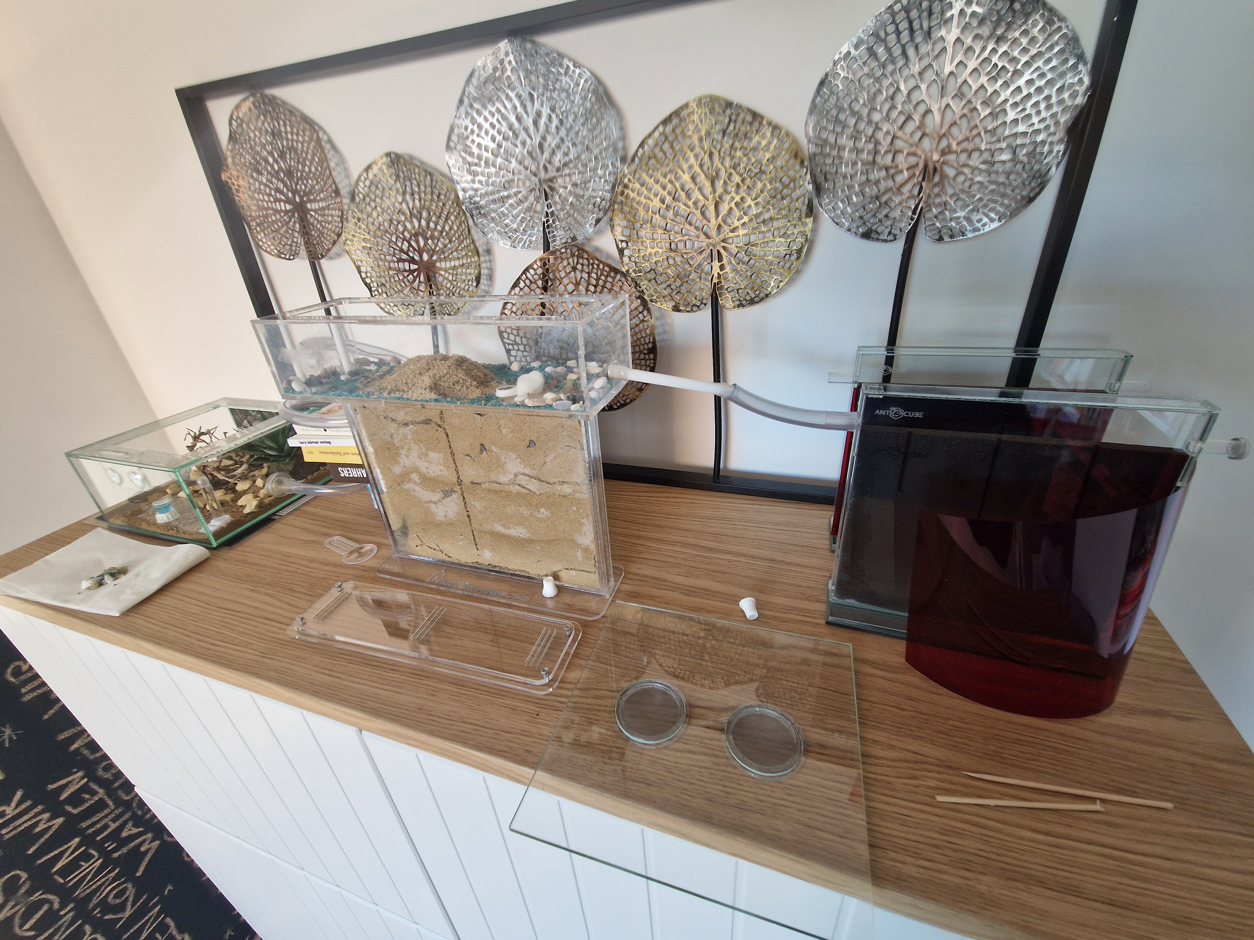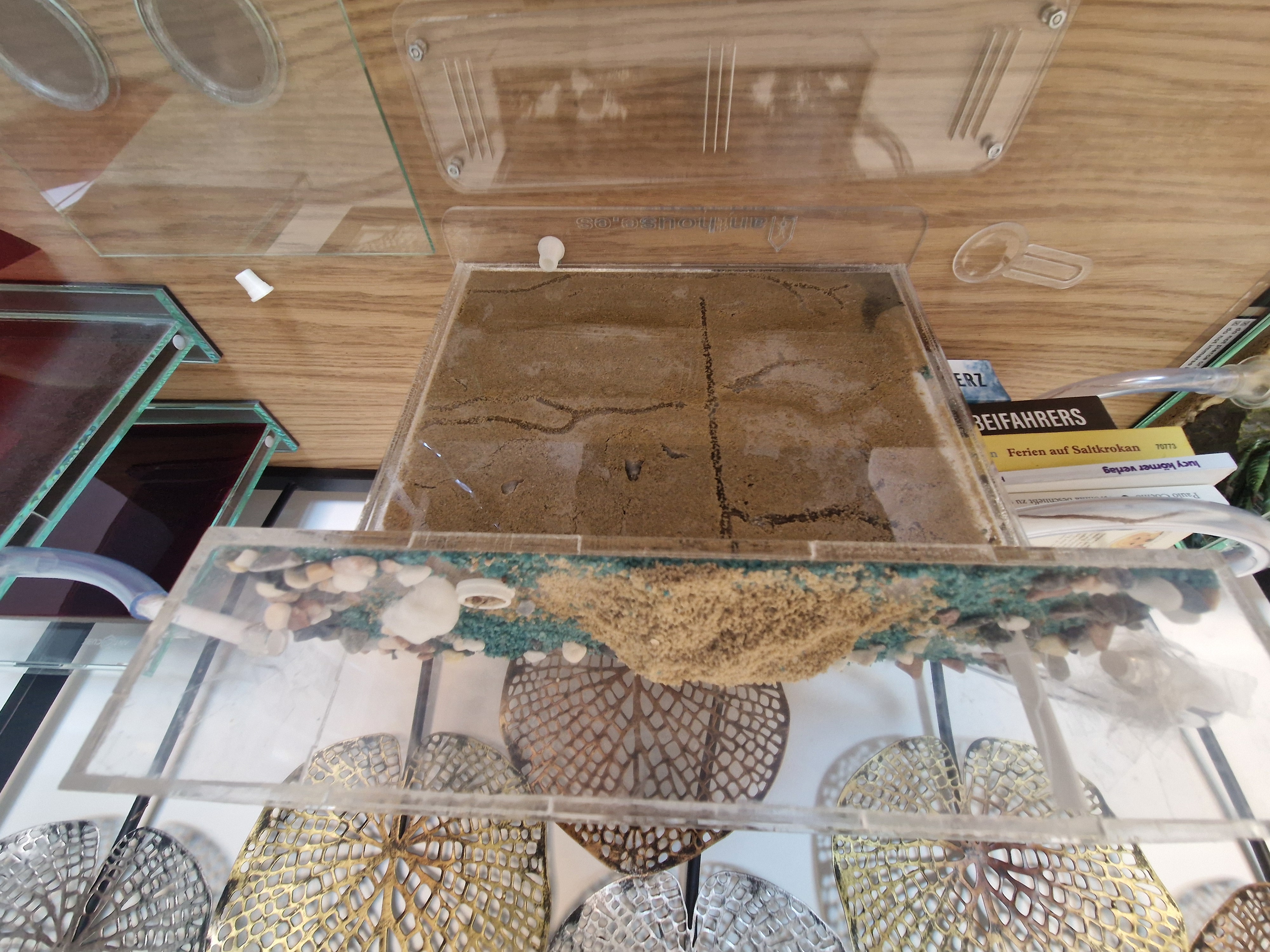 Bei der kleinen Koloniegröße wird ihnen tatsächlich der Bereich auf dem alten Nest völlig ausreichen, daher würde ich die neue Arena erst einmal abstöpseln, Wasser und Körner in der kleinen Arena anbieten und das neue Nest links plazieren, quasi als Übergang zur größeren Arena, wenn sie dort stehen bleiben soll. Das neue Nest beheizen und ein paar Gänge "vorbohren".