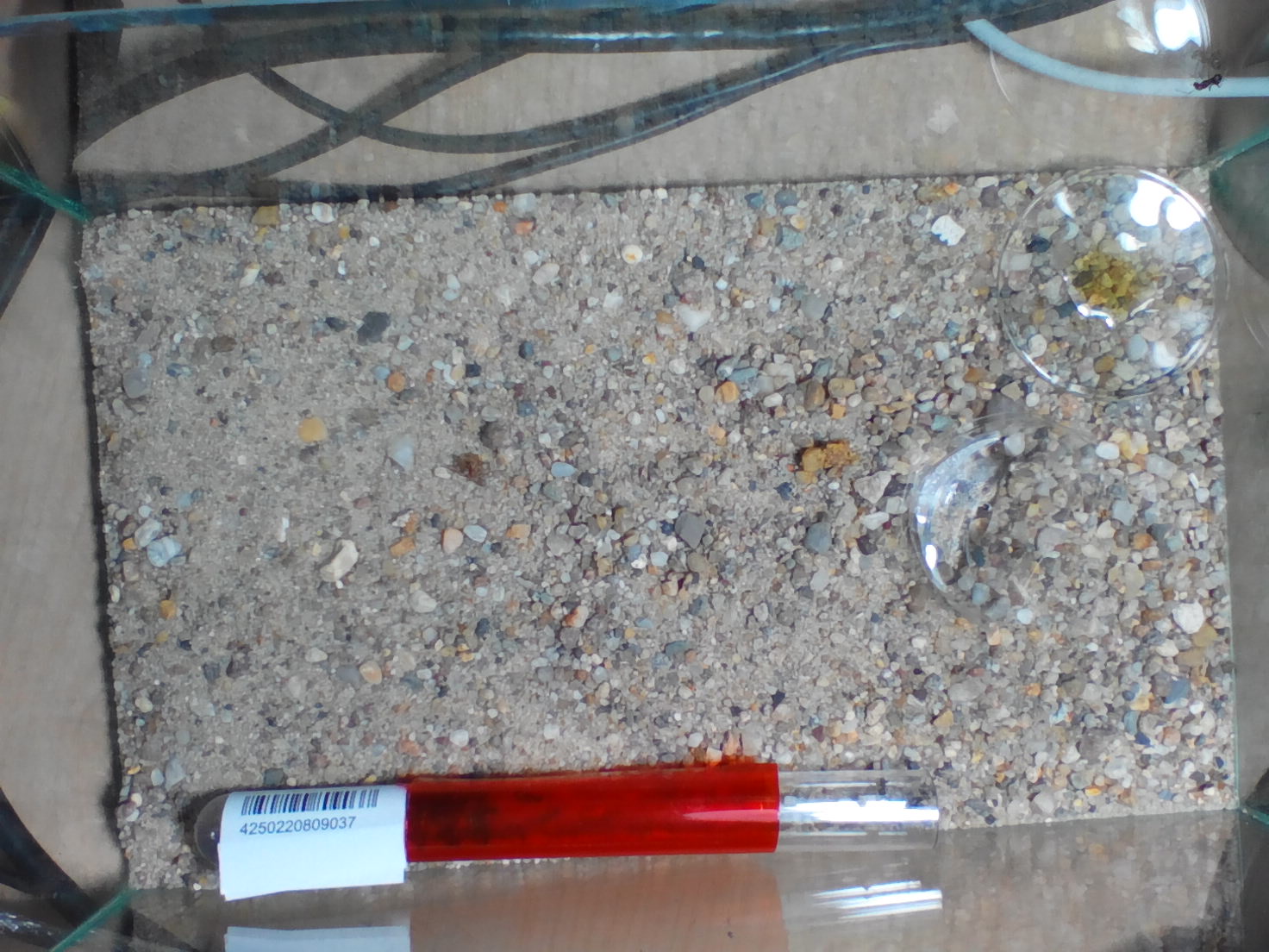 Da mein Waldspaziergang leider keinen Erfolg brachte und ich nicht länger warten wollte, habe ich mir eine kleine Kolonie Formica fusca angeschafft. Die Kleinen sind heute wohlauf angekommen und tummeln sich bereits im Reagenzglas und erkunden die Arena, in welcher ich Honigwasser anbiete, welches gerne angenommen und verteilt wird.