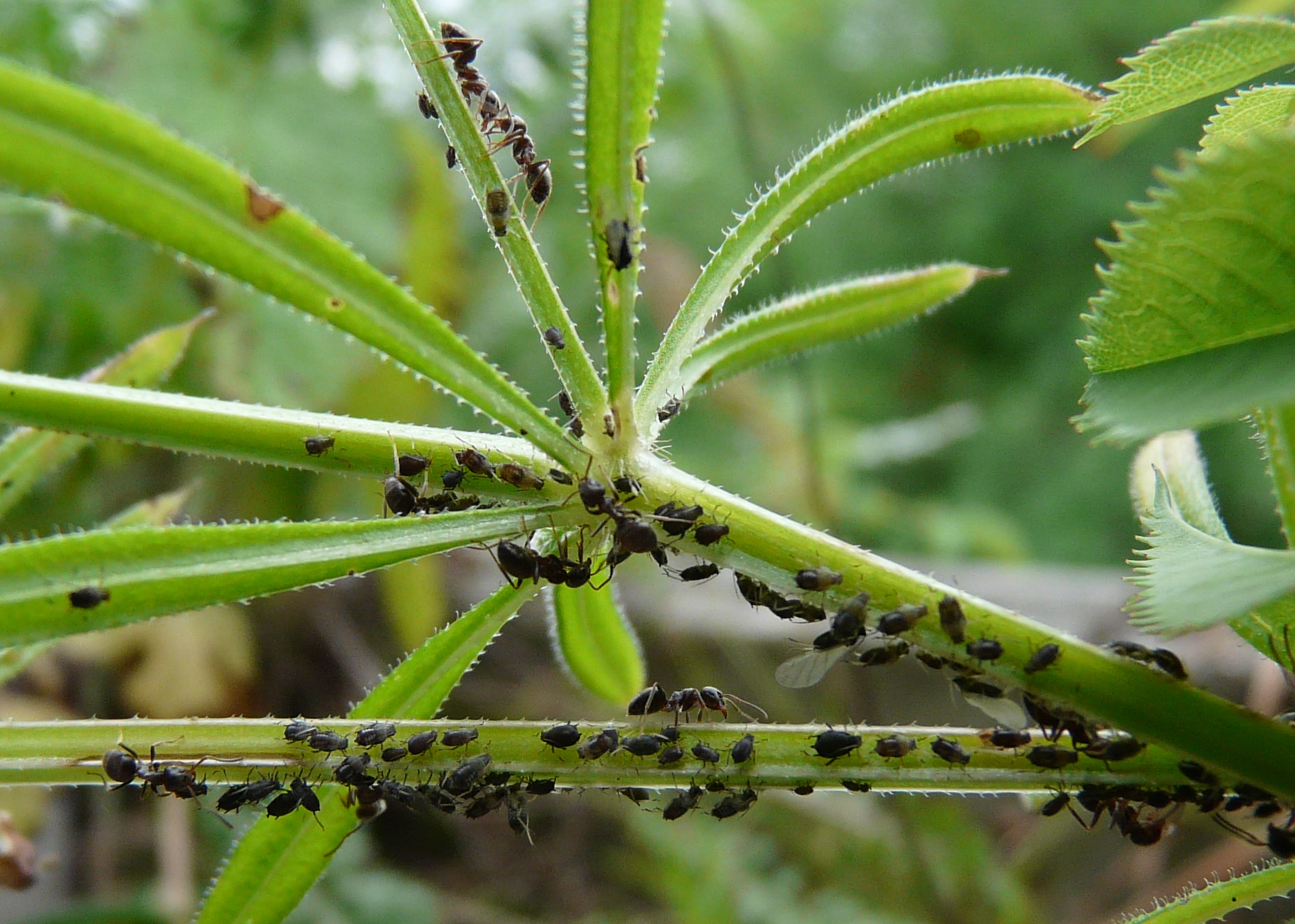 - die Arbeiterinnen sind ca. 3-4 mm groß, bräunlich mit etwas helleren Beinen (und auf dem ersten der beiden Fotos von den Arbeiterinnen sitzt auf dem unteren waagerechten Pflanzenstil in der Mitte eine Ameise, bei der ich denke, dass das Kauwerkzeug einen leicht rötlichen Stich hat)