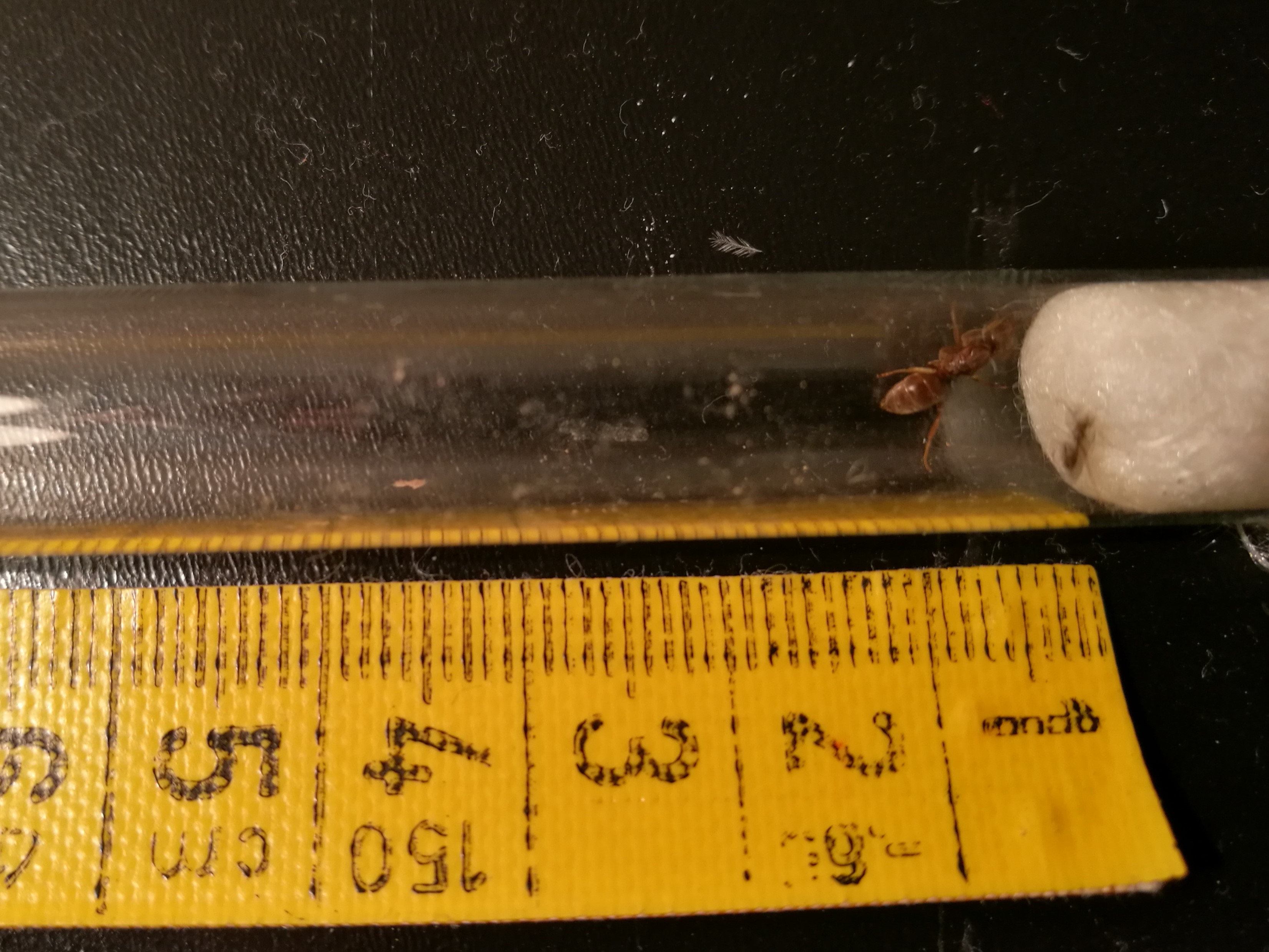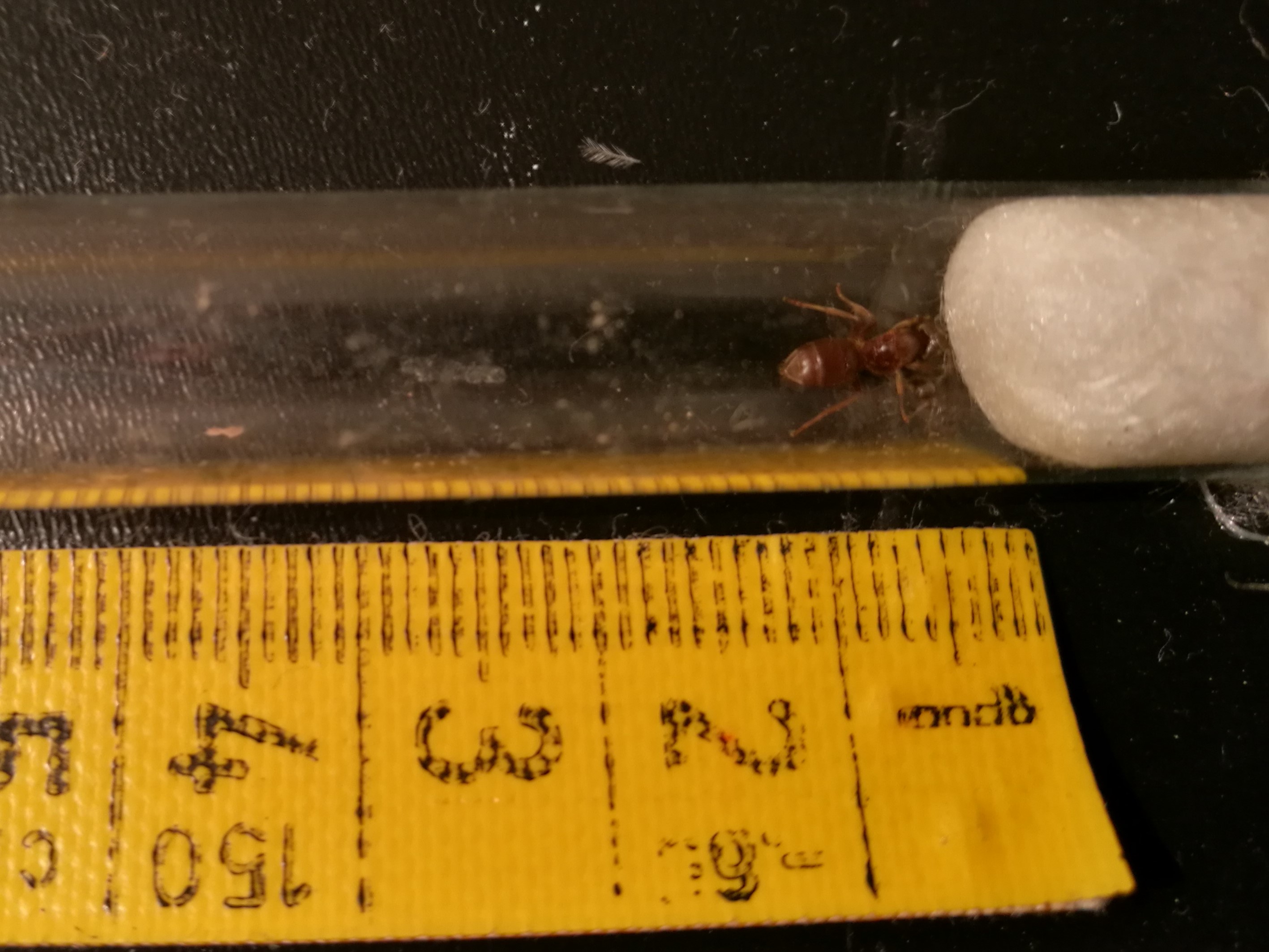 Nun würde ich gerne erreichen, dass die Arbeiterinnen die Umbratus-Königin annehmen. Ich las dazu im Internet, dass diese sich in ein Nest schleichen, eine Arbeiterin töten und ihren Geruch dadurch annimmt und dann von der Kolonie aufgenommen wird. Daher fügte ich dem Reagenzglas mit der Königin eine Arbeiterin hinzu und warte nun, ob etwas passiert.