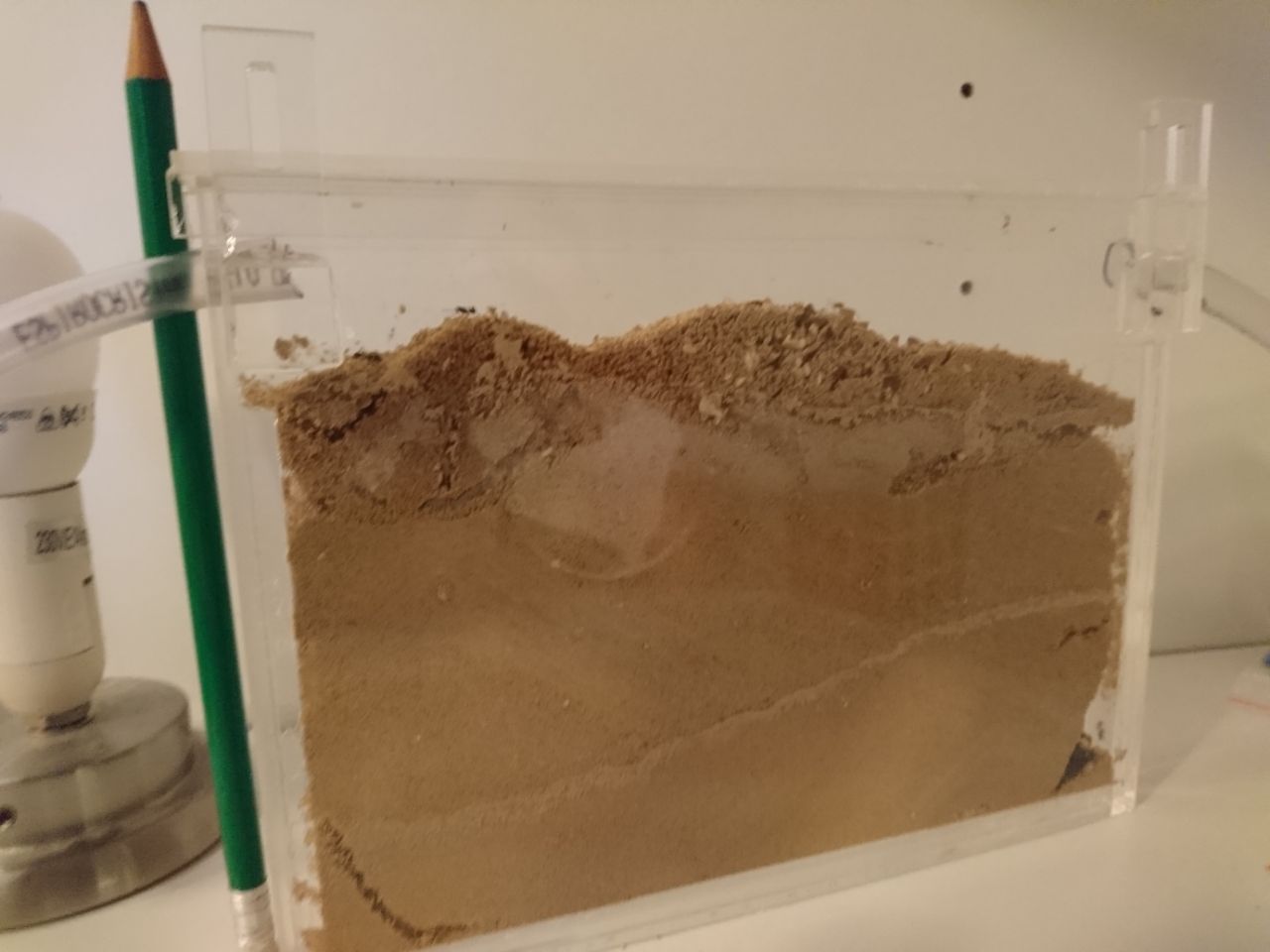 Außerdem habe ich eine Messor barbarus Königin mit schon guten 25 Arbeiter/-innen bekommen. Nach Recherchen zu Messor barbarus habe ich sie in die SK ausgesetzt und sie haben angefangen zu graben. Außerdem habe ich ihnen (meiner Meinung nach) genug Wasser angeboten und auch Körner in der Außenwelt verteilt.