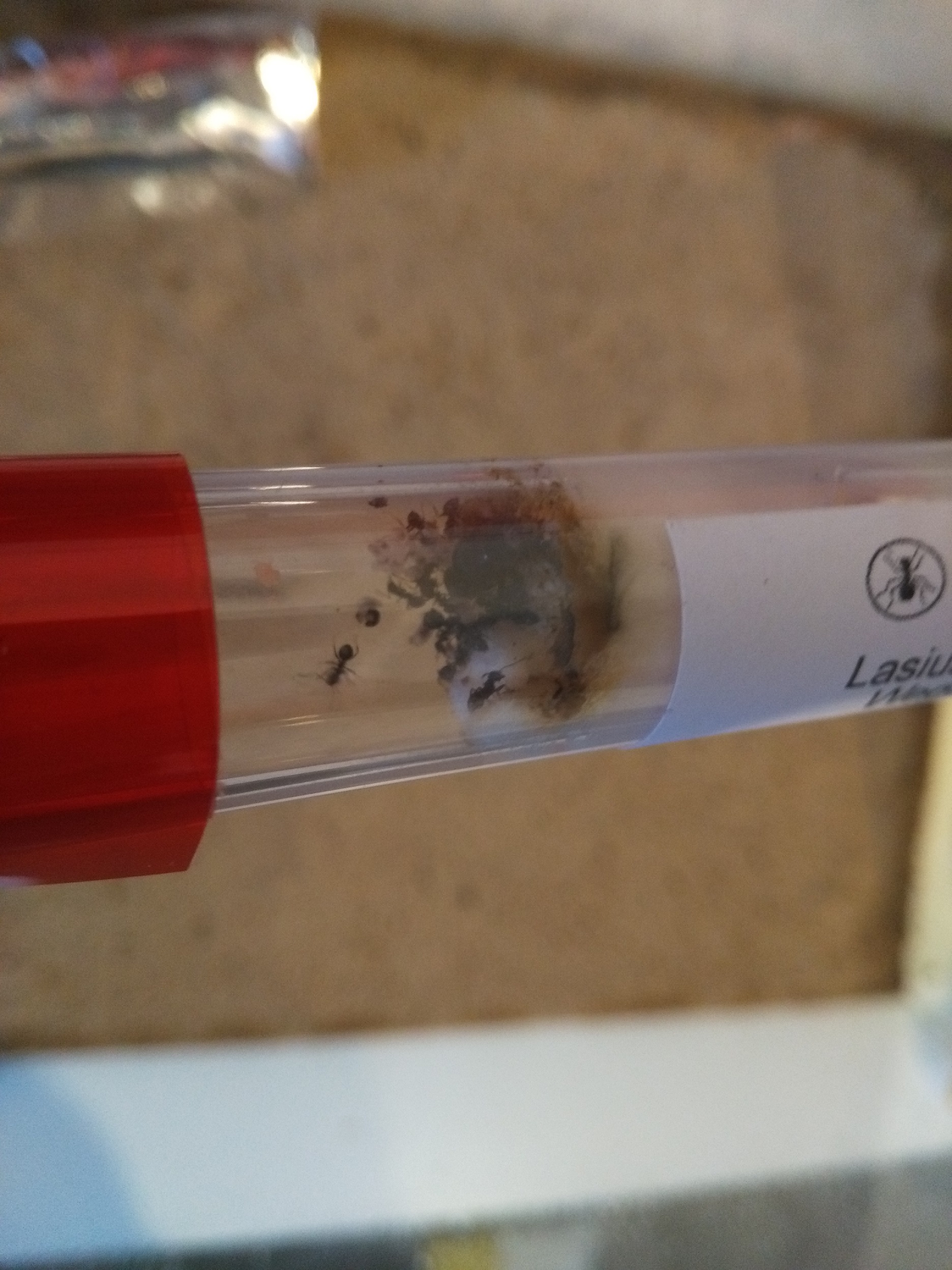 Ich habe ca. 20 Ameisen bei mir in der Arena, die sich noch im Reagenzglas befinden. Das Reagenzglas ist mit roter Folie und Alufolie abgedeckt, sodass es dunkel genug sein sollte. Honigwasser steht auch bereit und ich bemĂŒhe mich, nicht zu oft ins RG zu schauen :D