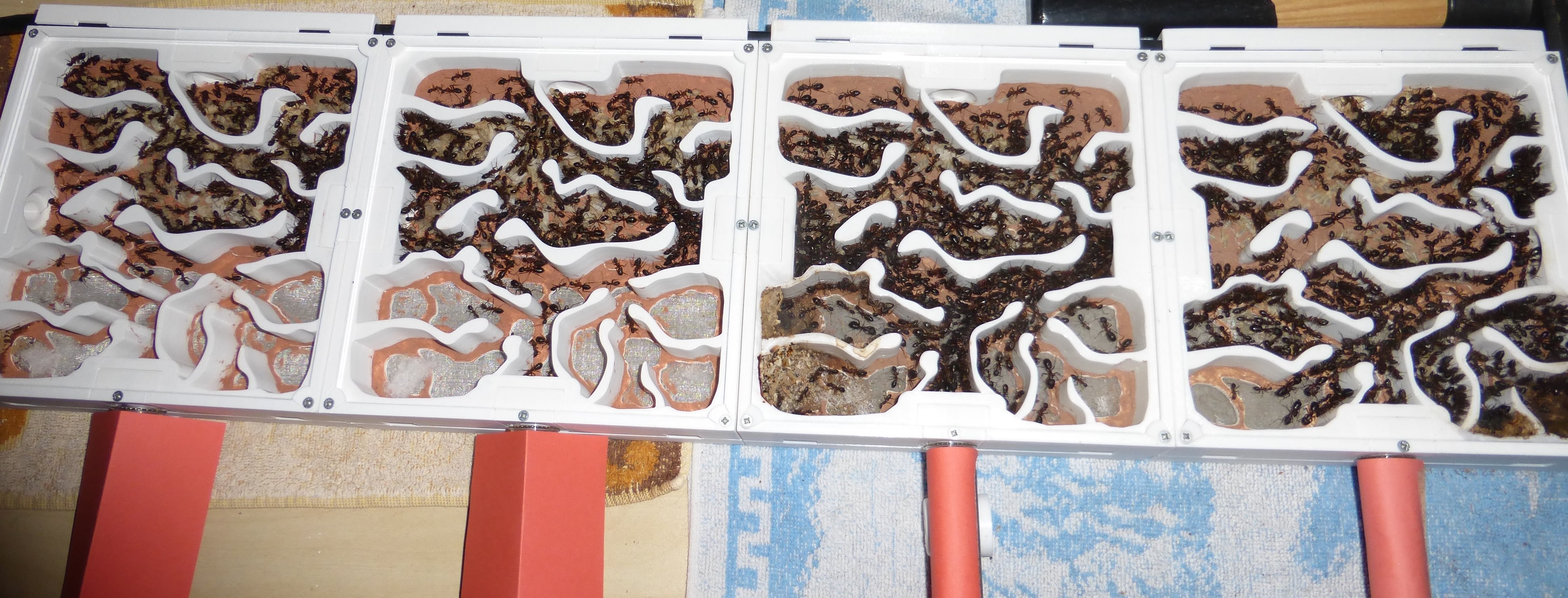 So sieht das Hauptnest nach fast 2 Jahren aus - das ist ungefĂ€hr die HĂ€lfte der Arbeiterinnen (evtl. sogar weniger), der Rest sitzt in den Wasser-RGs (die vier roten Dinger unten an den Nestern), den zwei groĂen 30x200mm Wasser-RGs in der Hauptarena, den 4 anderen Wasser-RGs in den 3 Neben-Arenen und den vier Shrimpsröhrenpyramiden in der Hauptarena.