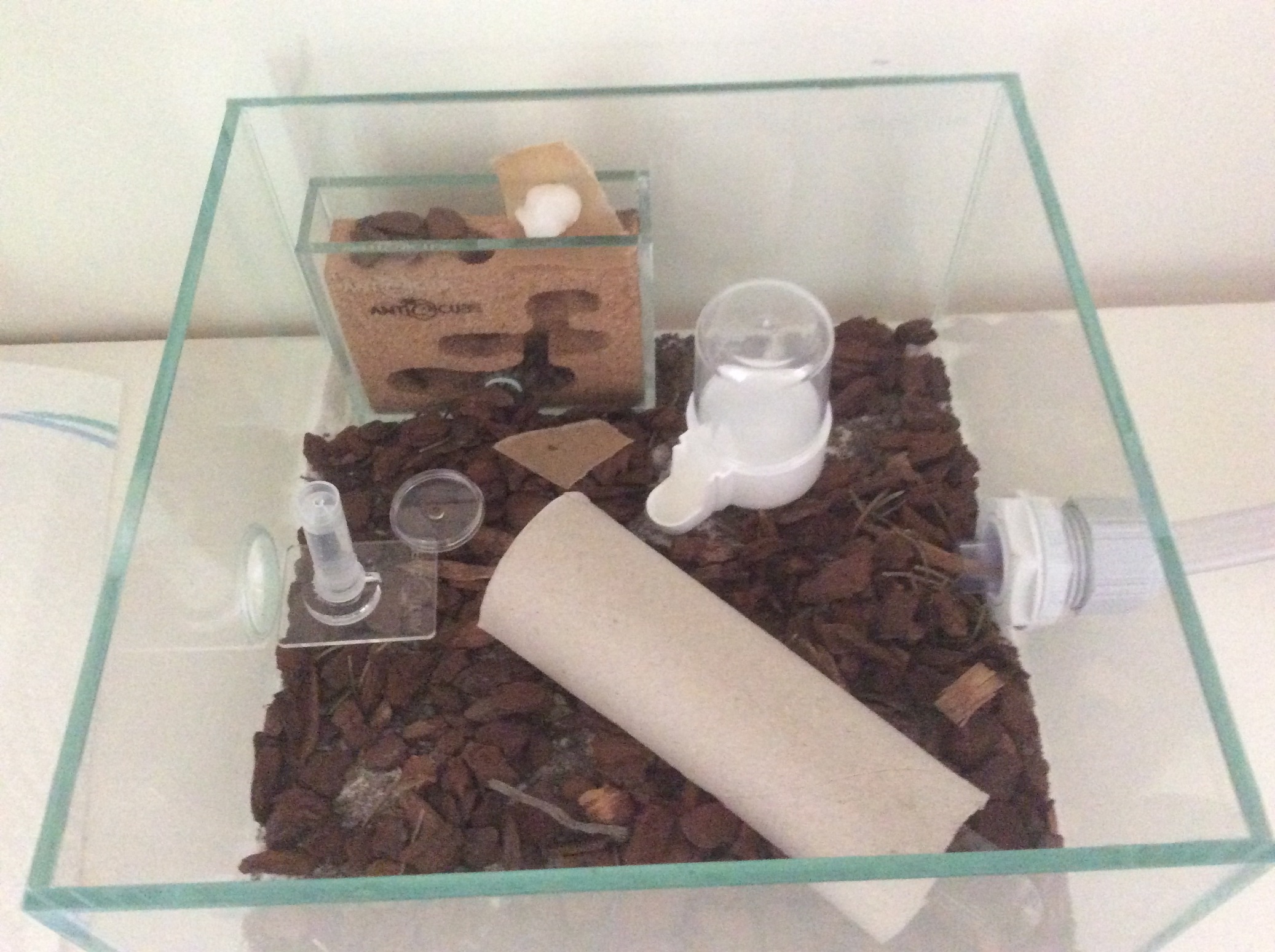 Nach der Ankunft sind die Ameisen recht schnell (nach ca. 3 Stunden) in ein kleines Korknest gezogen. Dieses wird von mir aber nicht bewässert. In der Arena hab ich immer ein kleines frischen Insekt, Wassertränke und Honigwasser parat.