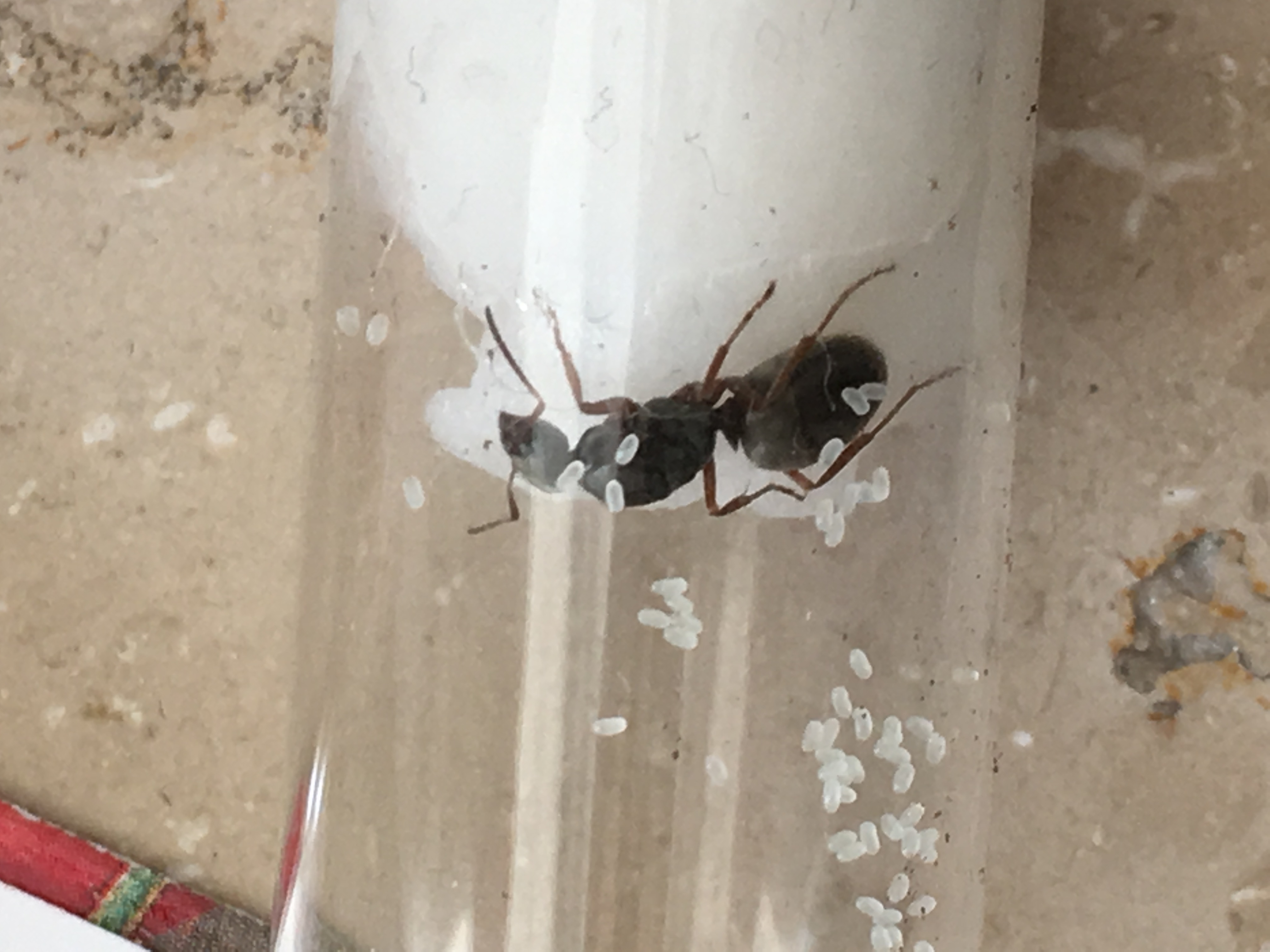 Ich habe 8 Arbeiter auf dem Heimweg eingesammelt und alles in eine provisorische Ameisenfarm gesetzt. Sie scheinen sich zu verstehen und sieht so aus , als ob sie die Königin füttern und die kleinen Exemplare die Brutpflege übernehmen. :D