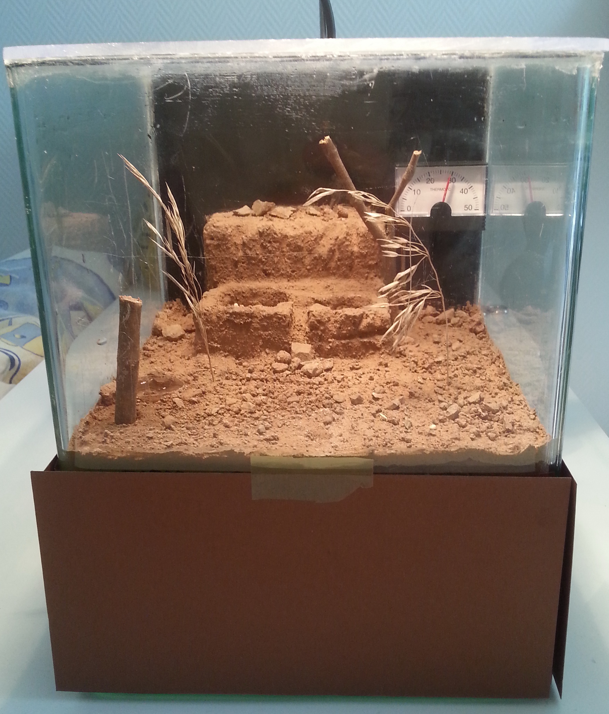 3. Als Wärmequelle nutze ich eine Glühbirne mit Reflektor die ich in der Höhe verstellen kann. Die Lampe läuft via Zeitschaltuhr etwa 10 Stunden am Tag und wärmt die Arena auf wie oben beschrieben ca 30°C auf. In der Nacht geht die Temperatur auf Zimmertemperatur runter (ca 22 Grad). Ist das so inordnung oder muss die Temperatur dauerhabt so hoch sein?