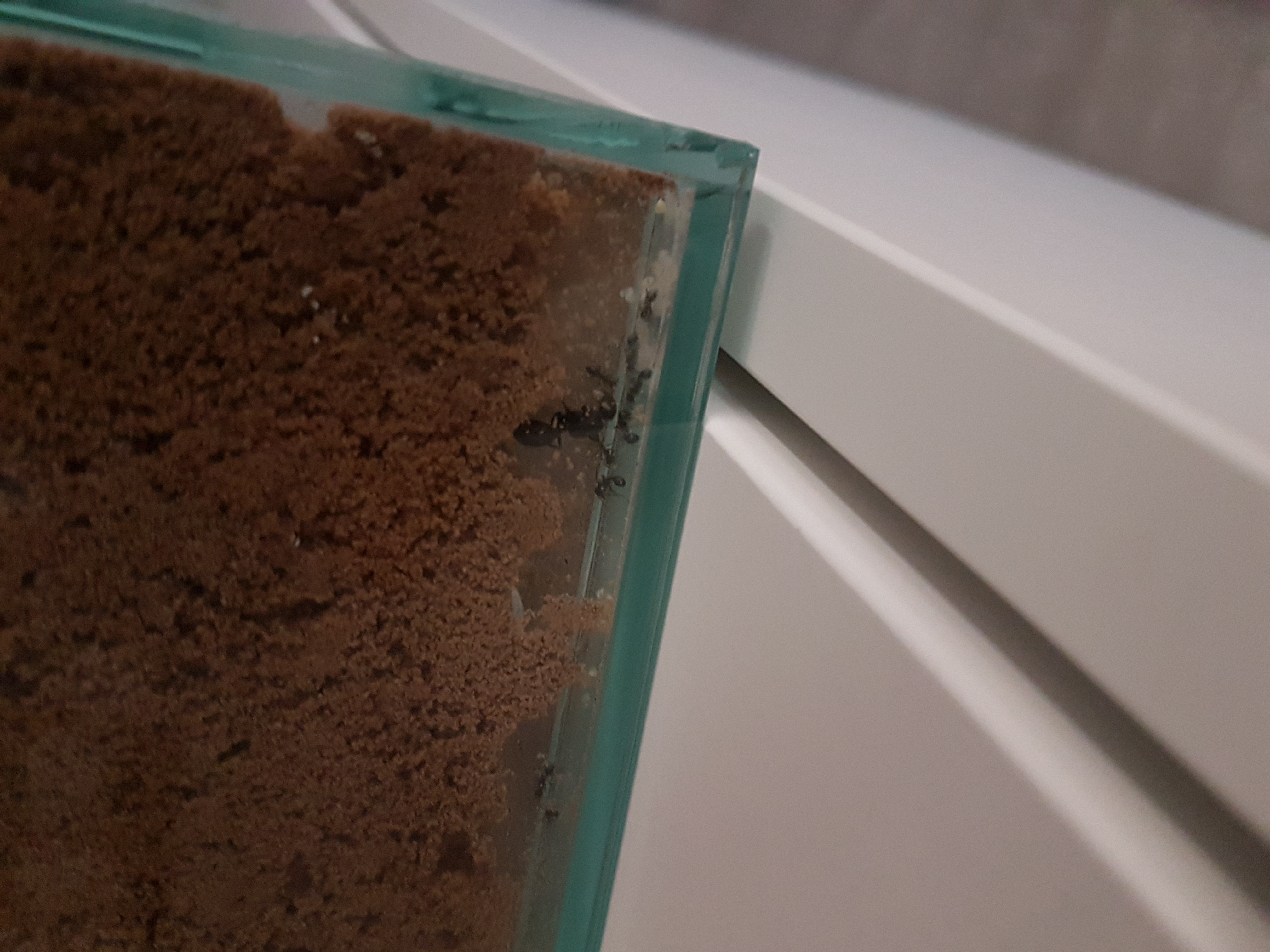 Königin ging als erste eine Erkundungstour machen dann ist sie Trinken gegangen und ist wieder zurück ins RG. Dann kamen die Arbeiterinnen raus und sind sofort budeln gegangen sie brachten der