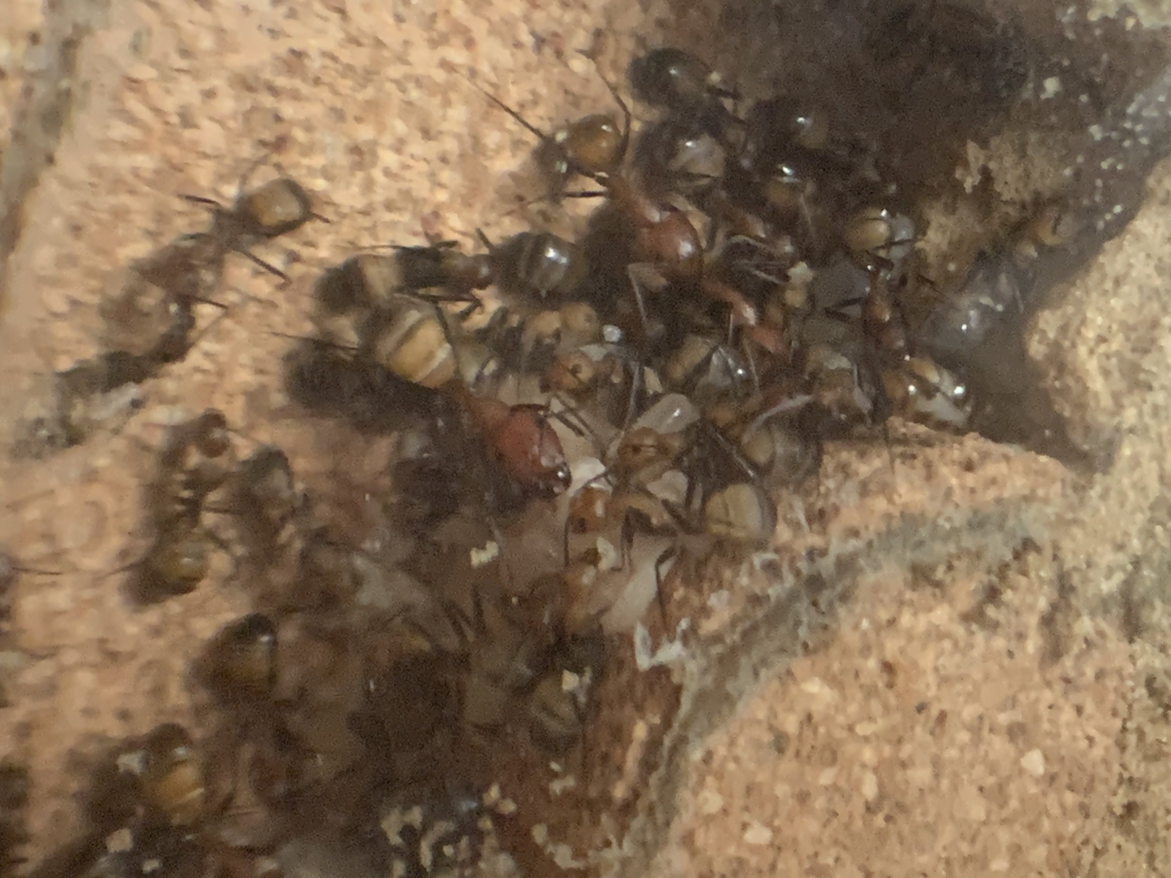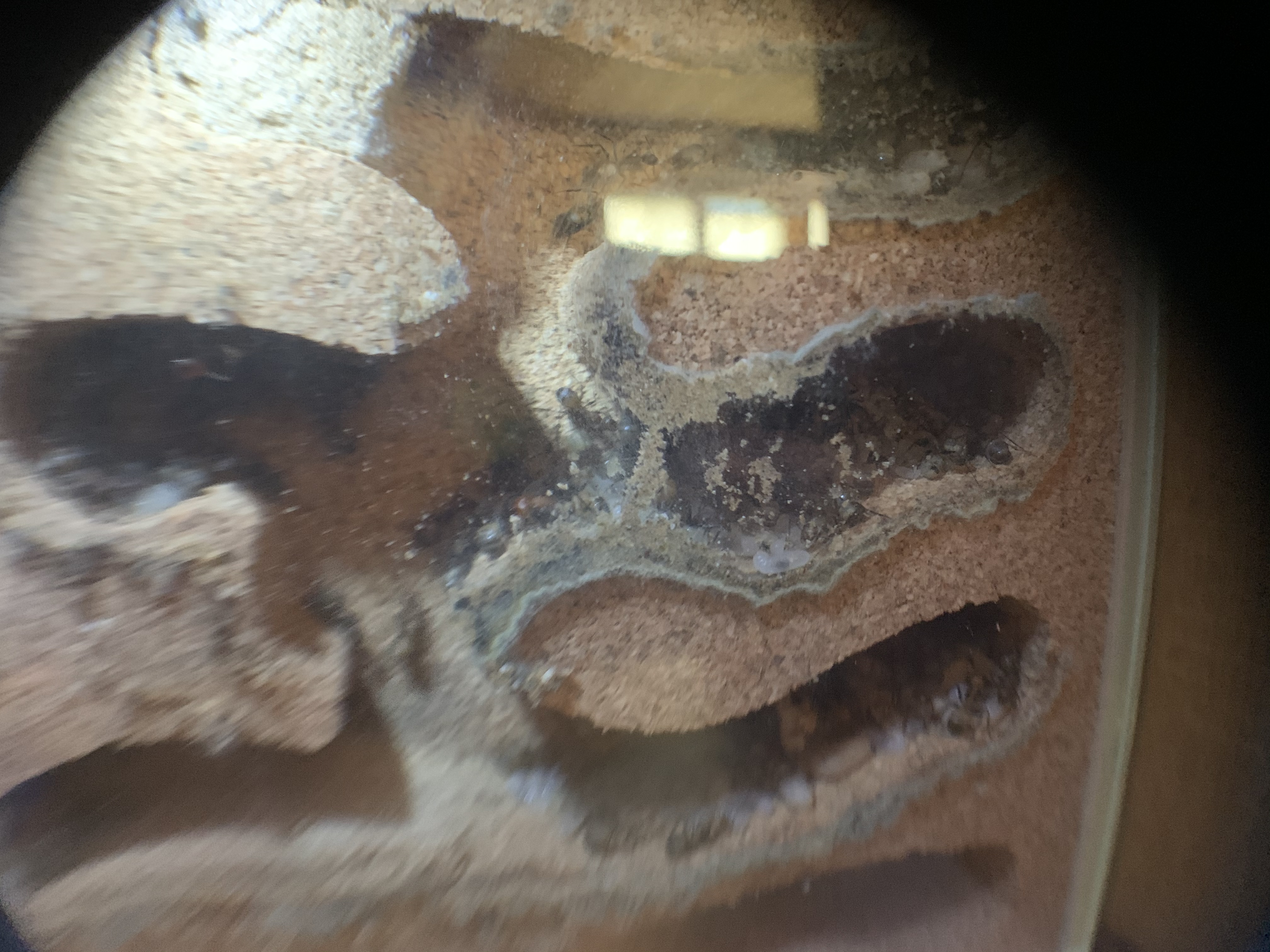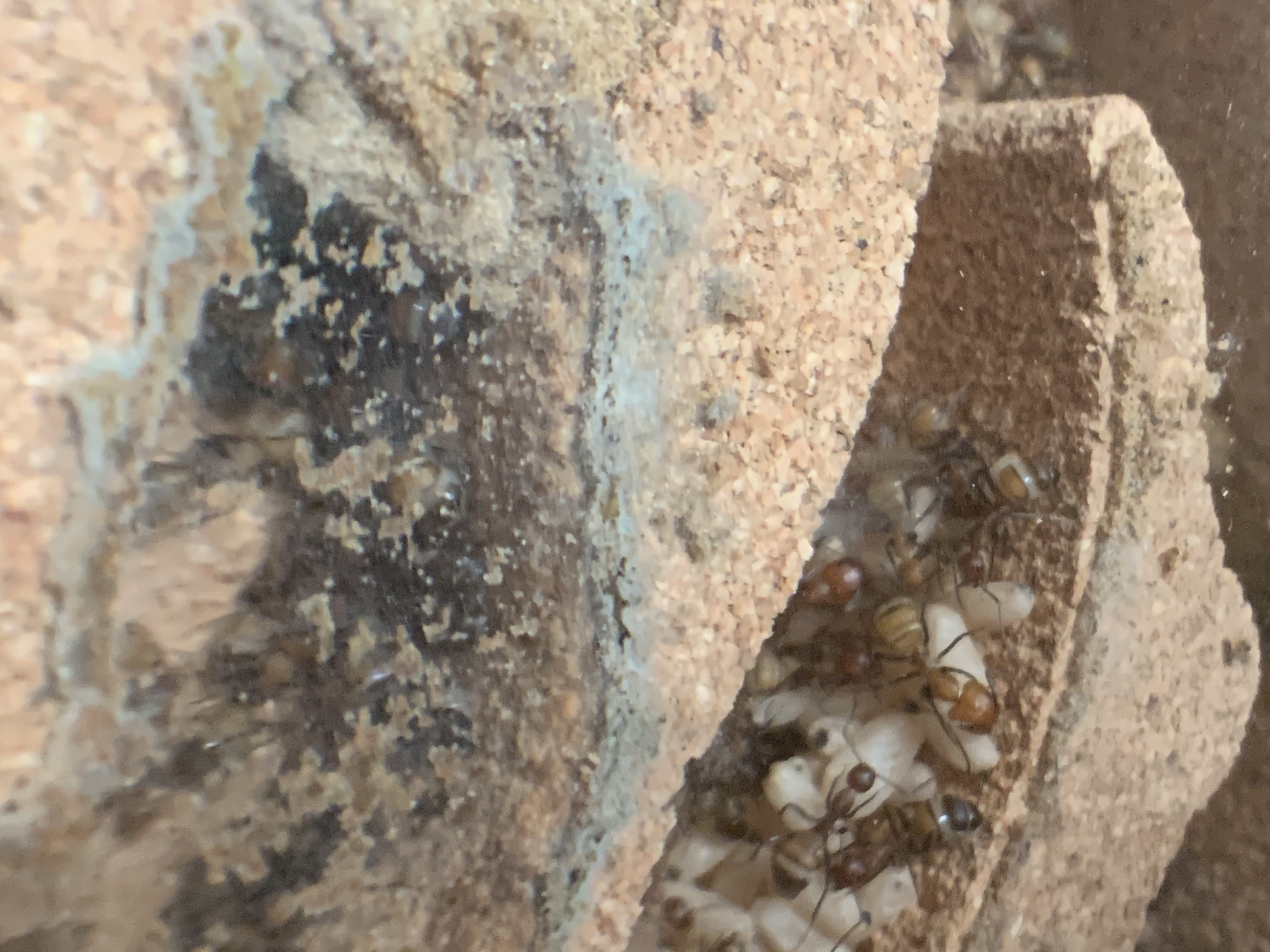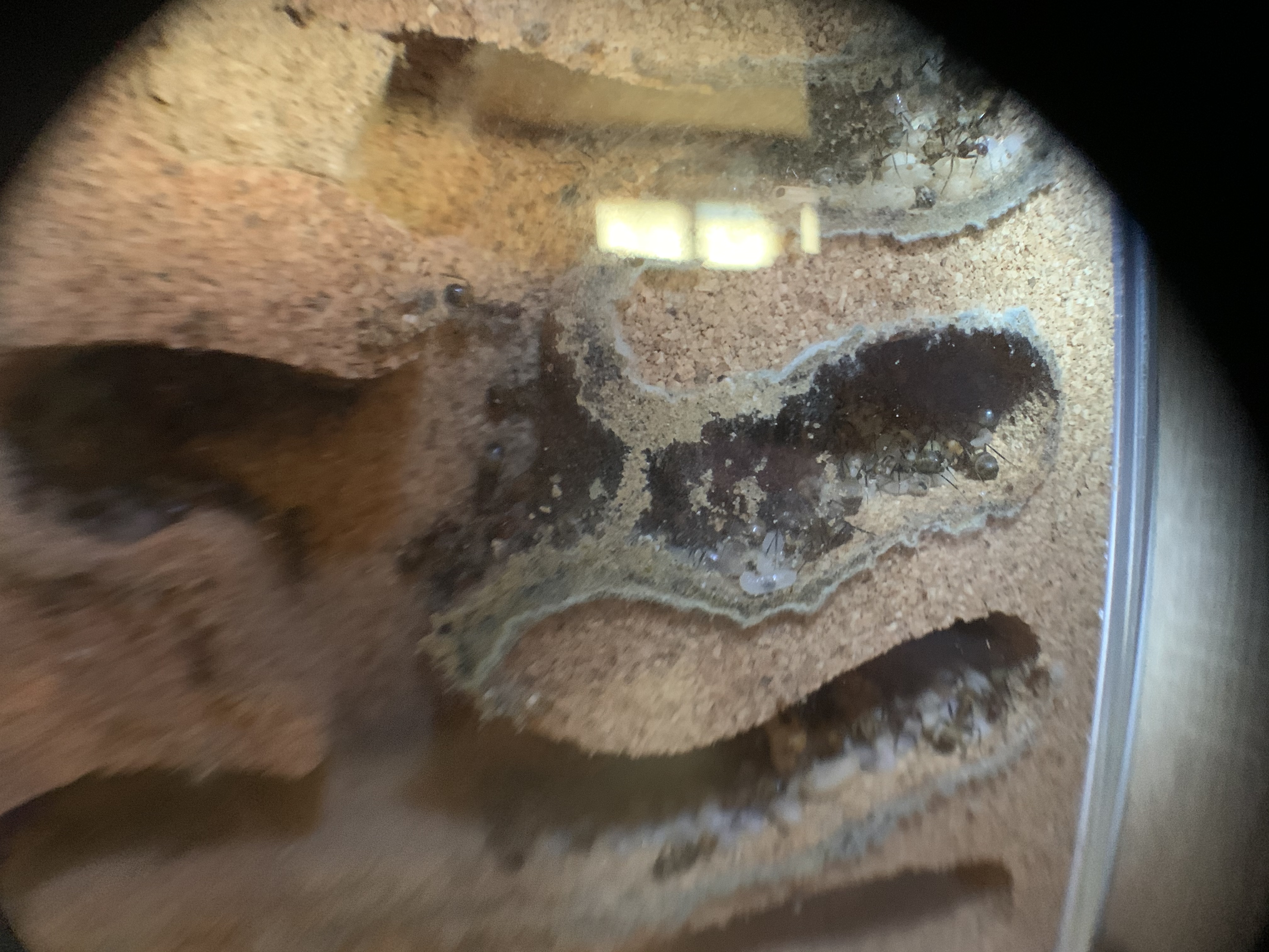 Ich habe vorhin mal das Nest genauer angeschaut, die Ameisen haben zwischen Glas und Korknest den kleinen Zwischenraum mit Material aus der Arena zugestopft!