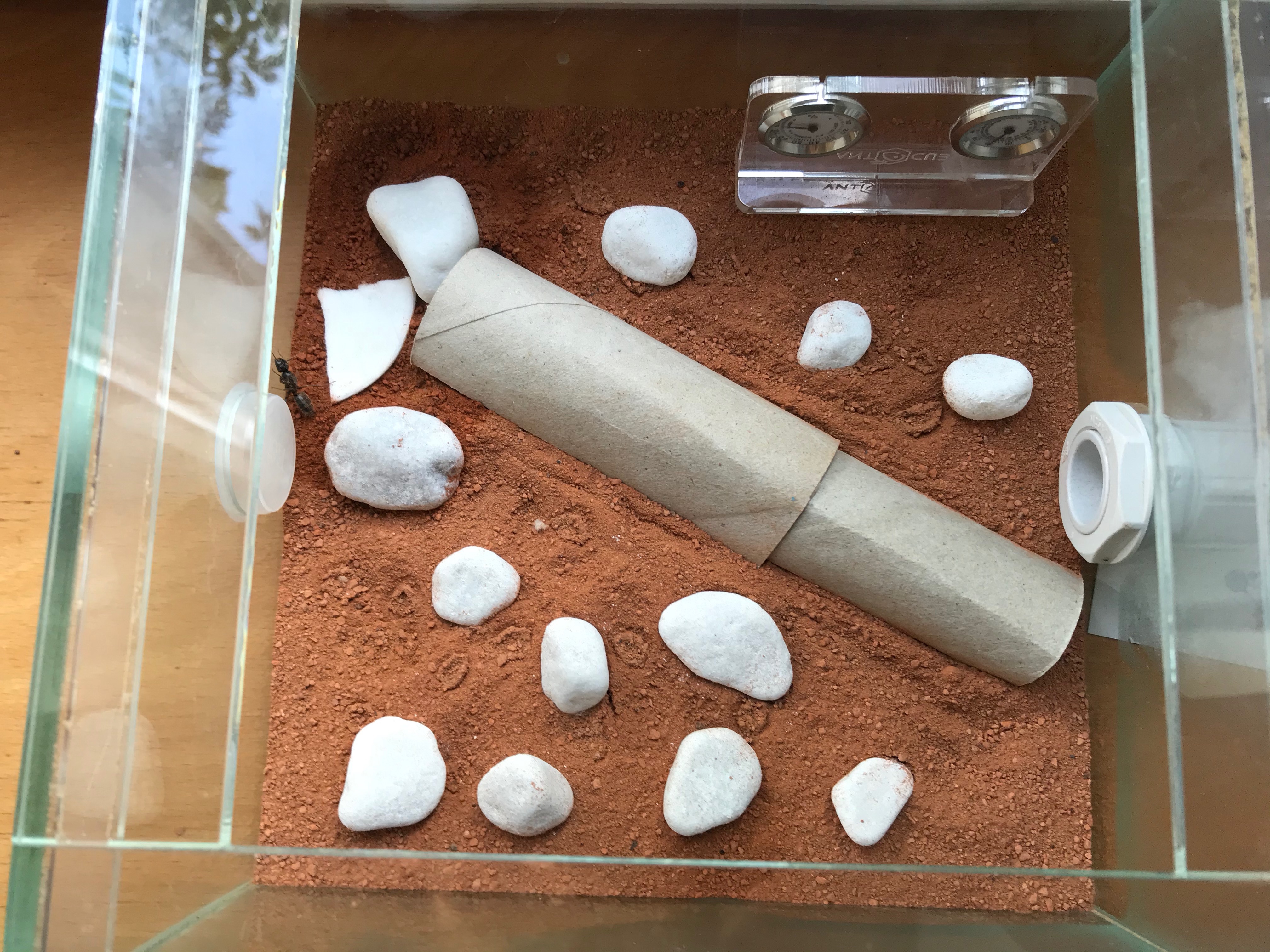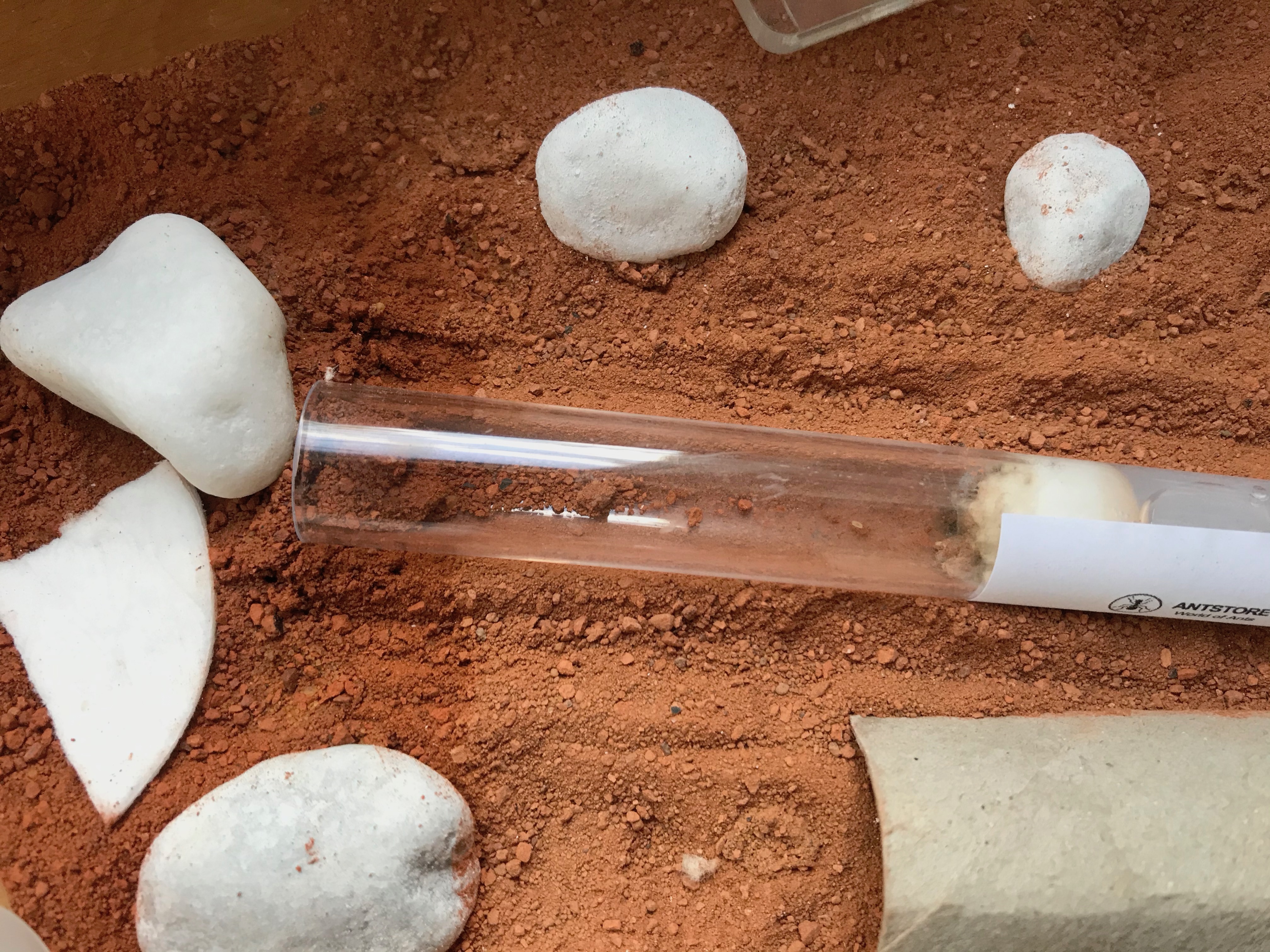 Seit einigen Tagen hat sie aber angefangen tagsüber das Nest zu verlassen und sich frei in der Arena zu bewegen. Ich habe mir daraufhin das Nest genauer angeschaut und mir ist aufgefallen, dass die Watte/das Tampon einen sehr trockenen Eindruck macht, wie vielleicht auch auf dem Bild zu erkennen ist. Also habe ich mit einer Pipette Wasser auf den Steinen und auf einem Stück Watte in der Arena verteilt.