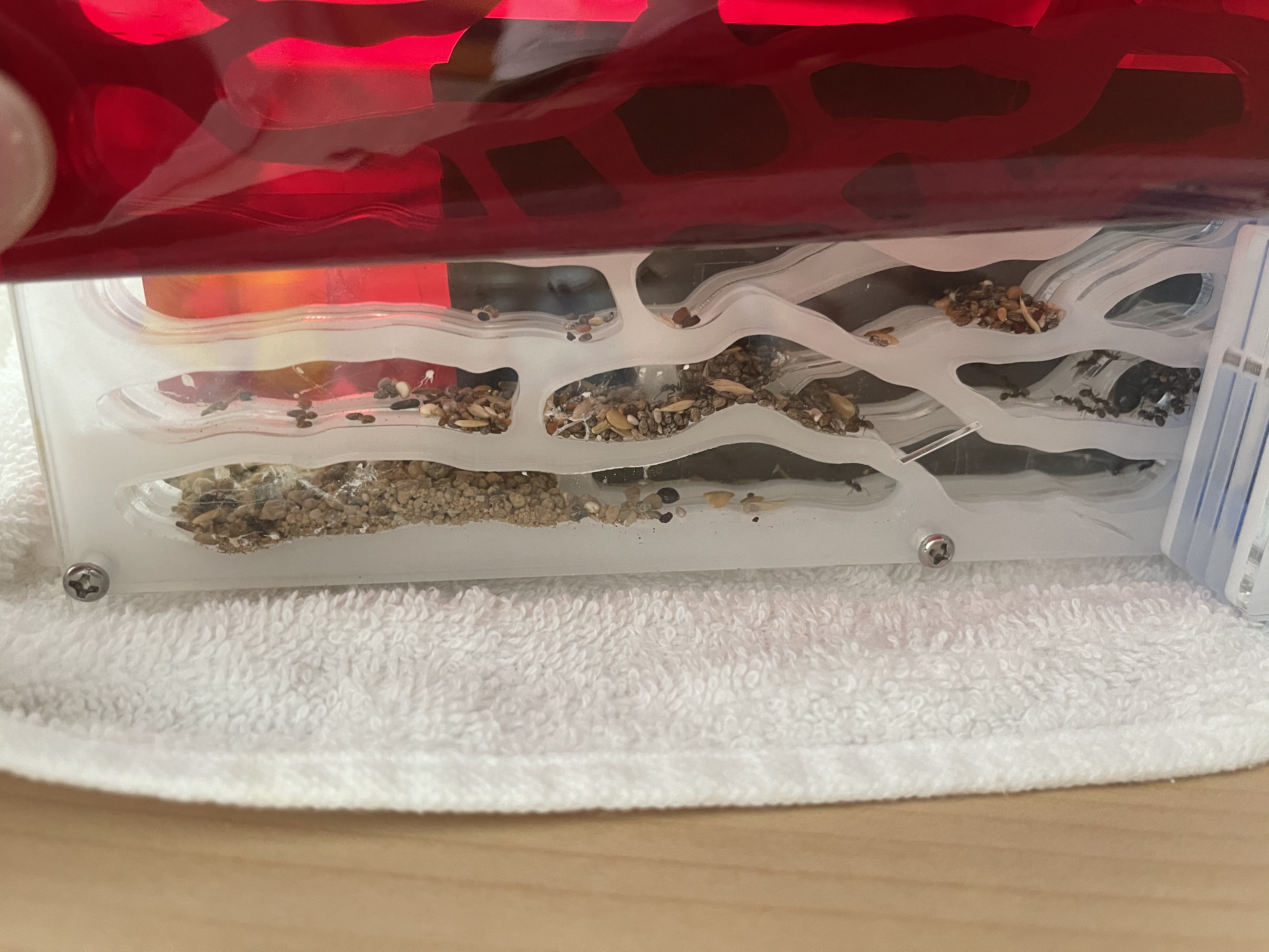 Sie nehmen Körner in andere Nestbereiche und zerlegen sie dort, überwiegend nahe in Brutbereich (