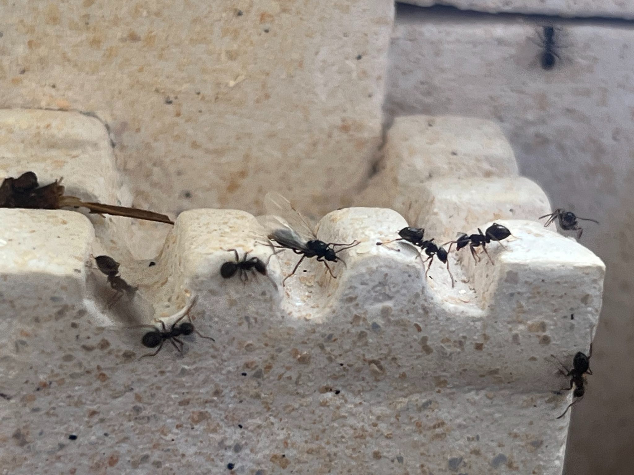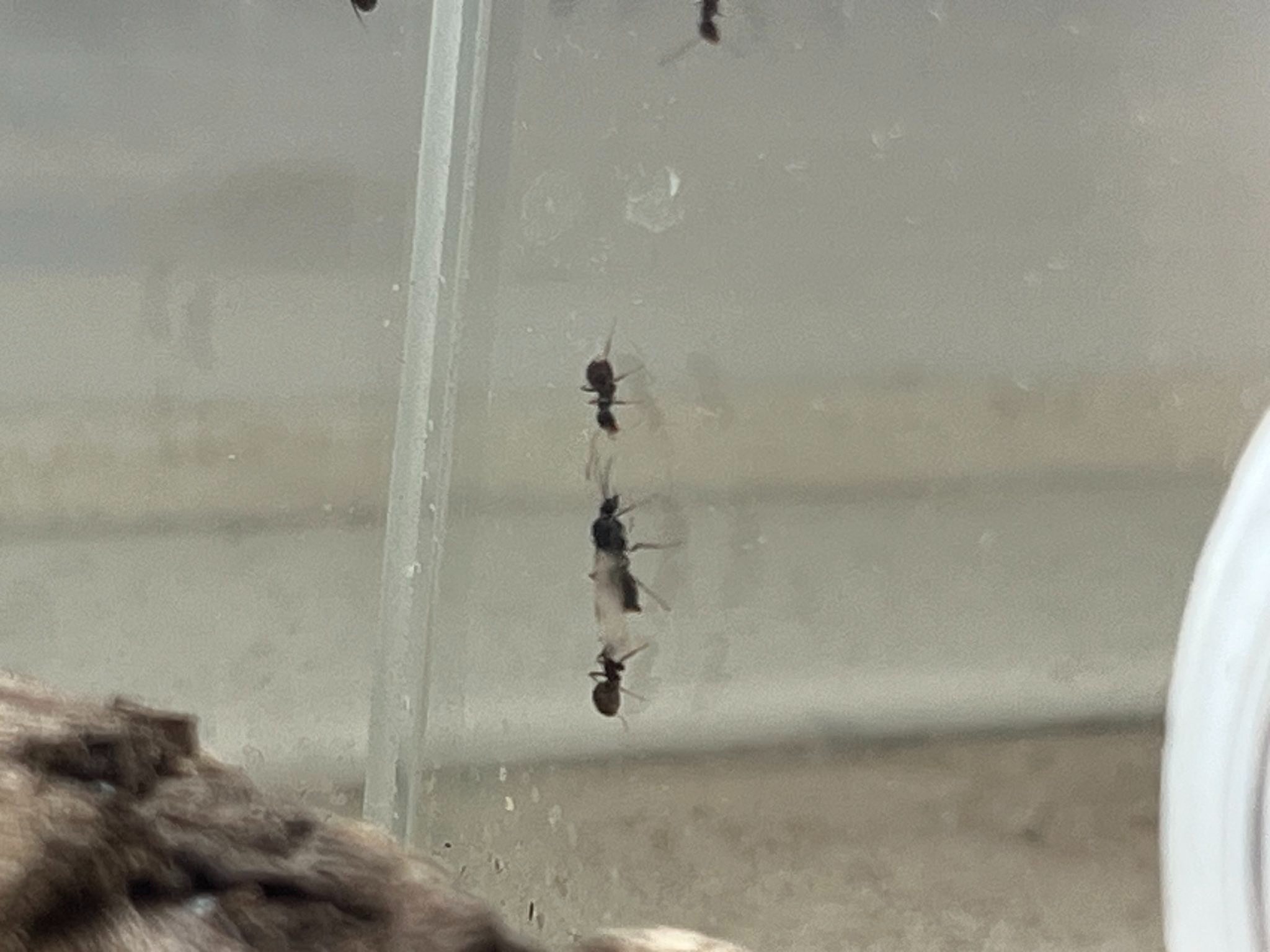 Der heutige Anblick war mir aber dennoch völlig neu. Zunächst nahm ich an, dass sich ein Futtertier unerklärlicherweise in das geschlossene System geschlichen hat. Dann bemerkte ich, dass meine Arbeiterinnen diesem allerdings nicht feindlich gestimmt sind. Bei genauerem Hinsehen erkannte ich, dass sie sich sogar um das mir fremde Wesen kümmern. Dann erkannte ich, dass eine Ameise Flügel ausgebildet hat