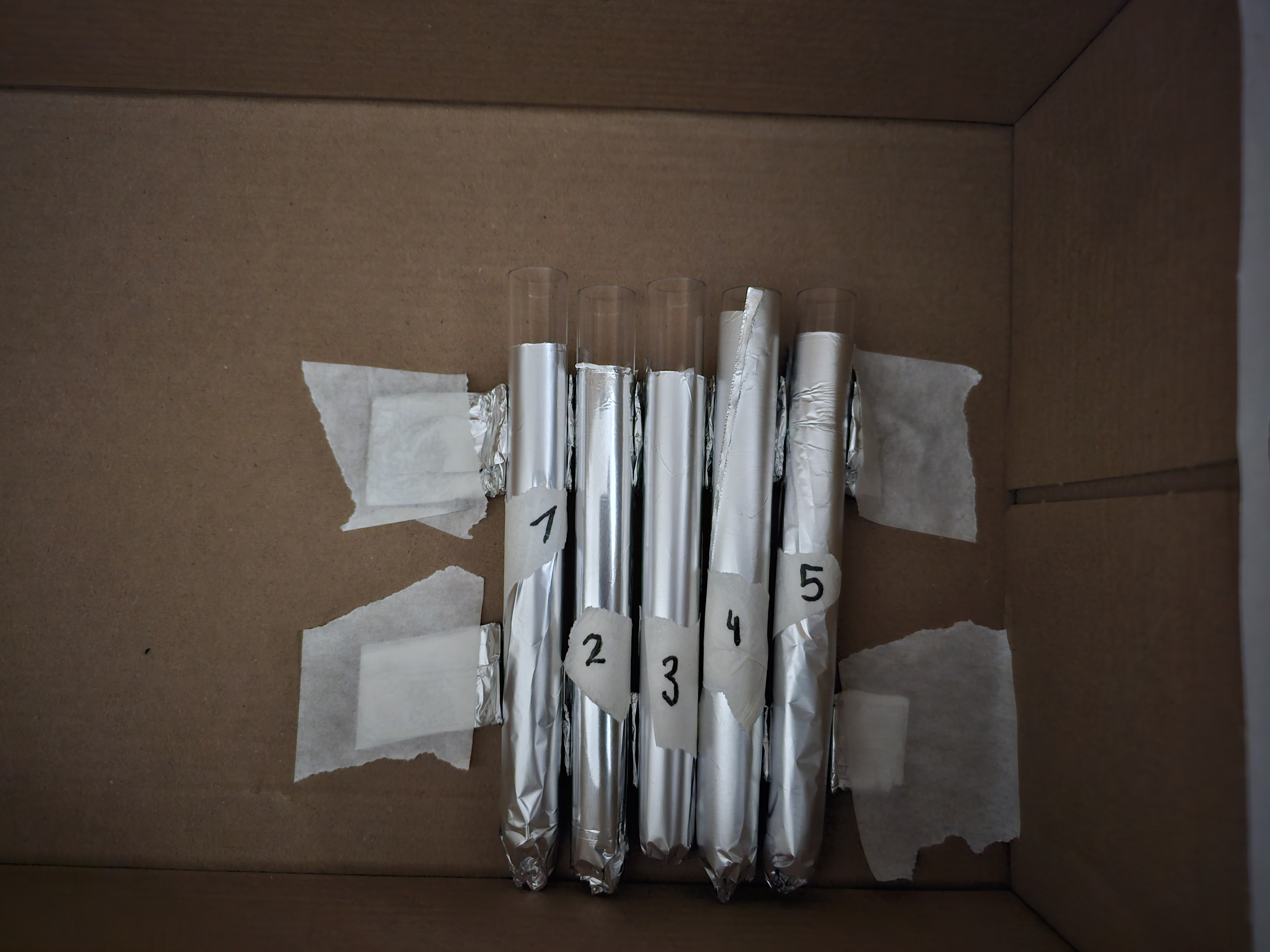 Ich habe die Reagenzgläser jetzt in Alufolien hülsen gesteckt. Diese liegen jetzt auf einer gewagten Alufolienkonstruktion die ich in einen Schuhkaton geklebt habe(Bild im Anhang - bitte um feedback).