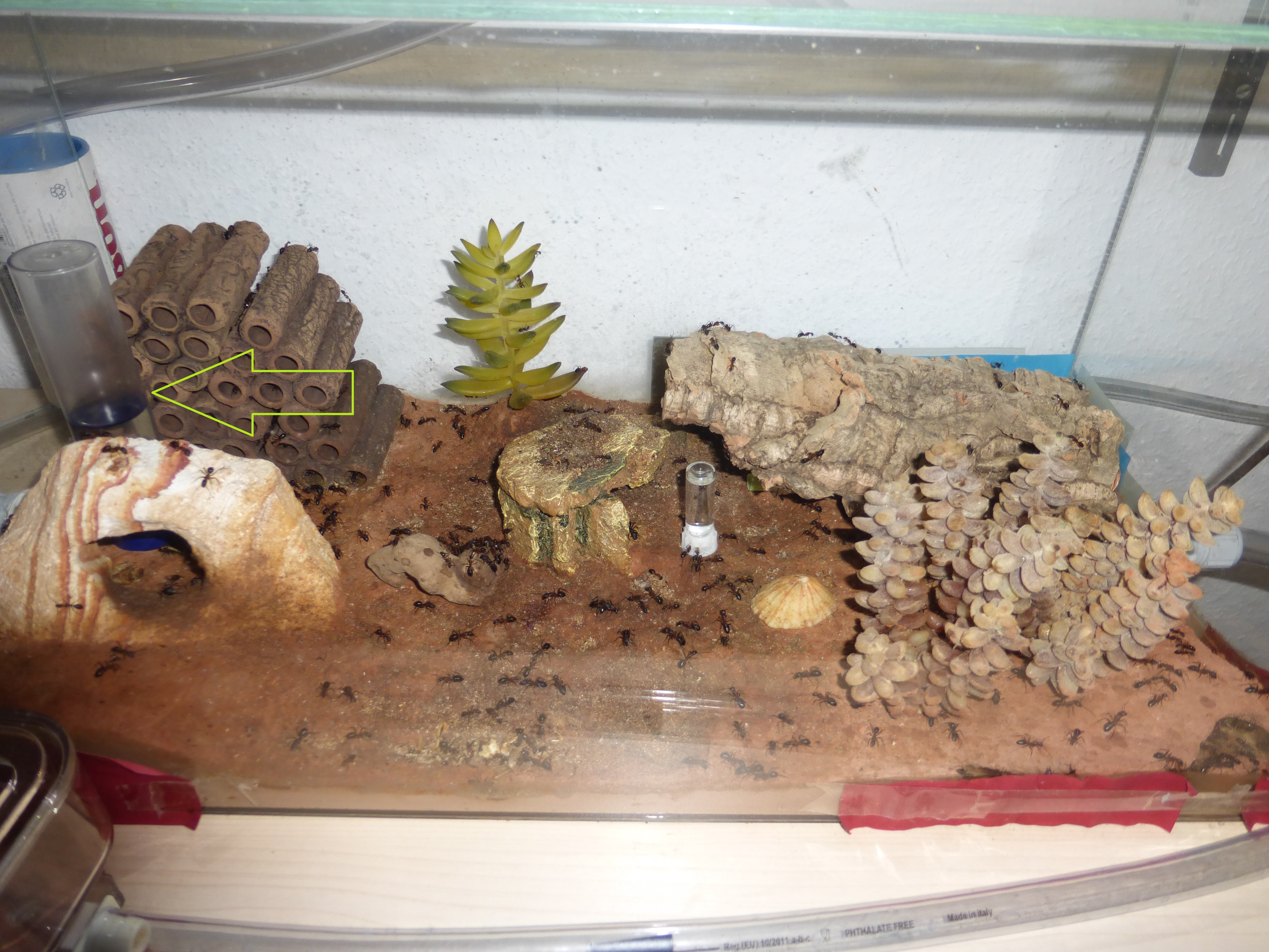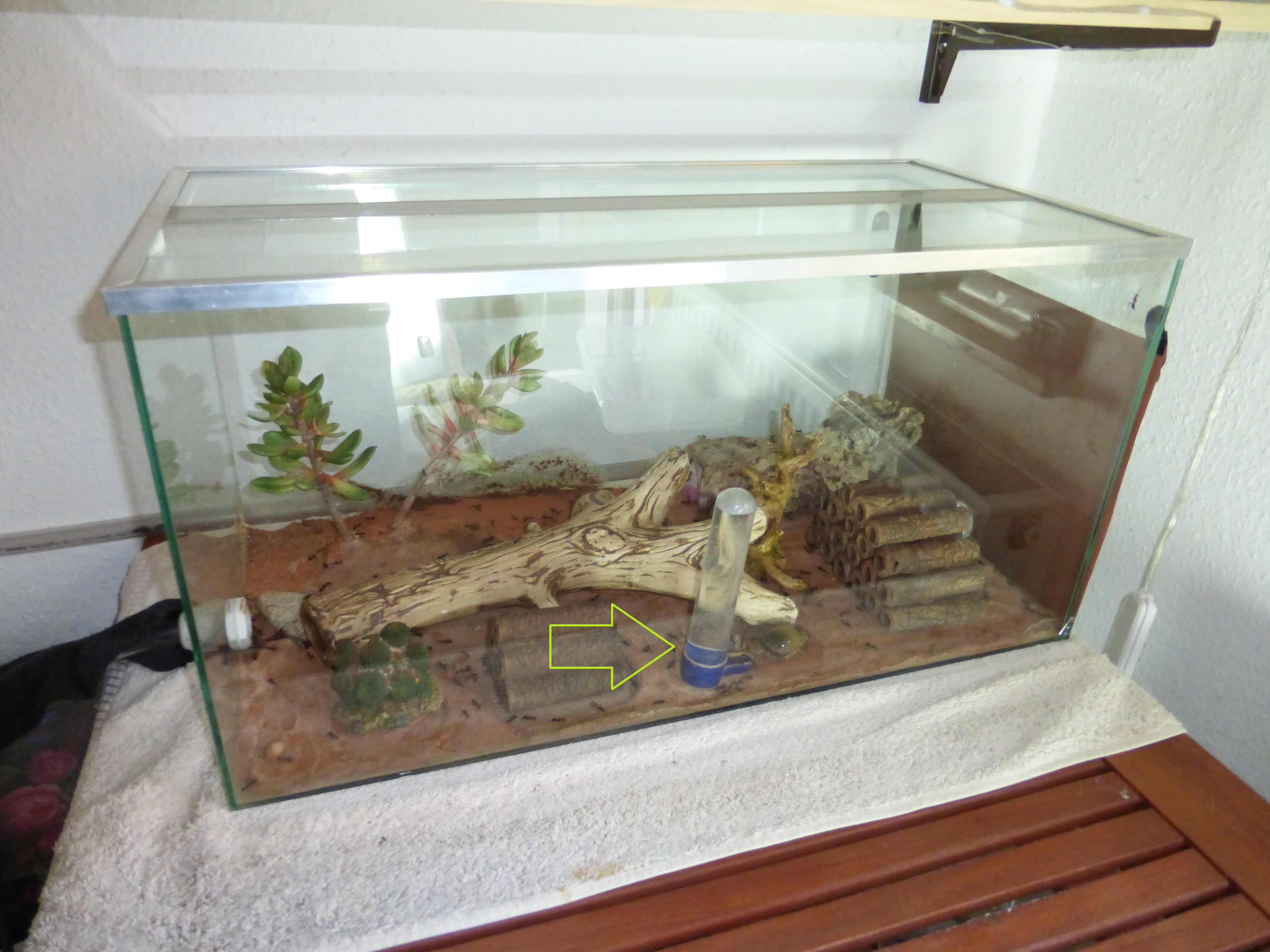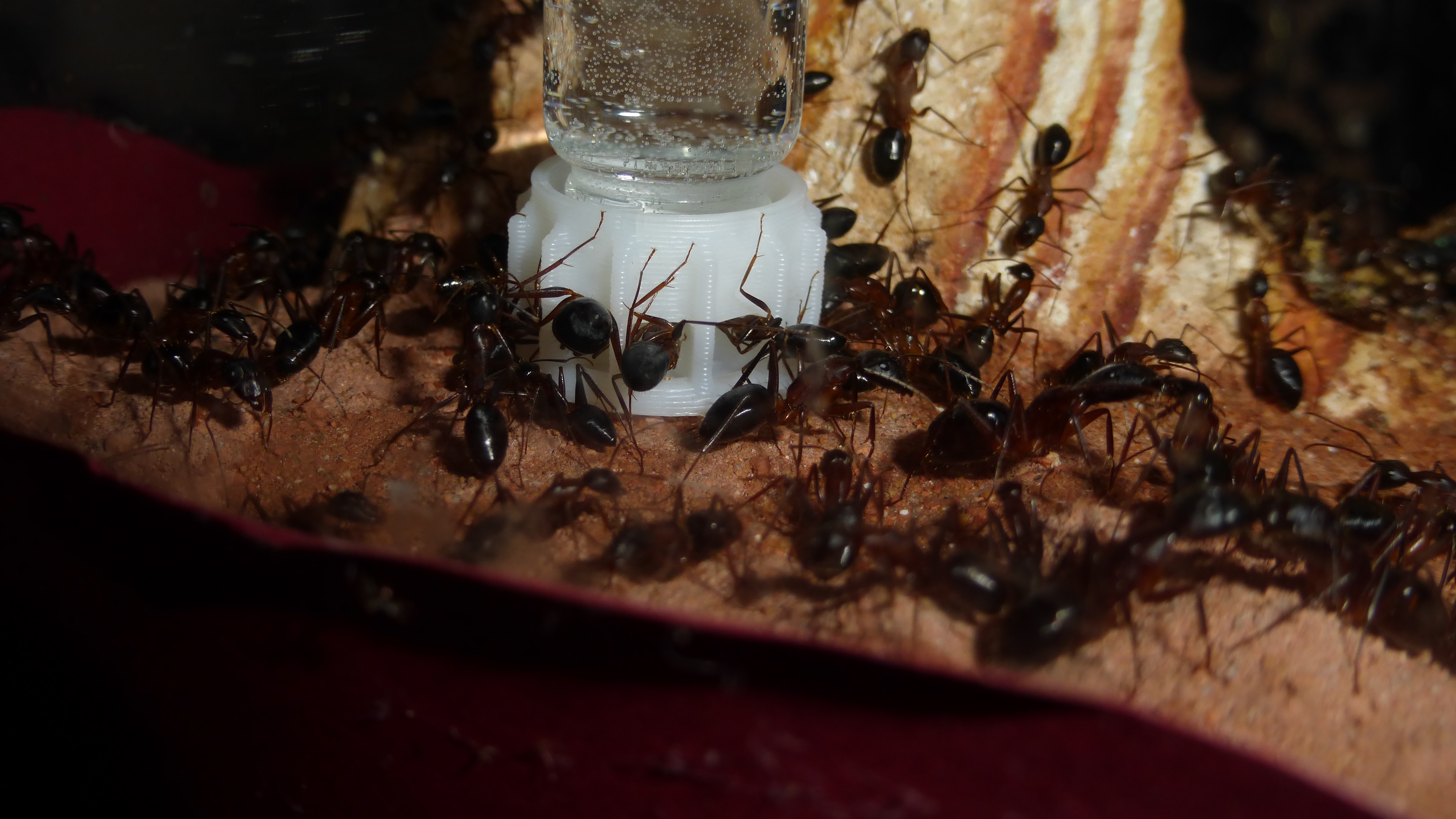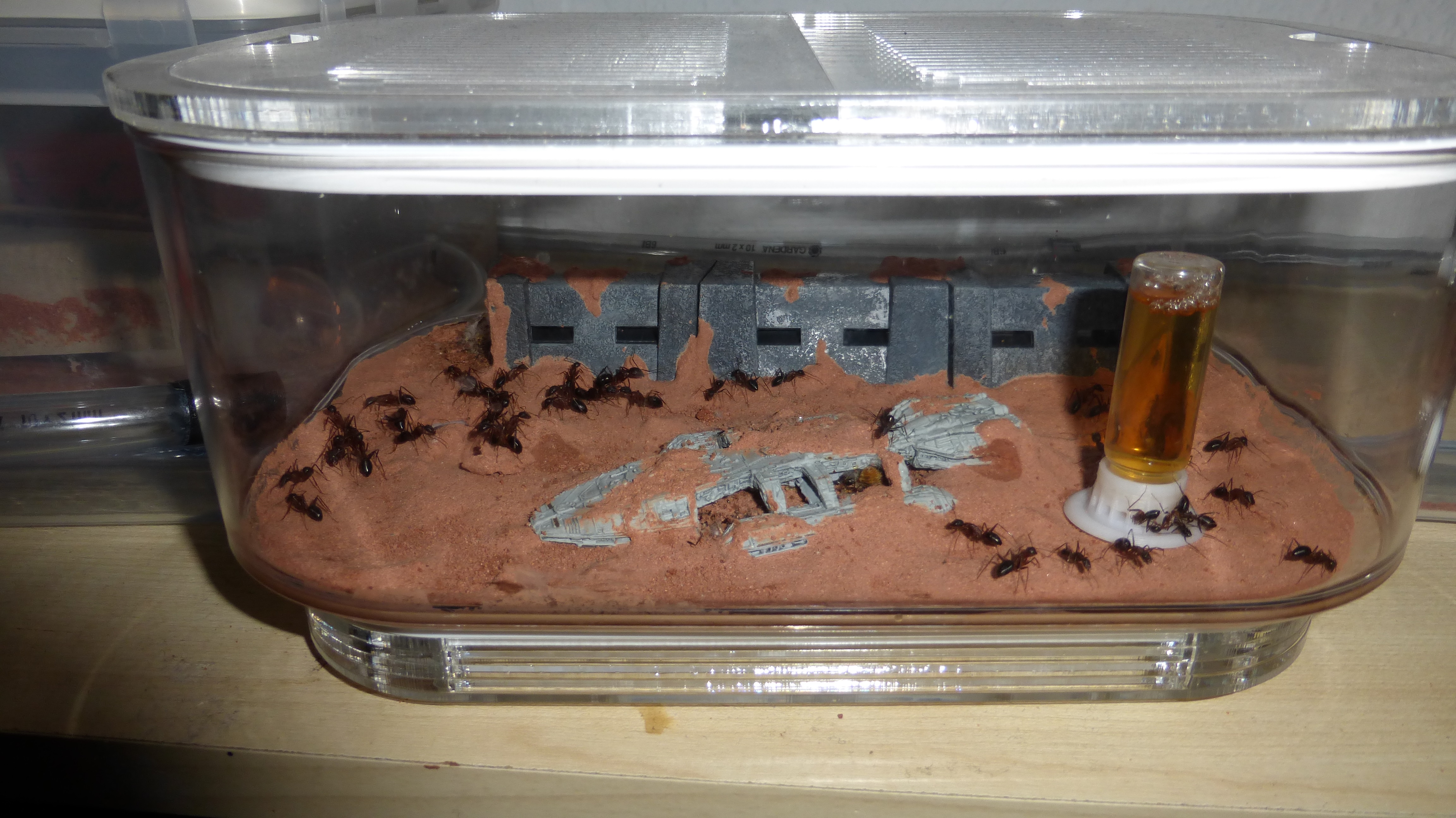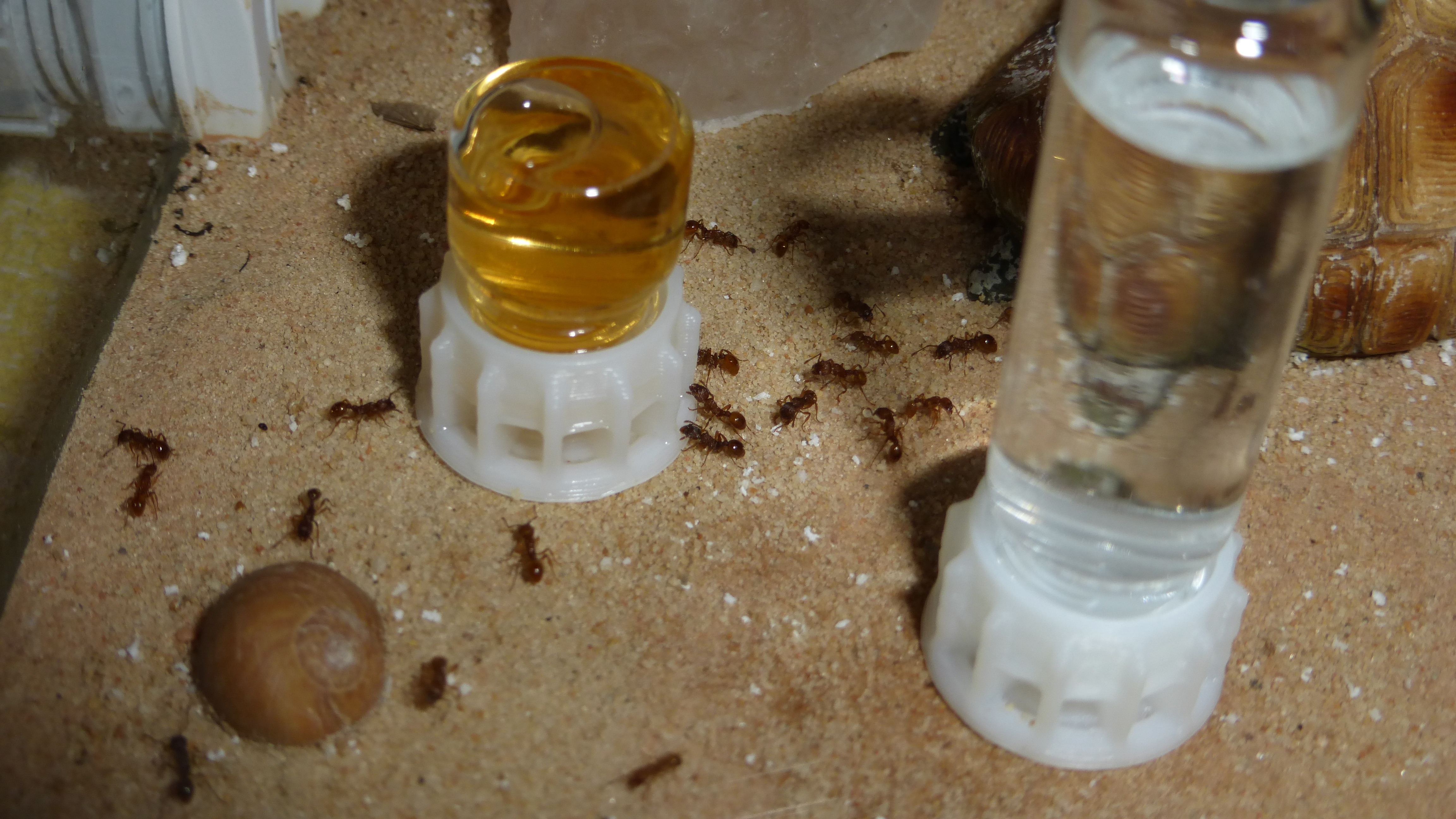 Ich habe bisher 2 ReagenzglĂ€ser verwendet zum fĂŒttern. In dem einen ist Wasser und in dem zweiten Honigwasser und diese mit Watte verschlossen. Quasi wie bei einer frisch gefangenen