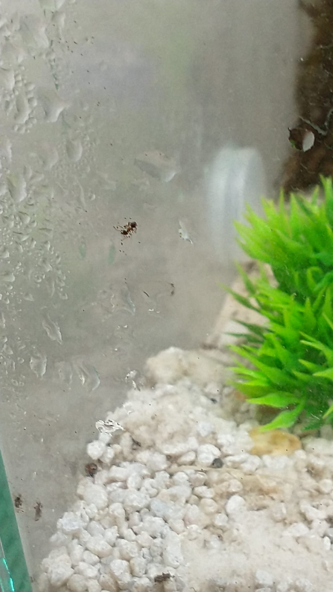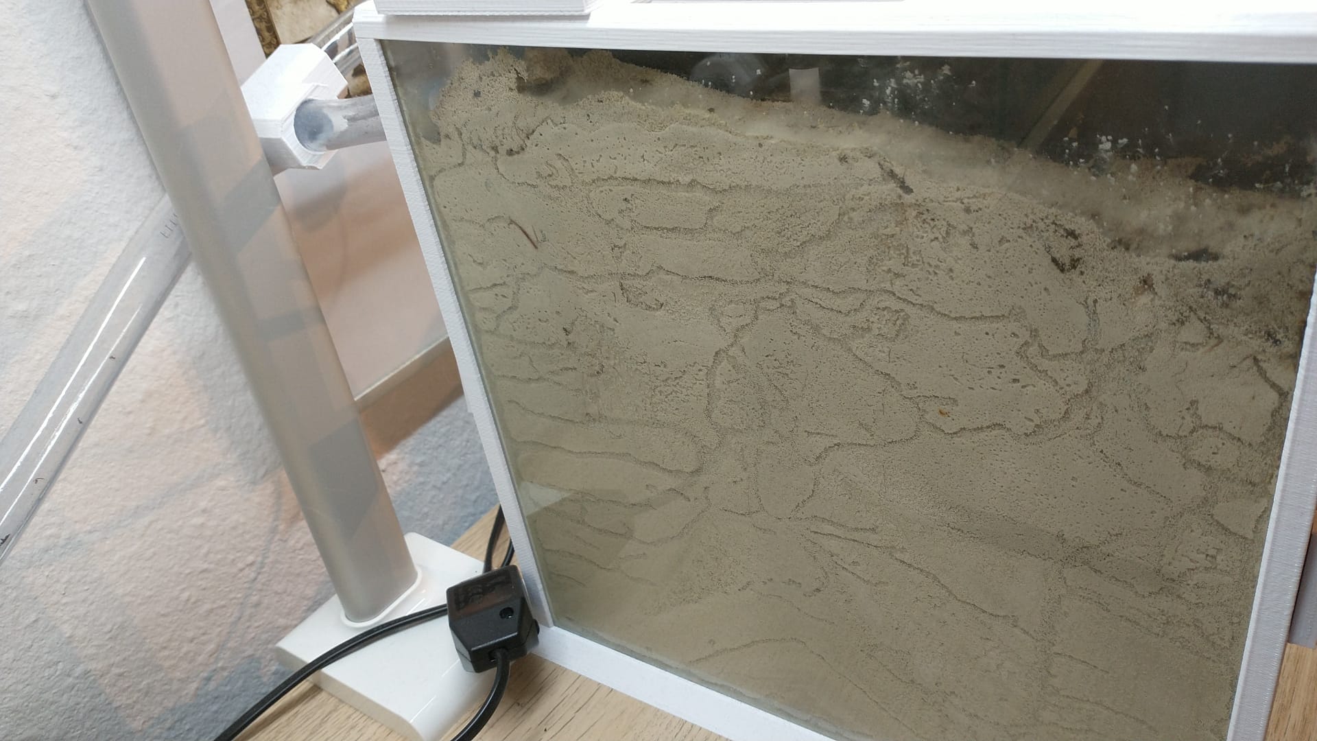 Nachdem Wetterumschwung (20 Grad weniger) habe ich die Heizmatte unter der Arena angemacht, wodurch sich Kondenswasser an den Scheiben sammelte.