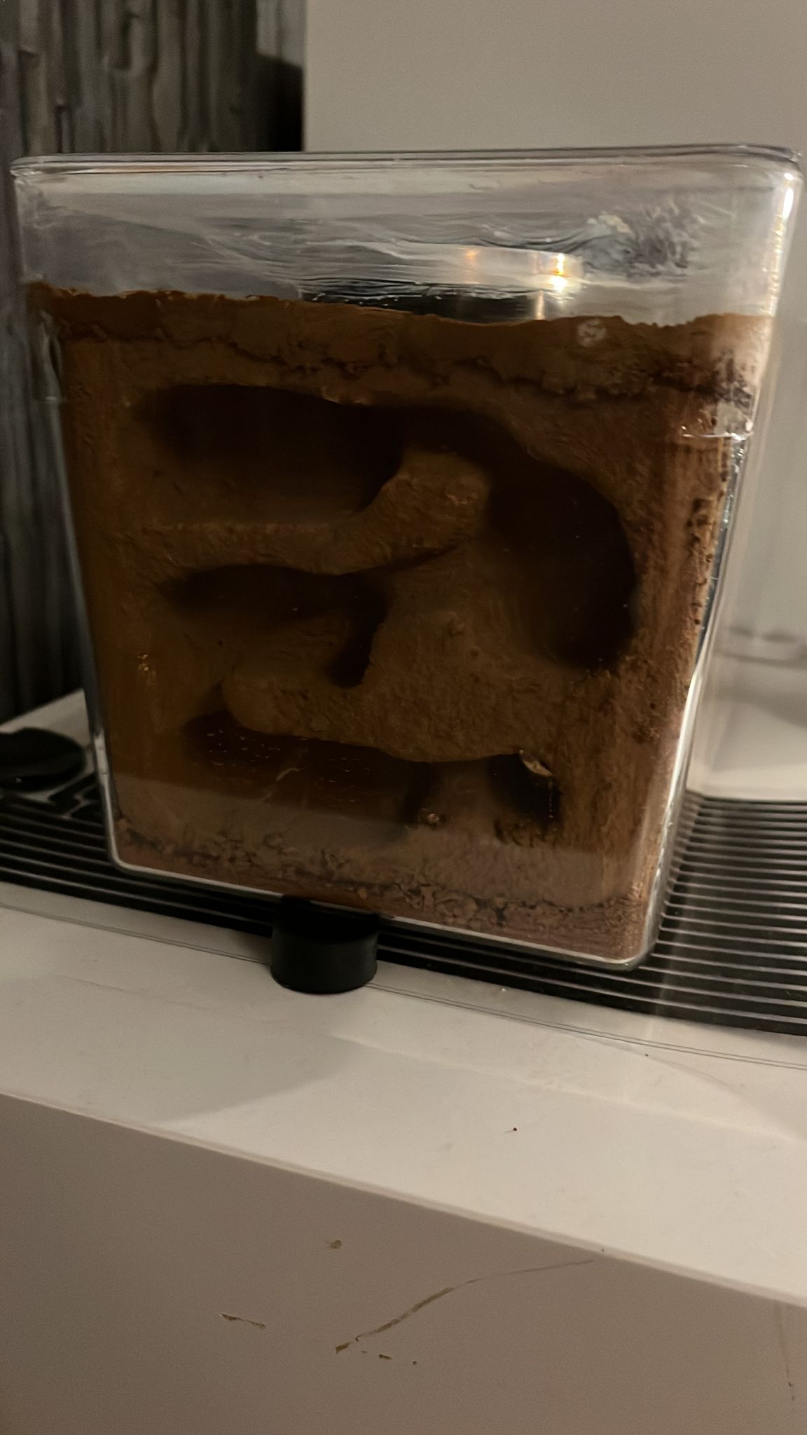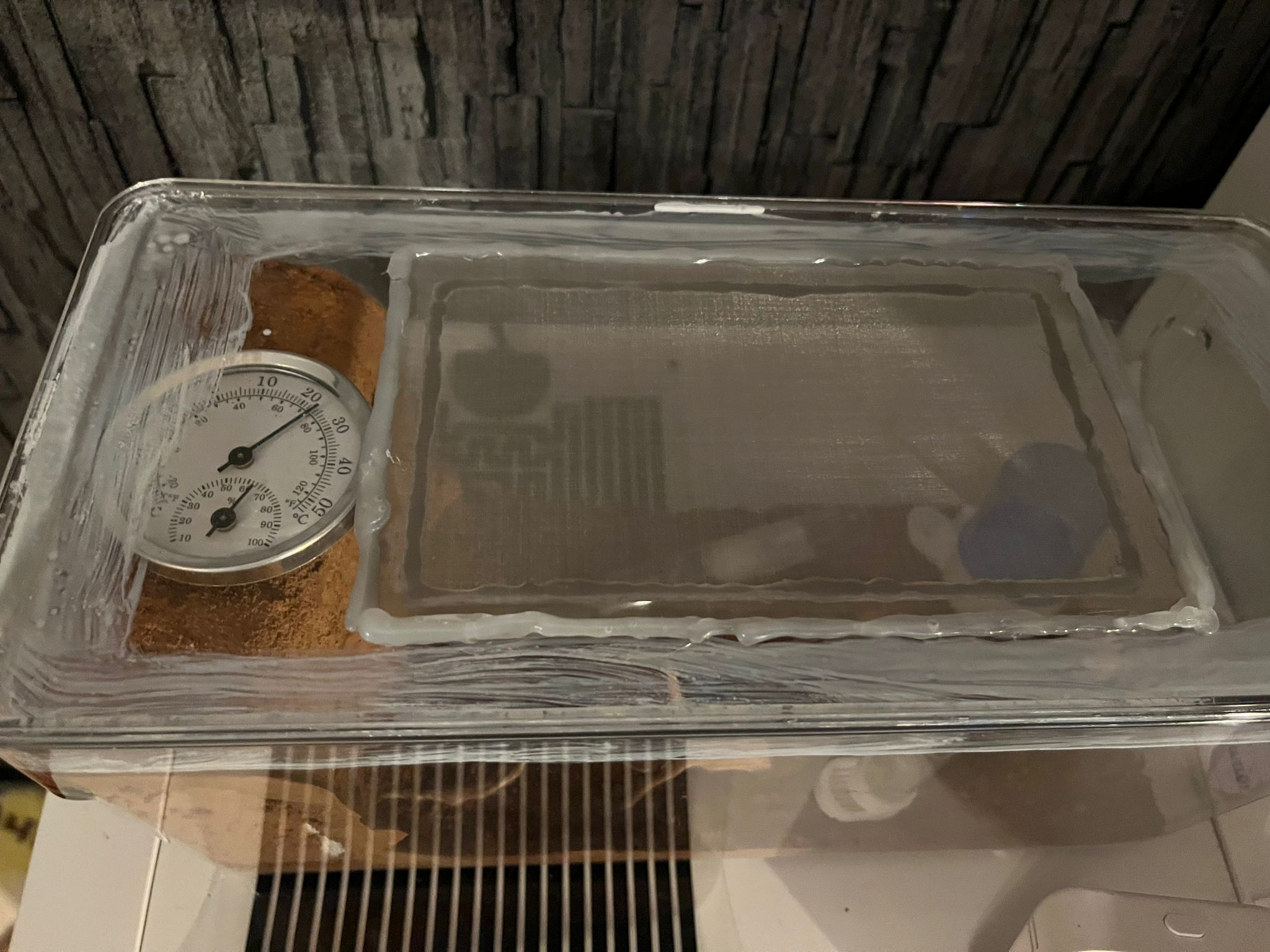 Ich habe ein selbstgebautes Ytong-Nest zur Verfügung gestellt, ebenso eine Heizmatte unter der Box und Mesh zur Belüftung auf der Box.