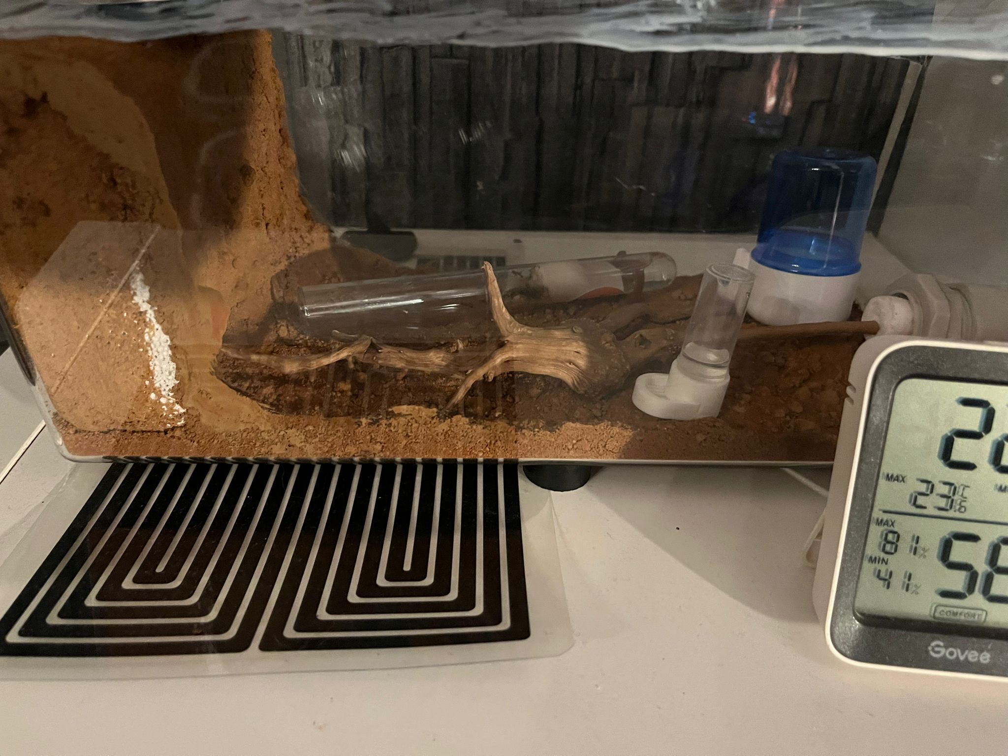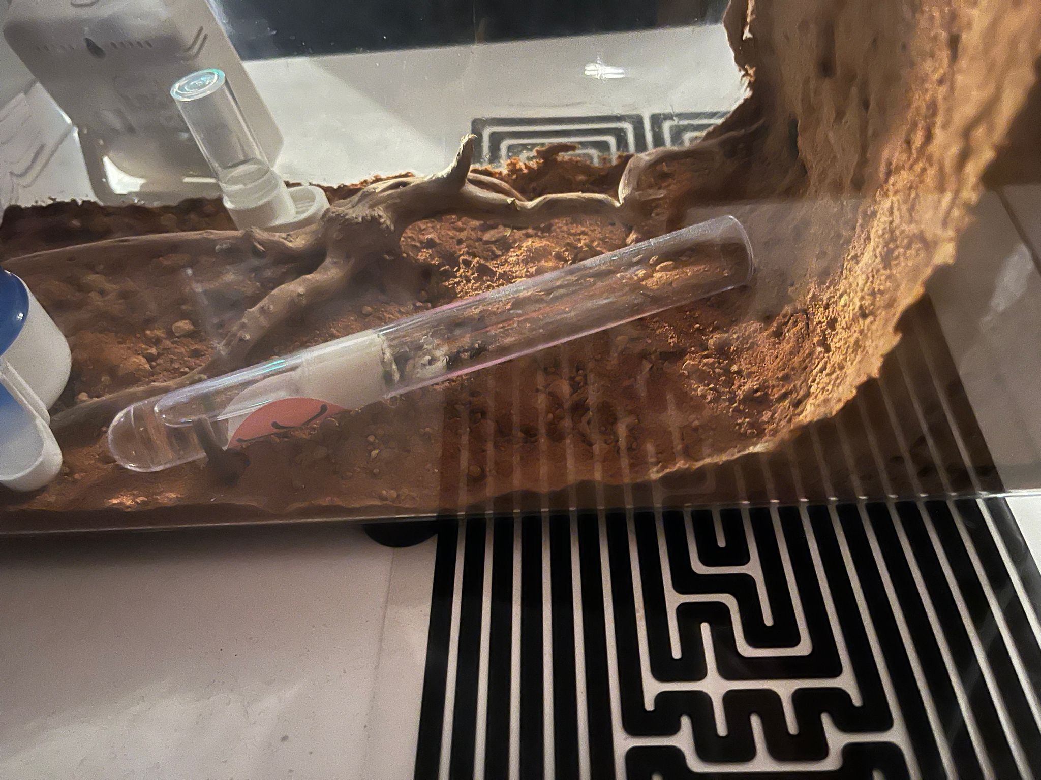 Anfangs habe ich das Reagenzglas mit einer kleinen Reagenzglas Arena verwendet, mittlerweile liegt das Reagenzglas offen in der großen Klippkaktus Box (schwedisches Möbelhaus).