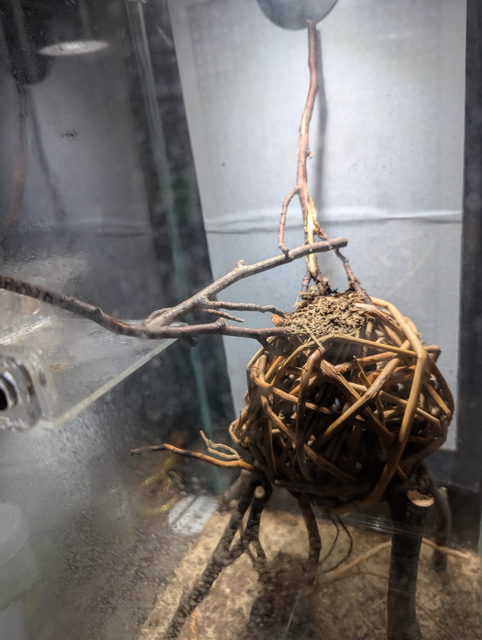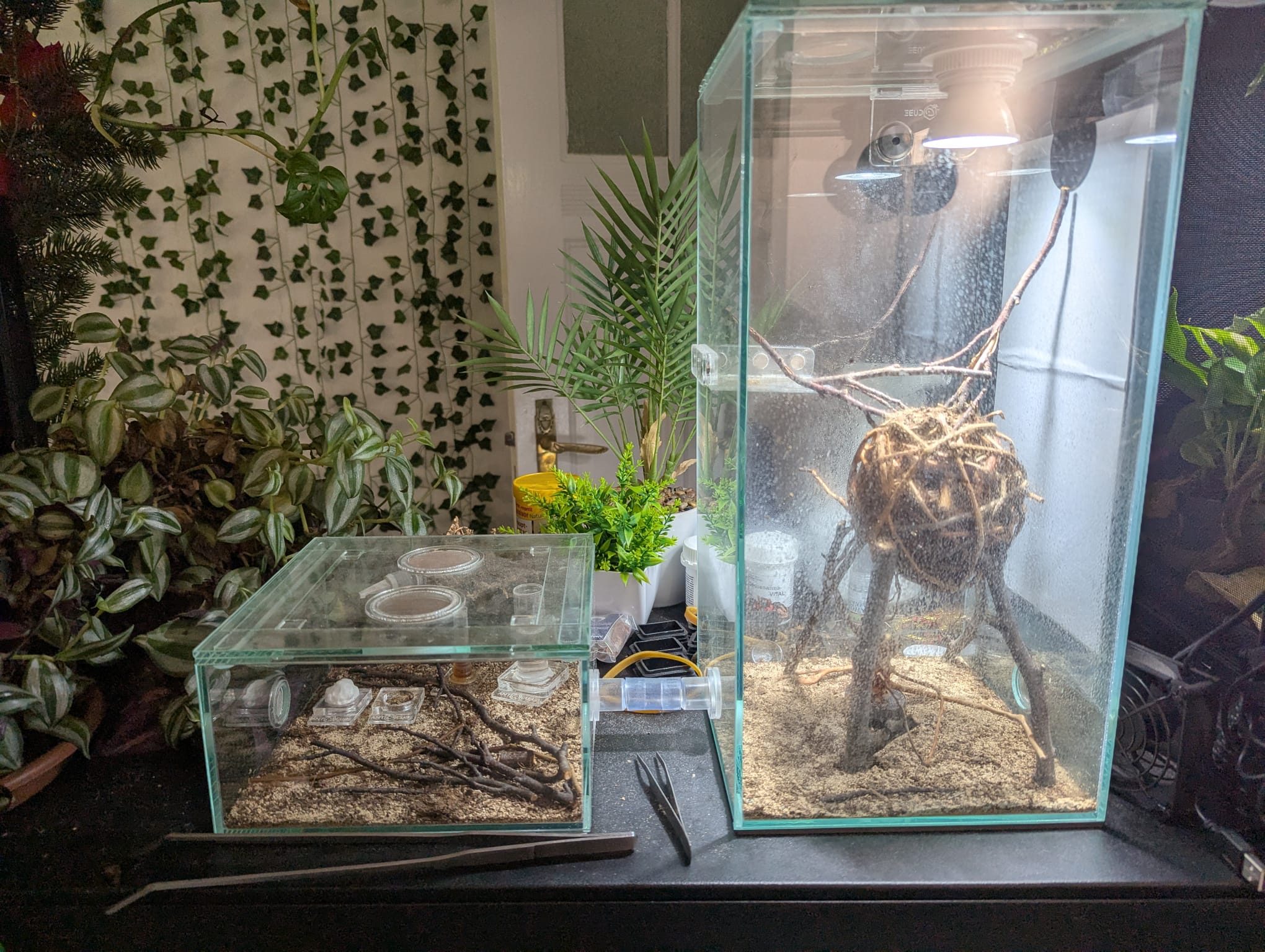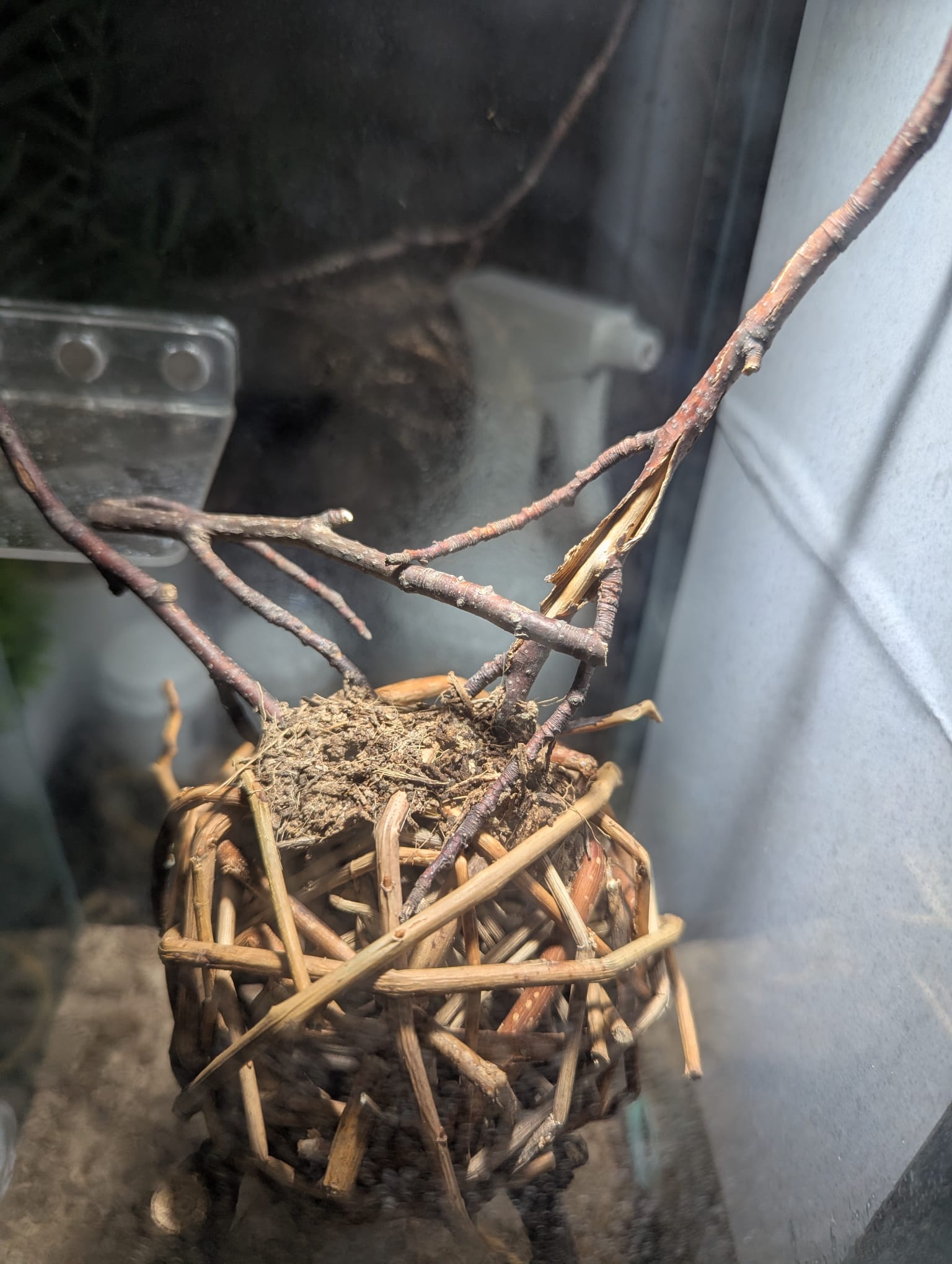 Zum Setup: ich habe 2 Arenen. Eine Futterarena 20x20x10 mit Luftfeuchtigkeit 45-55% und Temperatur 21-23 Grad (Also einfach die Zimmerwerte, welche sich natürlich je nach Jahreszeit und Tageszeit leicht verändern). Außerdem die Nestarena mit Nestkugel. Etwas Wärmer und feuchter durch eine 5W-LED und eine Heizmatte. Dort kommt es auf ca 28-30 Grad. Im Sommer mache ich die natürlich aus. Ich sprühe alle 2 Tage oder wenn ich sehe, dass die Luftfeuchtigkeit unter 50% fällt. Sonst habe ich dort eigentlich eher so 65-70%. Frisch nach dem sprühen natürlich feuchter.