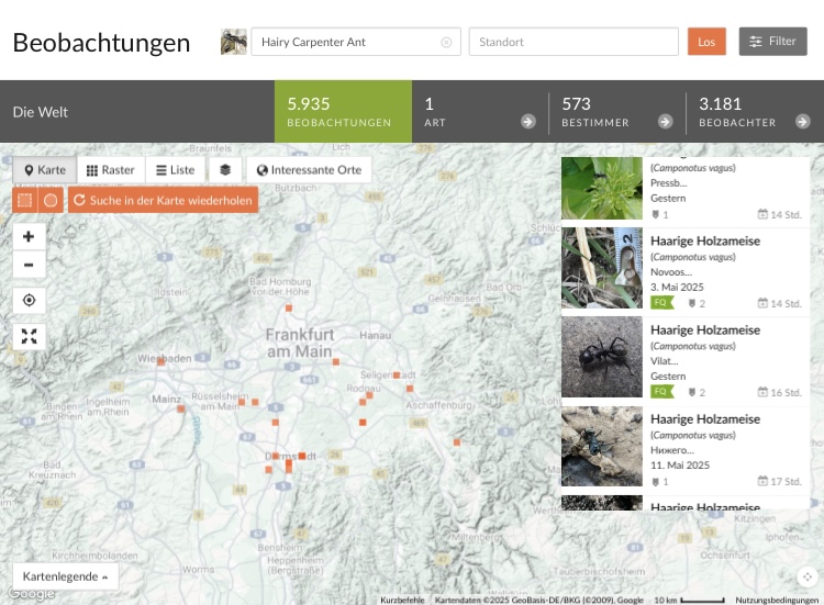 Oh, sind die wirklich so selten? Ich habe auf https://www.inaturalist.org/observation ... _id=343182 einige Fundmeldungen gesehen, bei denen Nutzer dort Kolonien von Camponotus vagus markiert haben. Das spricht ja dafür, dass sie sich in dieser Gegend (also der Untermainebene) tatsächlich ansiedeln vermehren und auch schwärmen.