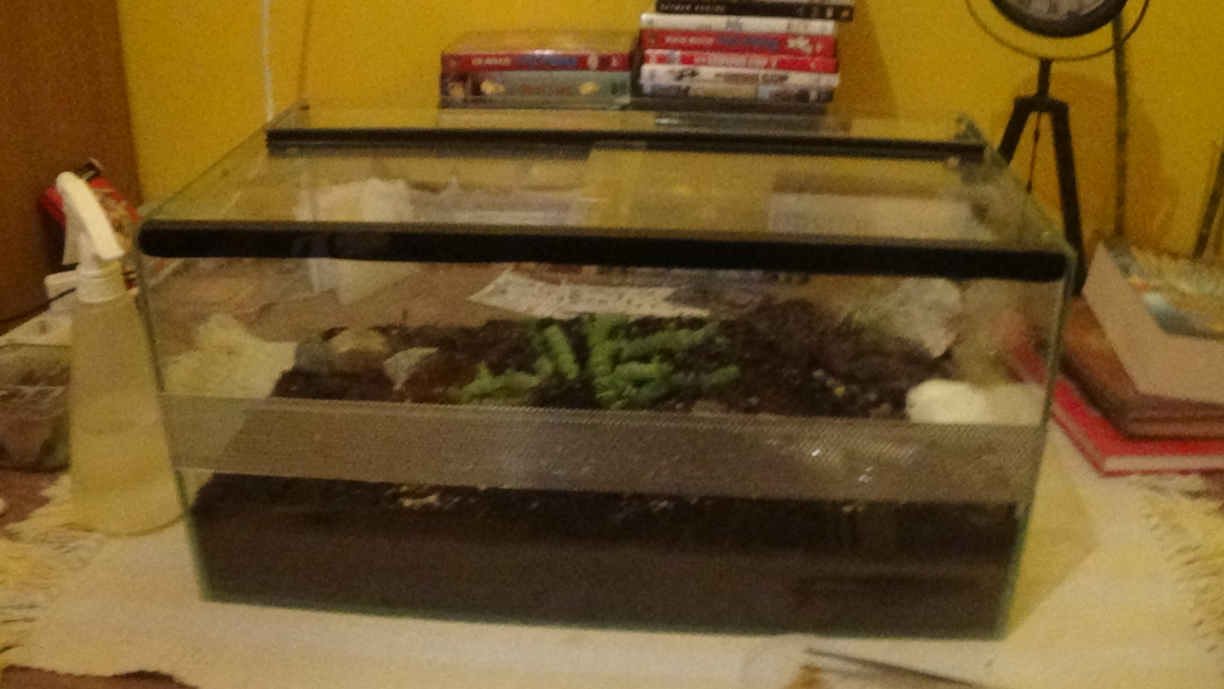 Als Futter hatte ich, tote und lebendige Kurzflügelgrillen, Honig auf Löffel, einen Apfel und Wasser in einem Reagenzglas.