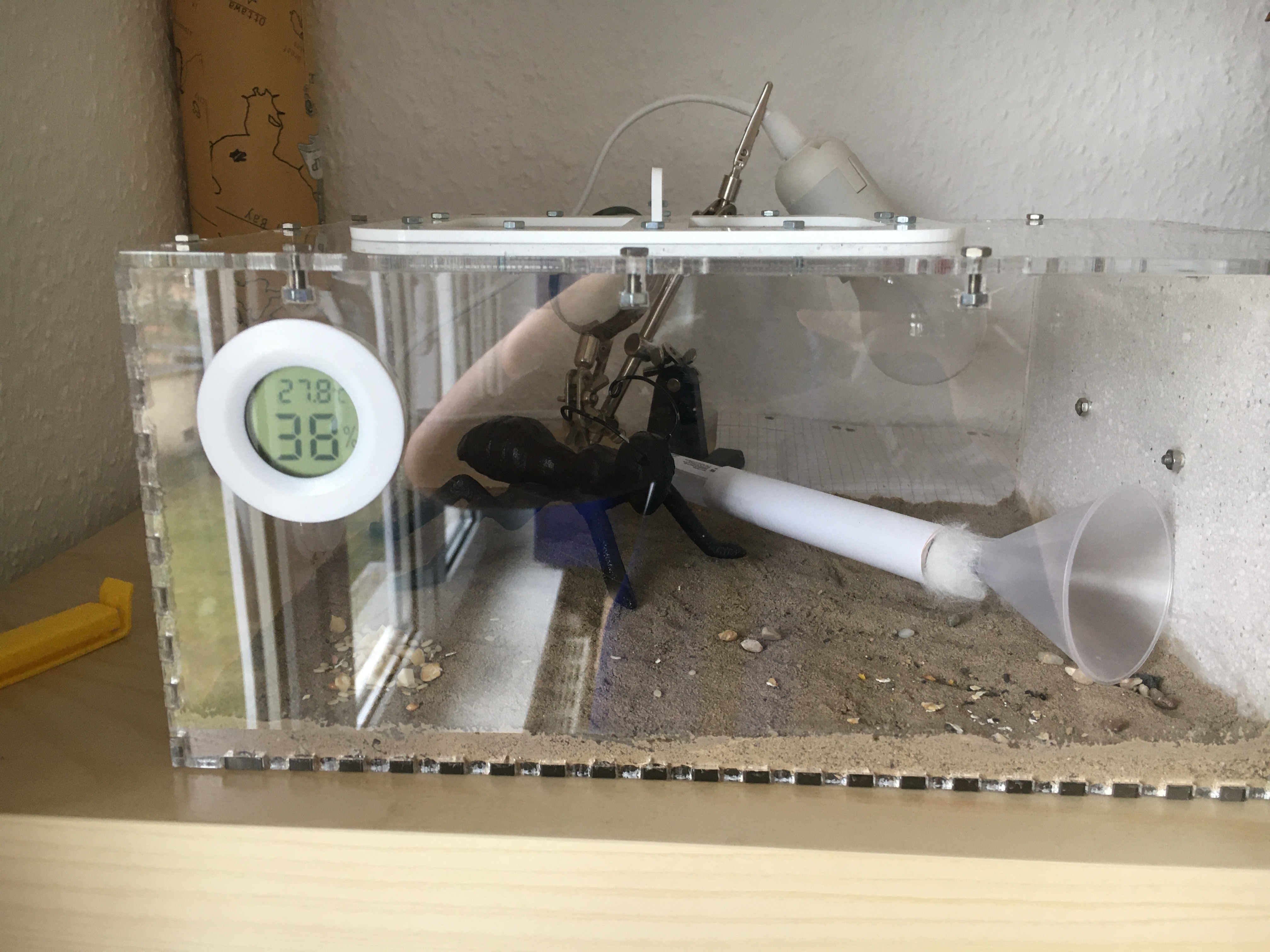 Nun weiß ich leider nicht einzuschätzen, wie es meinen Schützlingen geht. In den ersten Tagen hat sogar 1-2 Mal die Königin das Reagenzglas verlassen, ist seitdem aber drin geblieben. Es sind immer mal wieder 1-5 Arbeiterinnen unterwegs, aber generell zeigt sich nicht viel Aktivität. Ich warte eigentlich darauf, dass sie in das Yton-Nest umziehen, aber sie haben es bisher immer komplett ignoriert. Es gab maximal Vorstöße in den Eingang, mit sofortiger Umkehr. Heißt das, dass die Haltungsbedingungen dort nicht gut sind? Ich sehe links Kondenswasser, was eventuell von zu starker Befeuchtung zeugt, aber die anderen Kammern werden auch nicht erkundet. Könnte es zu kalt sein, da die Lampe von der anderen Seite strahlt? Im Zimmer sind immer ca. 20°C.