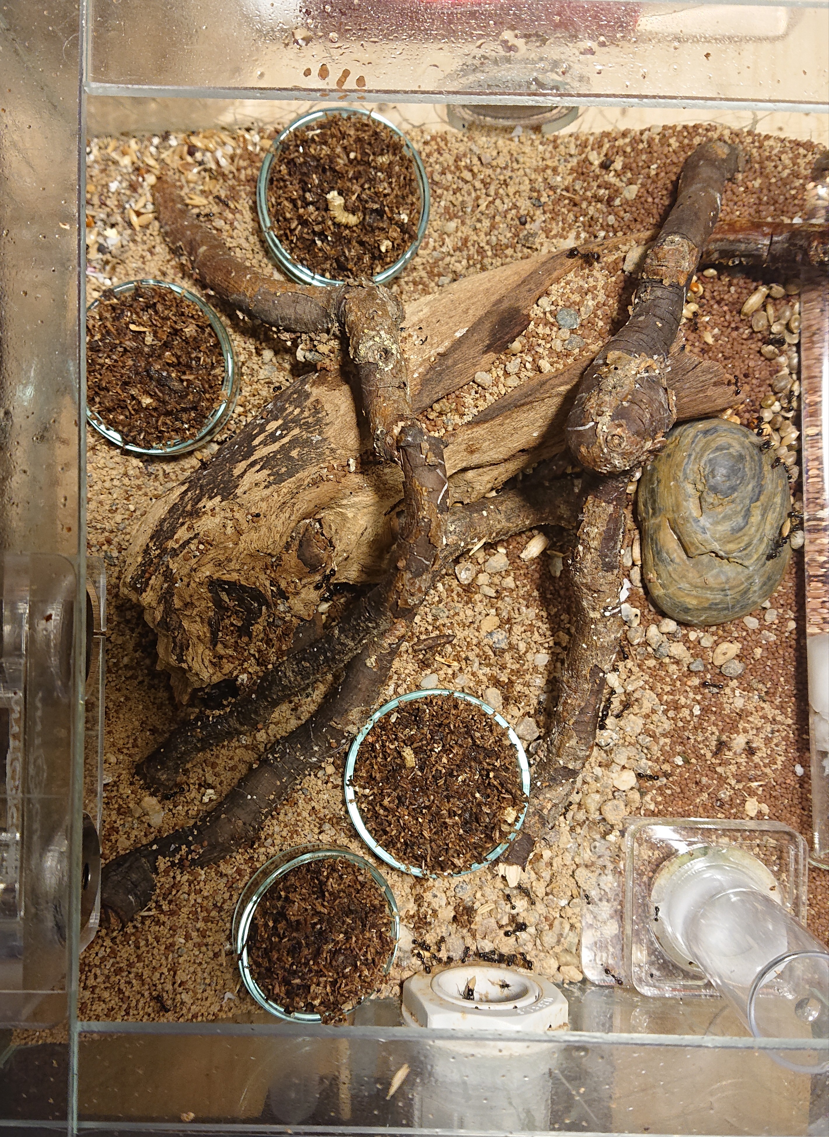Da die Raubmilben es aber ebenfalls feucht mögen, glaube ich nicht, dass dies bei trockenen Bedingungen hilft. Er meinte, er hat in der Milbenzeit nur wenig Tiere verloren. Er würde es auf 10 Tiere schätzen. Seine Kolonie bestand zu dem Zeitpunkt auf über 50 Tieren. Es gab keine Ameise, die nicht Milbenbefallen waren. Selbst die Königin war stark beeintächtigt. Die Königin hat keine einzige Milbe mehr am Körper und sorgt fleißig für Nachwuchs.