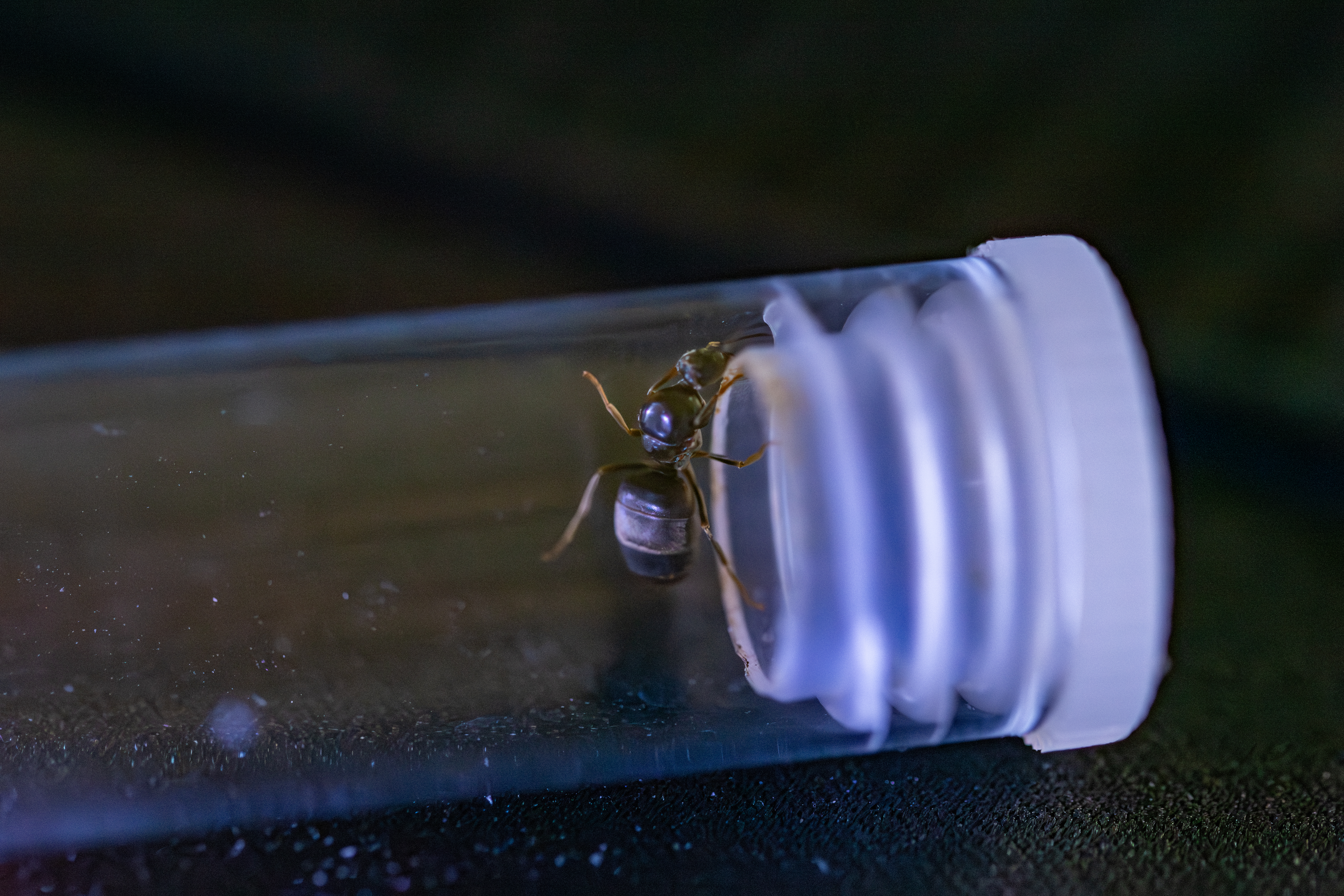 Ich habe mit dem Makroobjektiv versucht, so gut es geht, mit zusätzlicher Lichtquelle Fotos zu machen. Rumpf scheint etwas grösser und ich bilde mir auch ein, Ansätze von abgeworfenen Flügeln zu sehen.