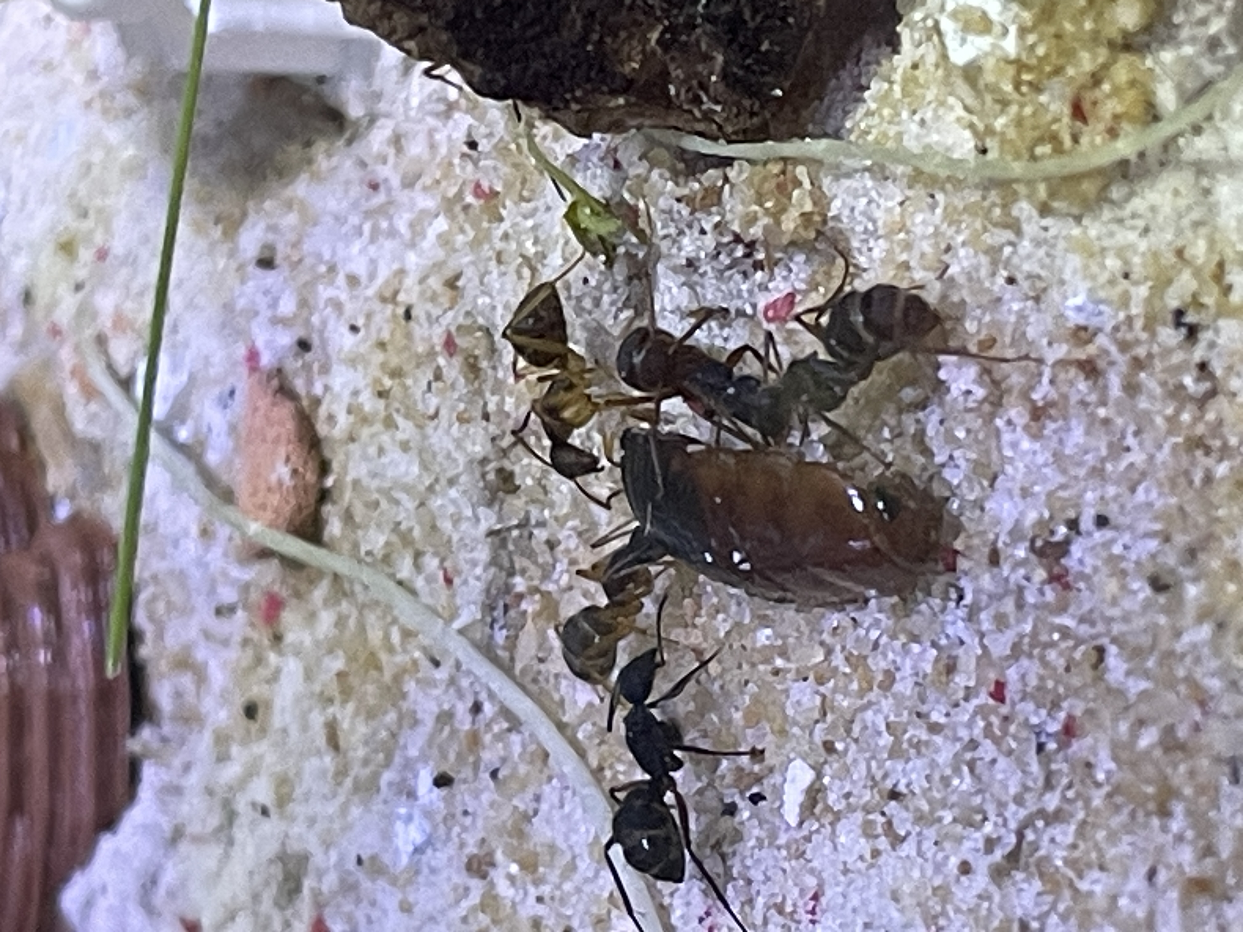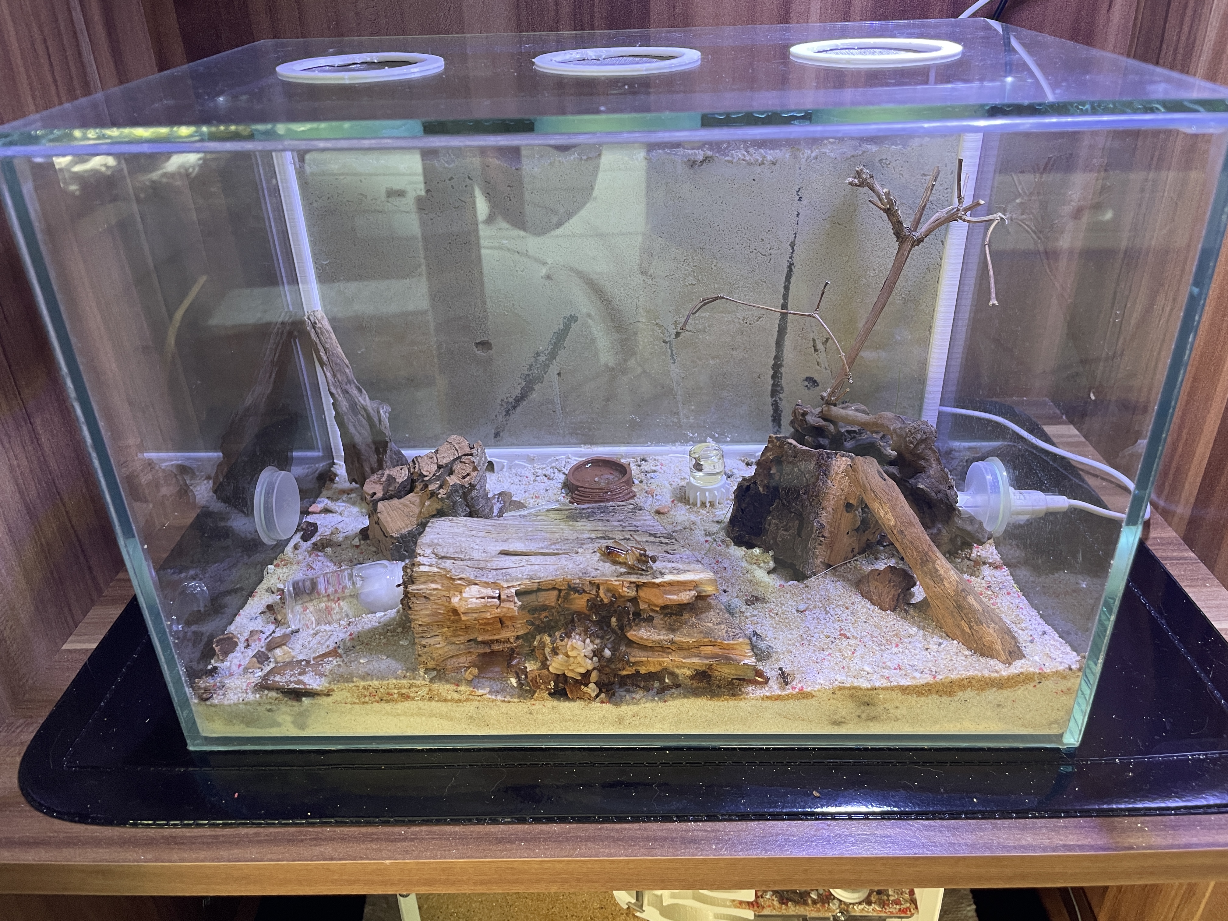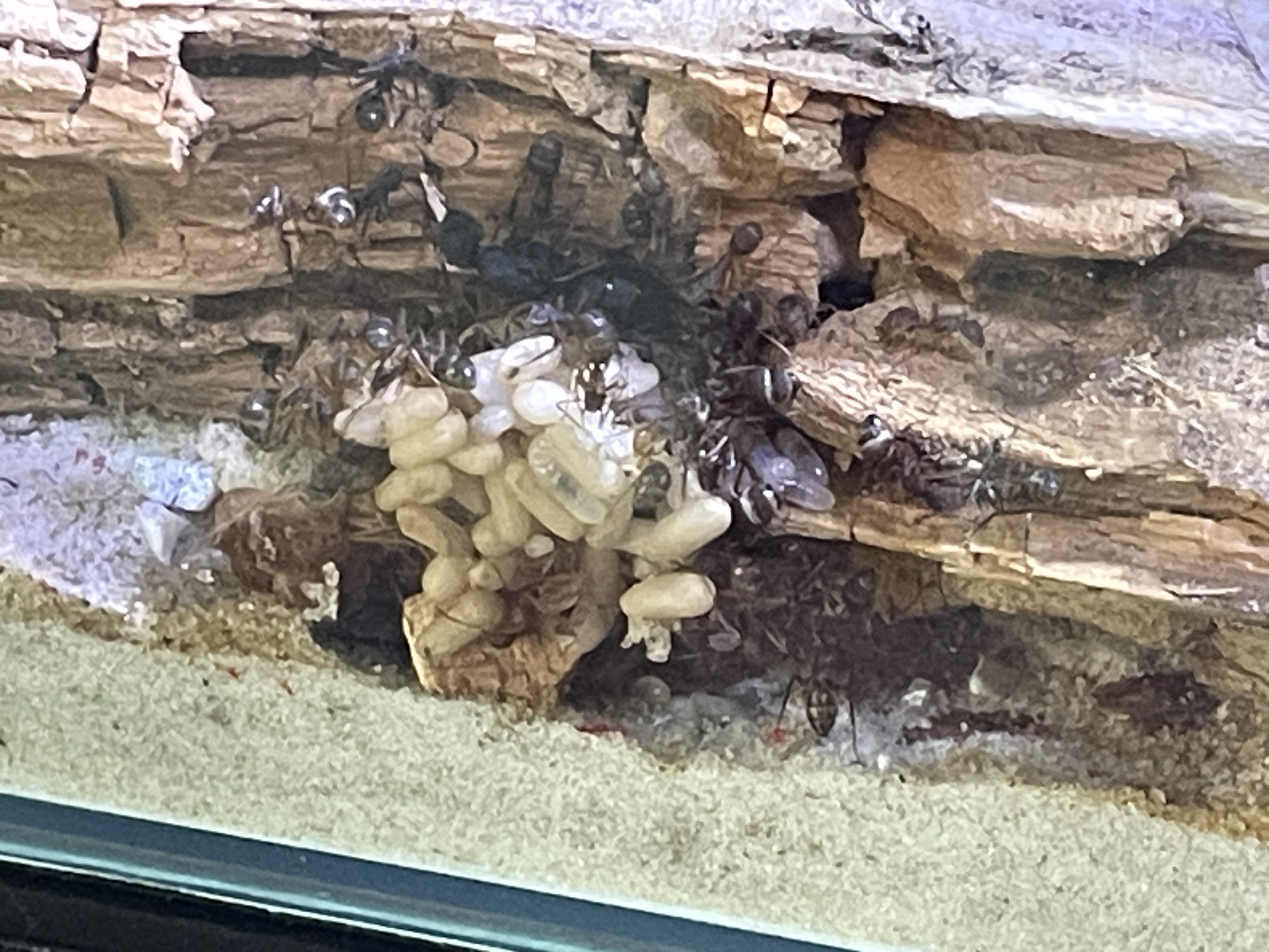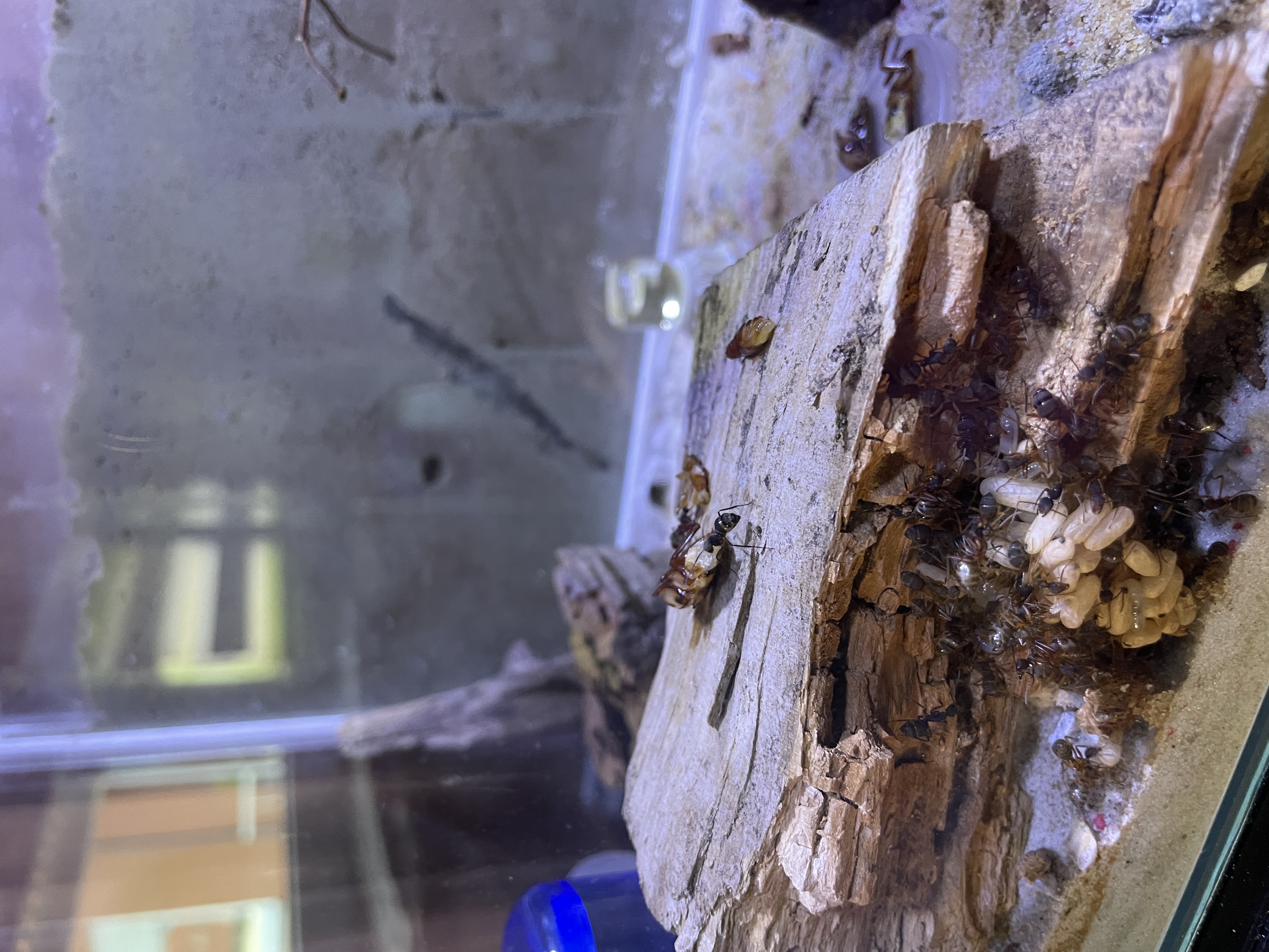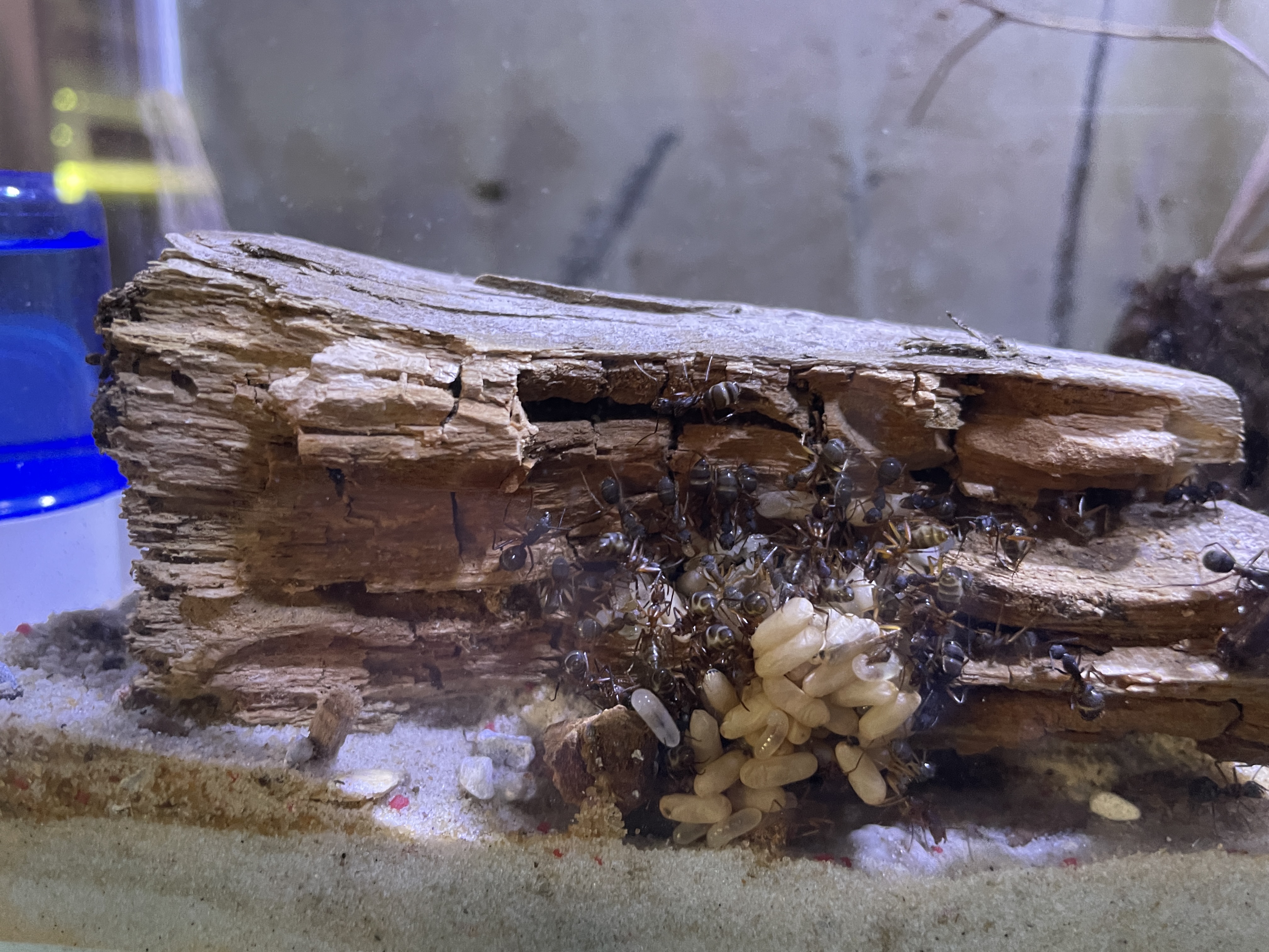 Das ist zwar schön, aber dein Setup bietet den Ameisen kein gutes Nest. Sie sind lediglich in der Not hinter ein Stück Holz gezogen, doch an dieser Stelle wird die Kolonie permanent gestresst sein. Die Kolonie liegt frei für die Außenwelt, und das wollen Ameisen in jedem Fall vermeiden. An dieser Stelle werden sie sich nicht wohl fühlen auf Dauer!