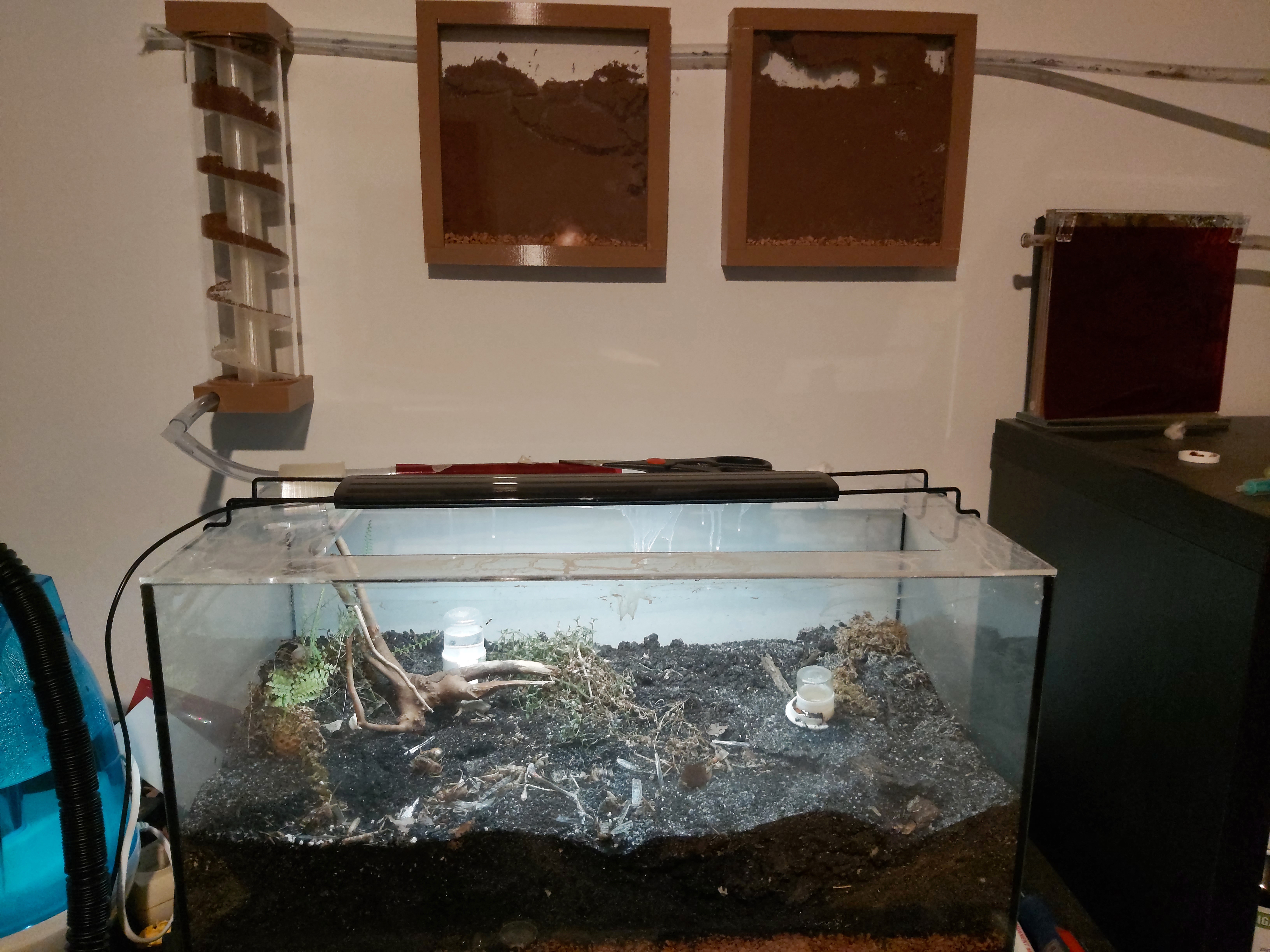 Zuerst ein paar Infos: Die Formicarien und Röhren an der Wand haben sie erst seit etwa zwei Wochen. Davor hatten sie nur das kleine Formicarium ganz rechts mit der roten Folie sowie die Arena (60×30×30 cm, ca. 10–15 cm Erde). In der Arena haben sie definitiv Zweignester.