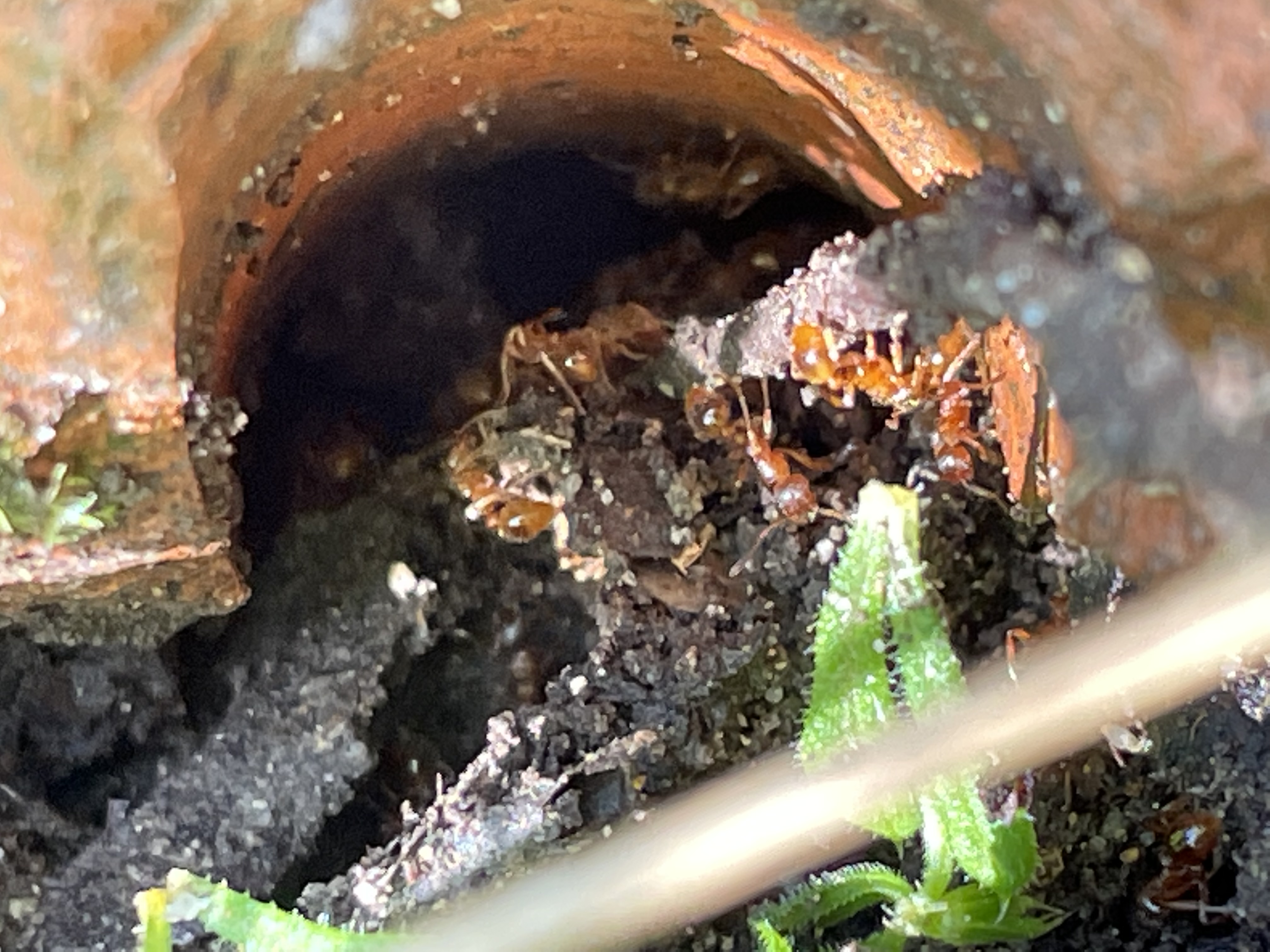 Jetzt hab ich ihnen ne Mischung aus Urwalderde, Seramis und Sand/Lehm rund um ihr Nest gepackt (um den Teil mit der Pflanze). Nach ausführlicher Begutachtung von aussen, vor allem von mittleren Minoren (Statiker? Könnte sein…