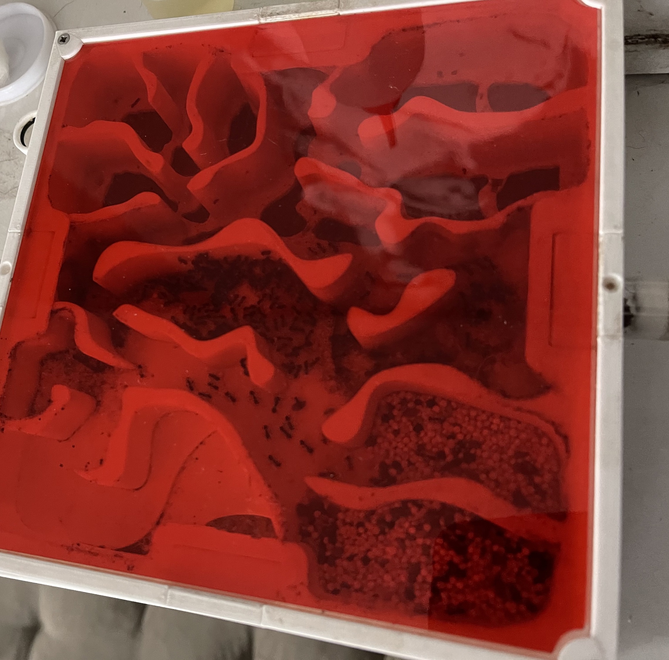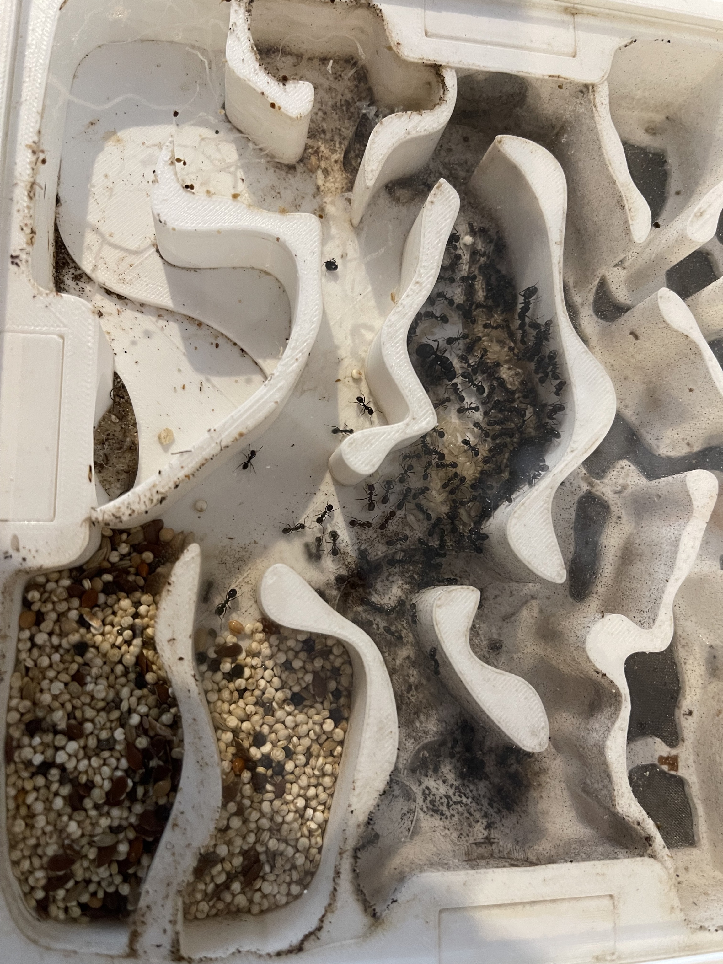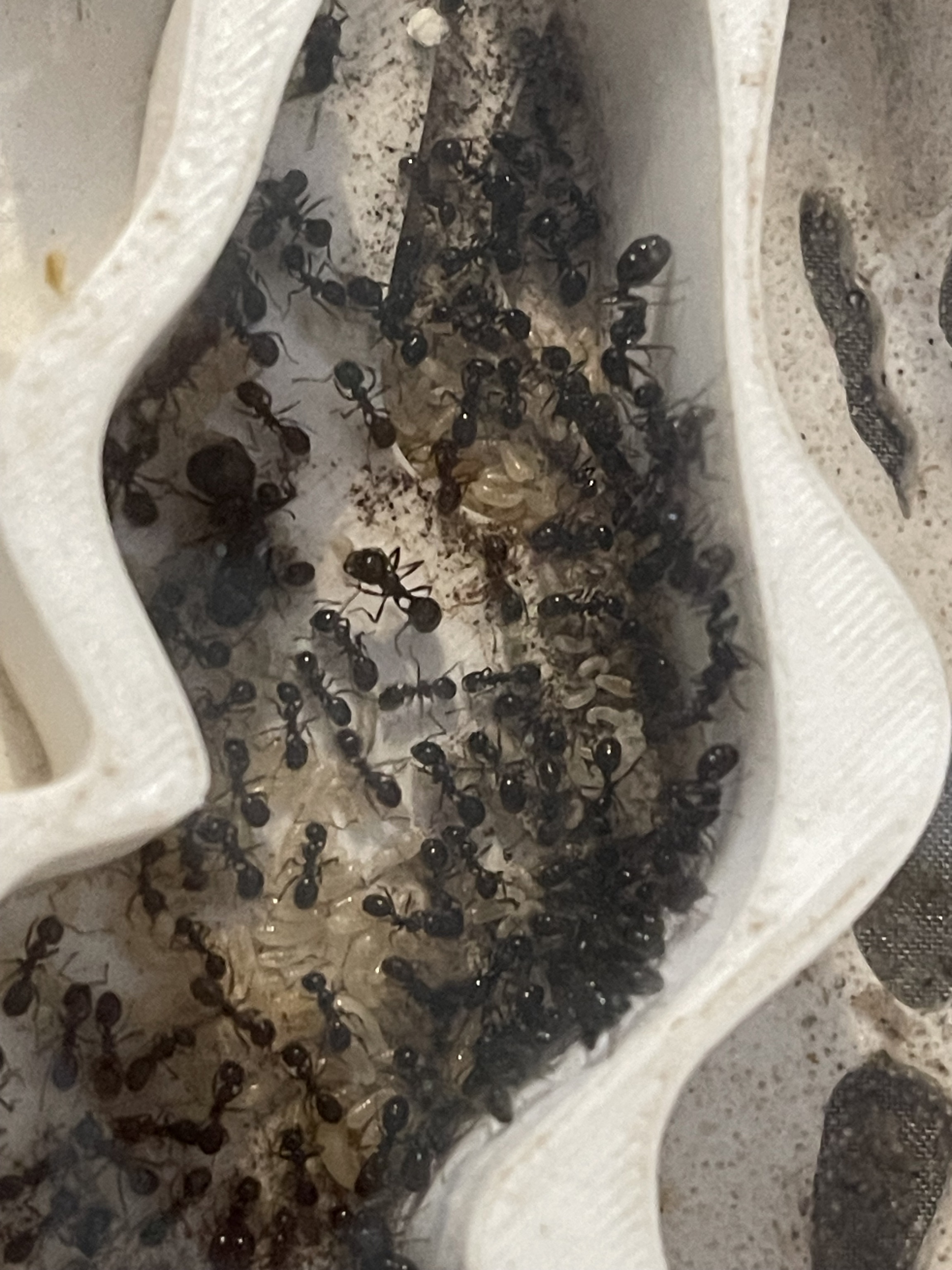 Nach etwa zwei Minuten bemerkte die erste Ameise das Futter, lief etwa fĂŒnf oder sechs mal alleine hin und her, danach liess sich Rekrutierung beobachten. Sie traf am Eingang zwei etwas grössere, die gingen mit und ab da wurden es schnell mehr, sogar zwei kleine Majore machten mit!