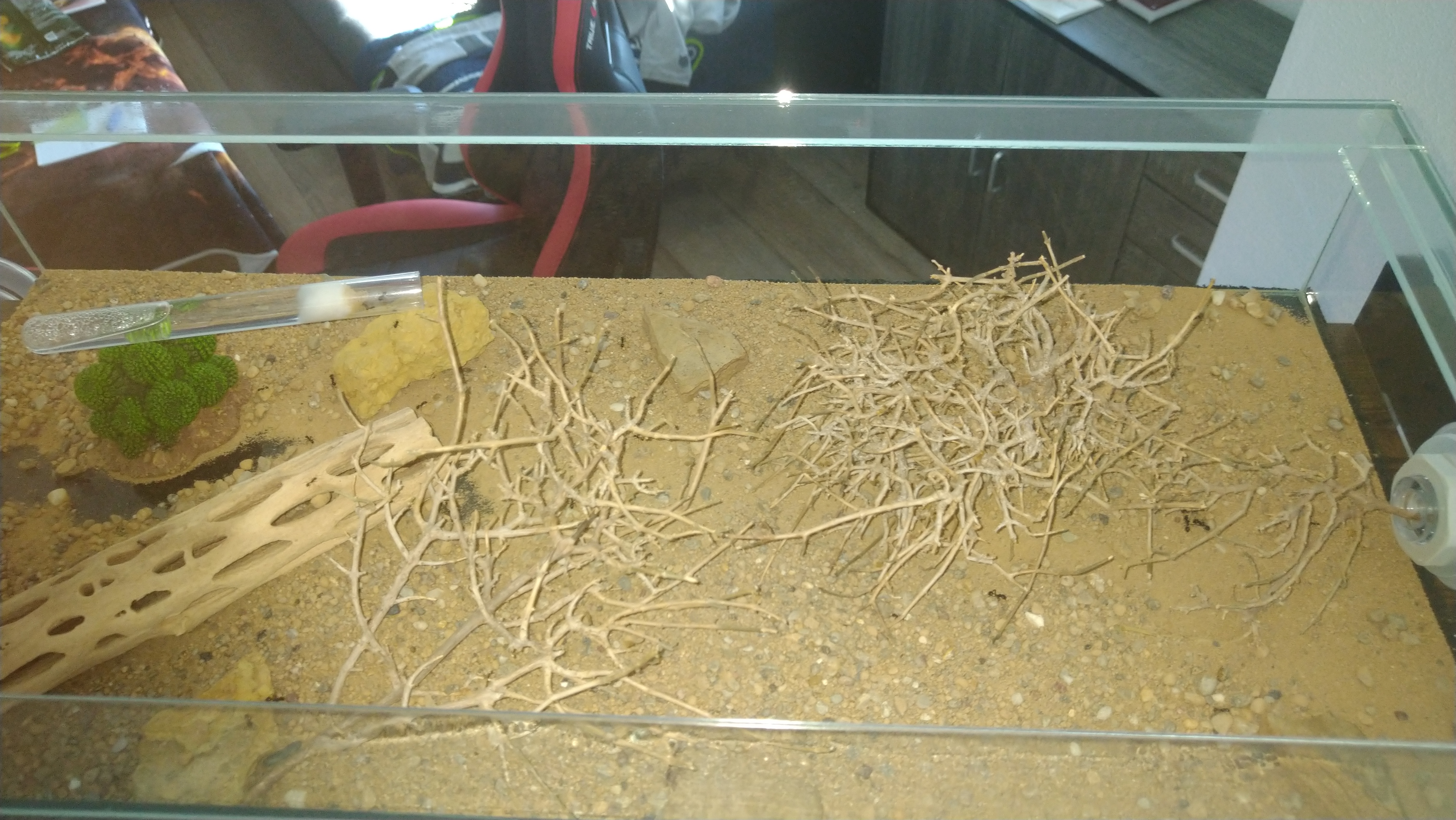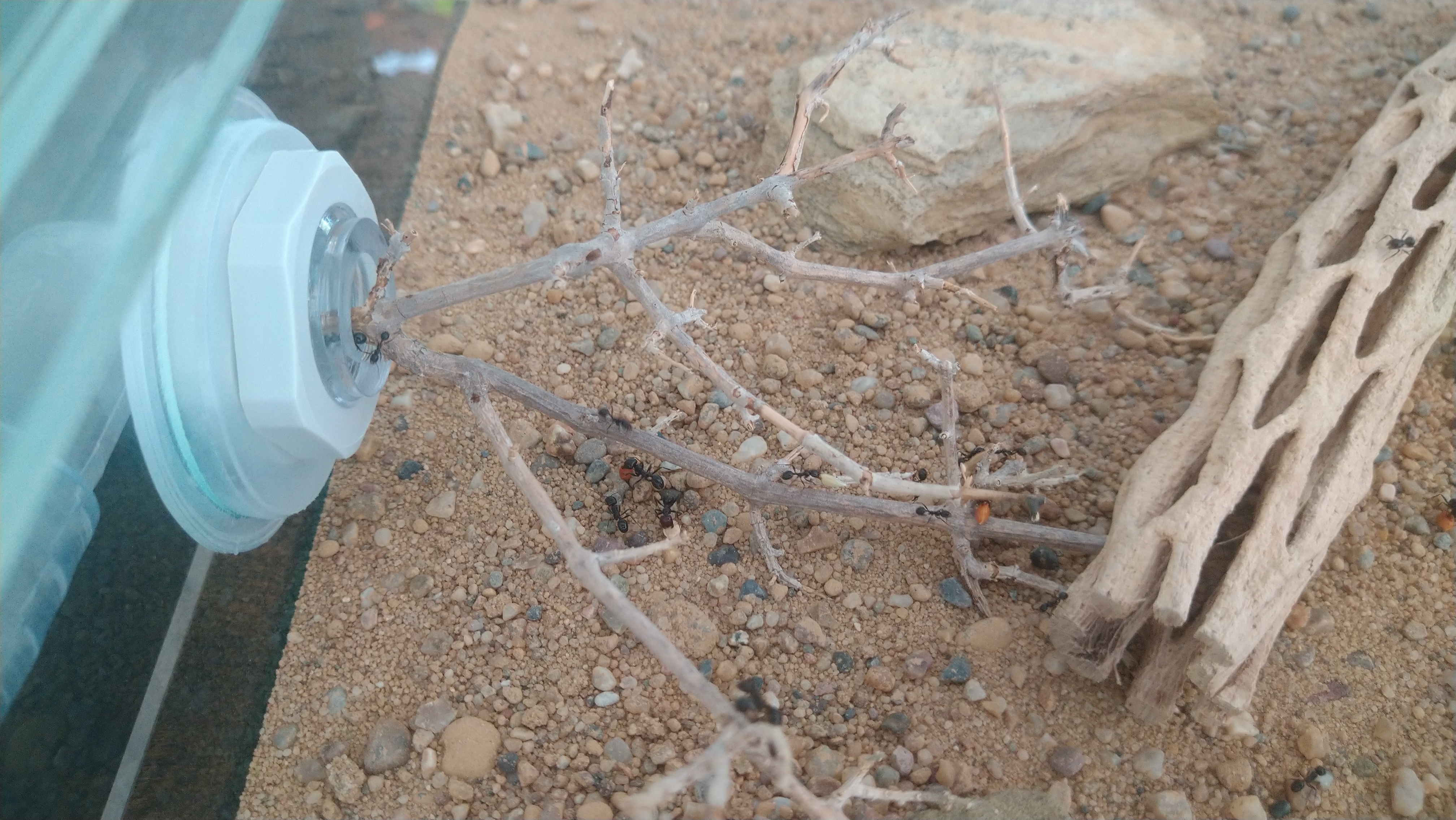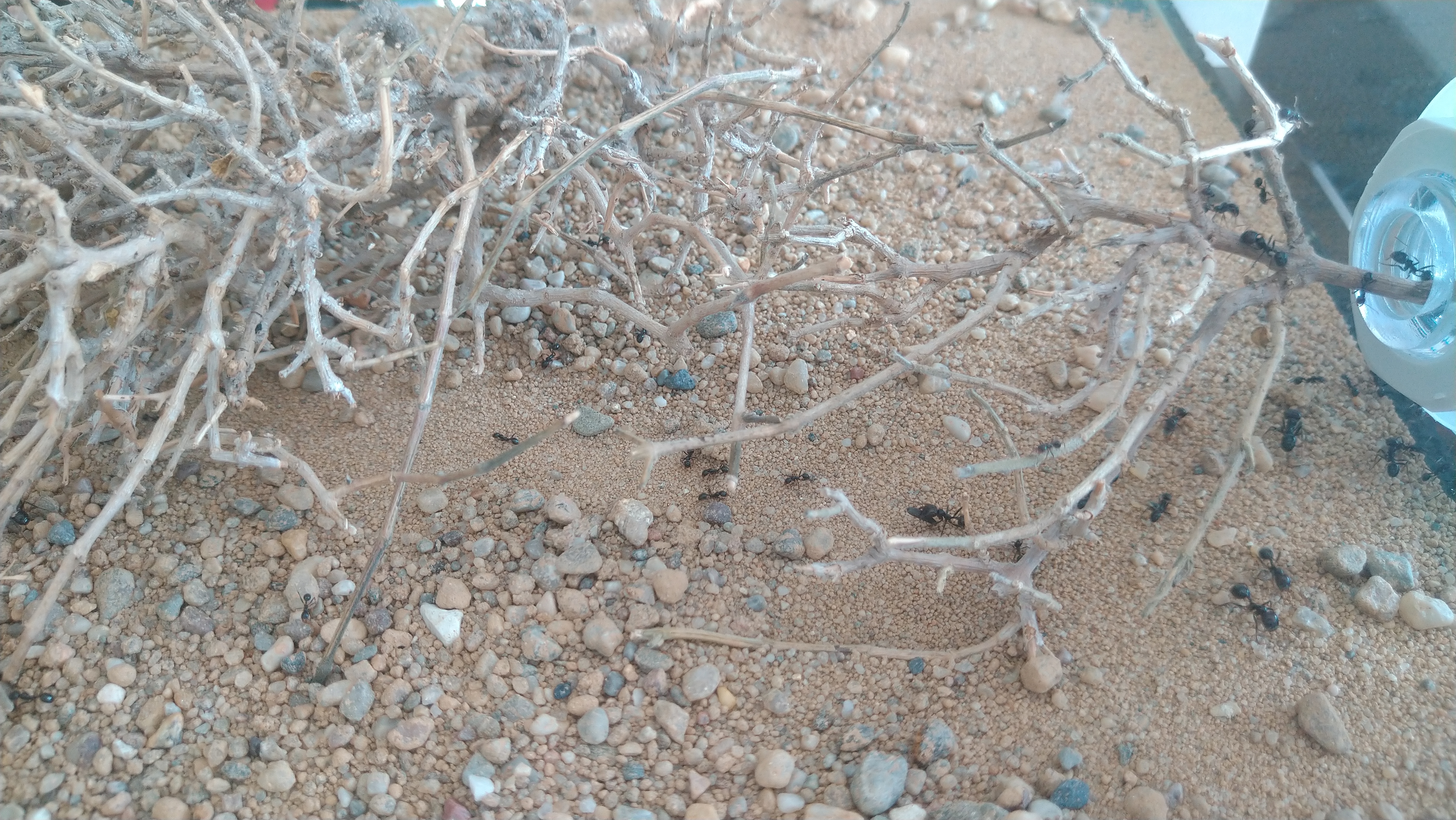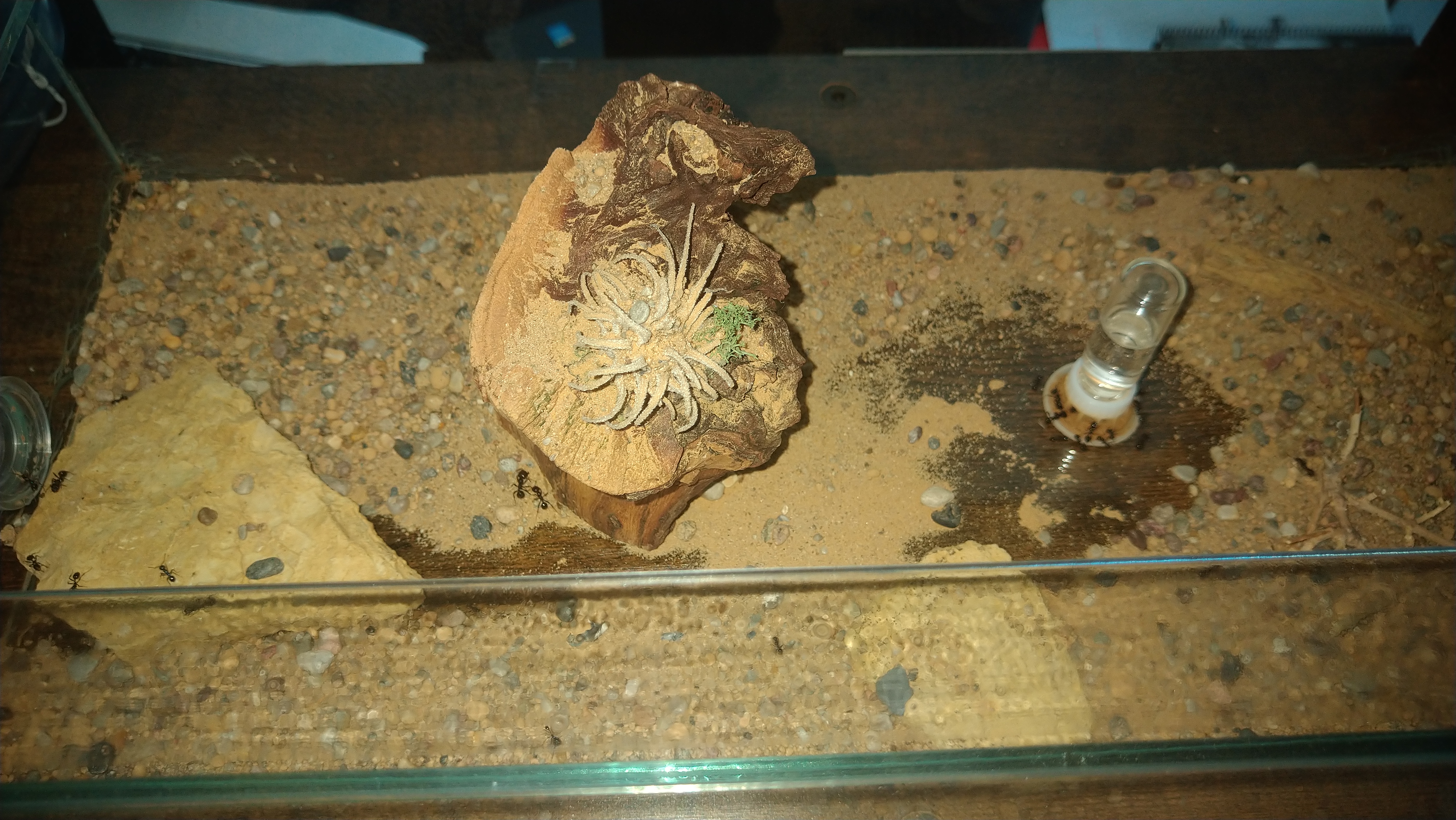 Da die eine Arena oft komplett durchquert werden muss und zur nächsten zu kommen, hat sich hier schon eine Straße gebildet. Erkennt man etwas daran das entweder der Boden Grund komplett abgetragen wurde oder sämtliche größere Steinchen aus dem Weg geräumt wurden. Zu meiner Wurzel Pflanze brauch ich wohl nichts mehr sagen. Unter dem linken Stein am Eingang sitzen immer um die 100Arbeiterinnen. Scheint eine Art Außenposten zu sein. Bei Erschütterung oder wenn ich das Wasser wieder auffülle, rücken die immer sofort aus